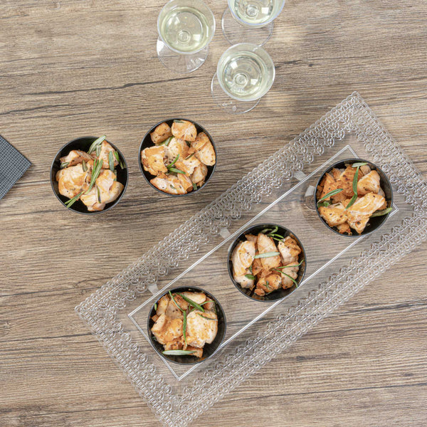 - Black finish beautifully displays appetizers and desserts