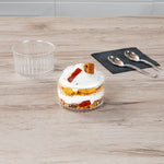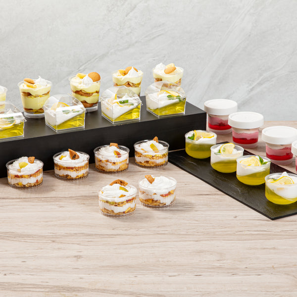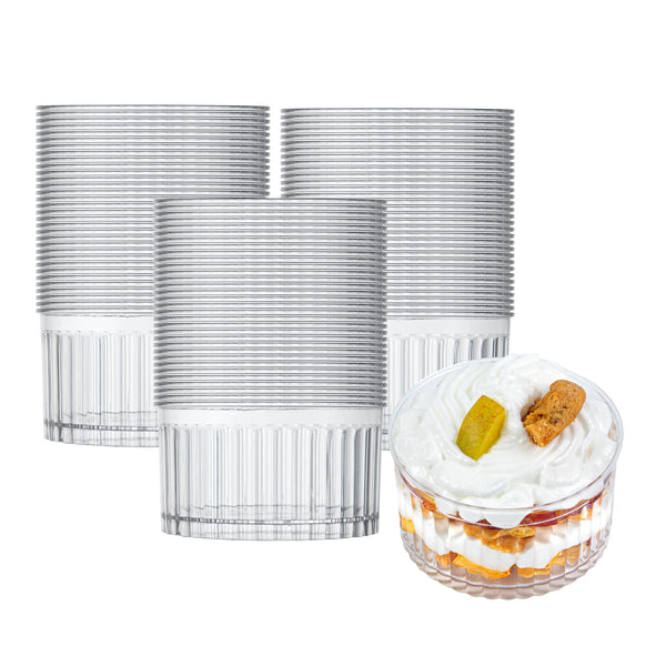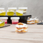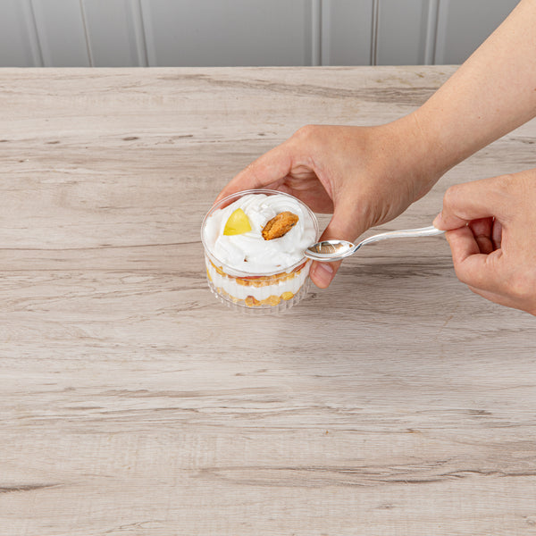 Elevate your dessert presentation with our Mini Serve 4-ounce Round Clear Plastic Dessert Cups. These recyclable plastic dessert cups are constructed from durable PS plastic, ensuring a reliable and sturdy option for serving desserts at your foodservice establishment. With their fluted pattern, these clear dessert cups add an elegant touch, effortlessly enhancing the visual appeal of your sweet treats. These disposable dessert cups are suitable for cold foods and are perfect for serving ice cream, gelato, or fruit salad. The clear finish of these dessert containers allows your customers to easily see the delicious dessert contained within, stimulating their appetites and their desire to indulge. These disposable plastic dessert containers minimize the need for washing and make clean-up a breeze. For added convenience, these plastic dessert glasses are stackable, saving valuable storage space in your kitchen. Pair them with our compatible lids (RWP1417C-25) to ensure the contents are secured in transit. Containing up to 4 ounces, these clear round dessert cups are the perfect size for a satisfying portion of dessert, and measuring 3 inches in diameter by 1.5 inches in height, they are a compact and space-efficient choice. Sold in a 25 count box. Lids are available and sold separately.