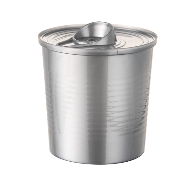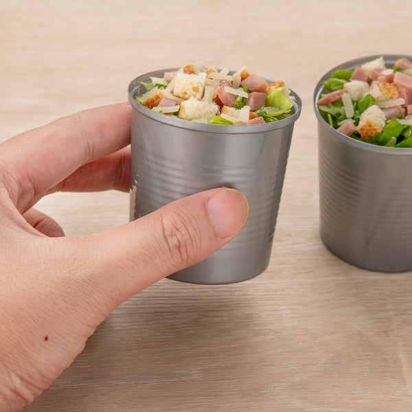 Create memorable appetizer displays using our Mini Serve 4-ounce Round Silver Plastic Tin Cans. Made with premium plastic, these silver tin cans are recyclable, for an easy and quick cleanup after use. These tin canisters are designed with ridges and a round shape to look just like traditional tin cans for a playful twist on appetizers and soups. Featuring a removable lid, these silver tin cans keep fare intact while on the go. These small tin with lids have a silver finish to add an authentic touch to appetizers. To prevent spills and leaks, these silver tin cans are crack-resistant and leak-resistant. Measuring 2.5 inches long by 2.5 inches wide and 2.75 inches tall, these tin canisters hold up to 4 ounces of meals. Sold in a 20 count box.