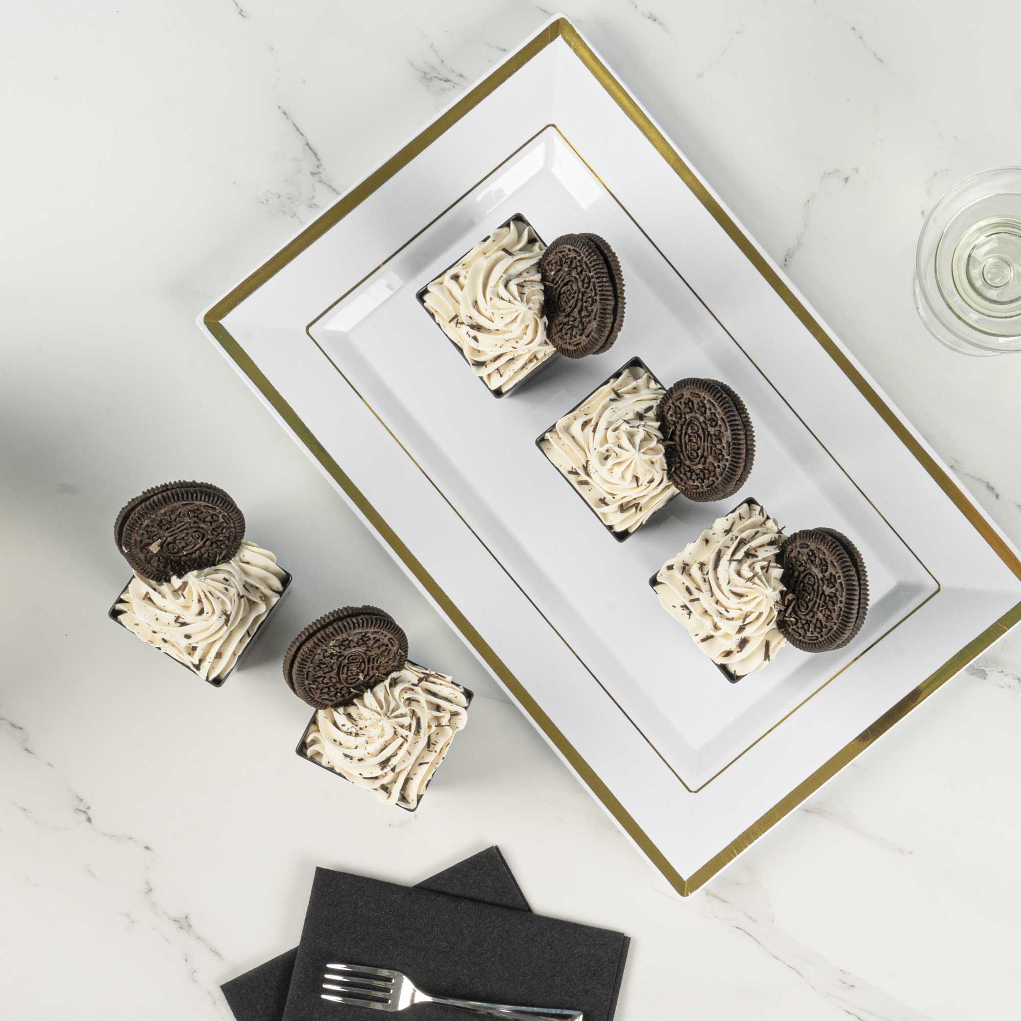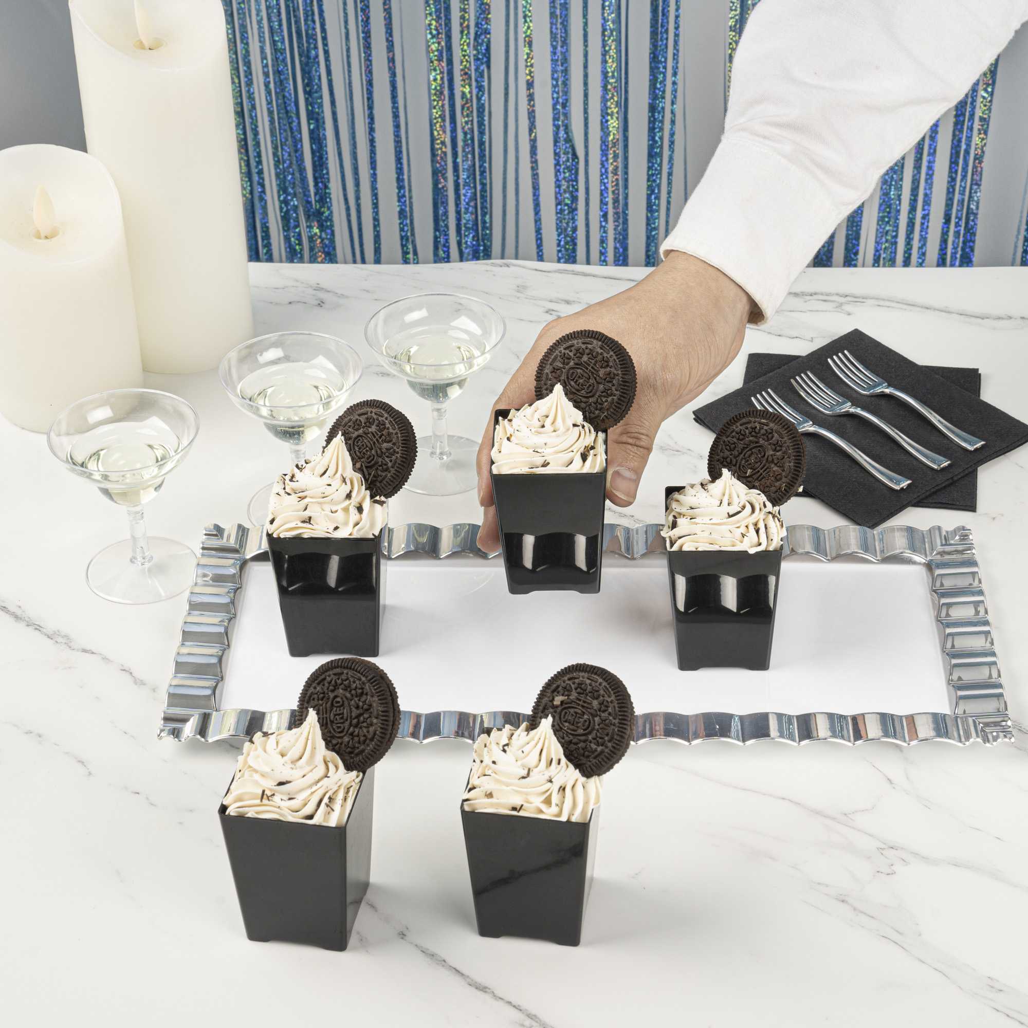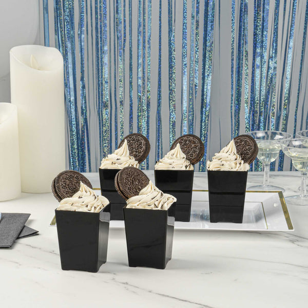 Elevate your presentation with our Mini Serve 4-Ounce Square Black Plastic Tall Quadrato Cups. Made from premium plastic, these black cups are robust, ensuring that they will not crack easily under use. The smooth-rimmed design of these square plastic cups provides an easy eating experience by averting accidental scratches. Plus, the unique, stackable square shape of these tall cups is a practical solution that is space-saving, making them a perfect choice for large-scale events. The bold black color of these appetizer cups adds a sophisticated aesthetic, enhancing the appeal for any occasion. With a capacity of 4 ounces, these disposable snack cups are perfect for serving petite appetizers, desserts, or beverages. These recyclable quadrato cups are single-use and disposable, simplifying post-event cleanups. Measuring 2 inches in length by 2.75 inches in width by 2 inches in height, these plastic appetizer cups are adept at serving bite-sized offerings. Sold in a 100 count box.