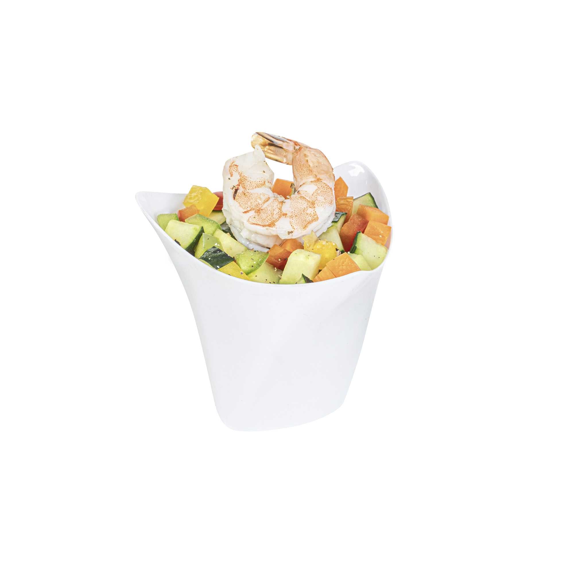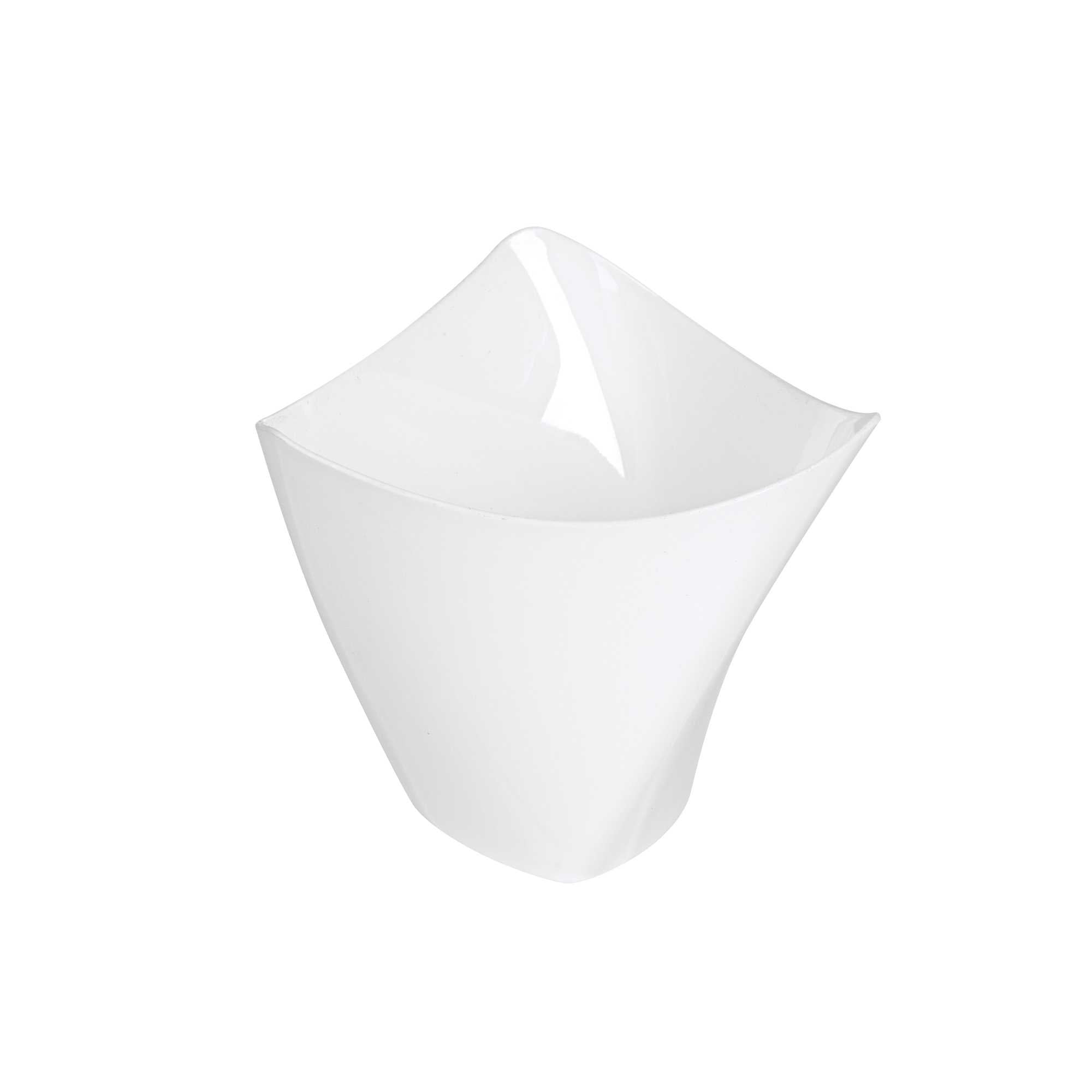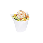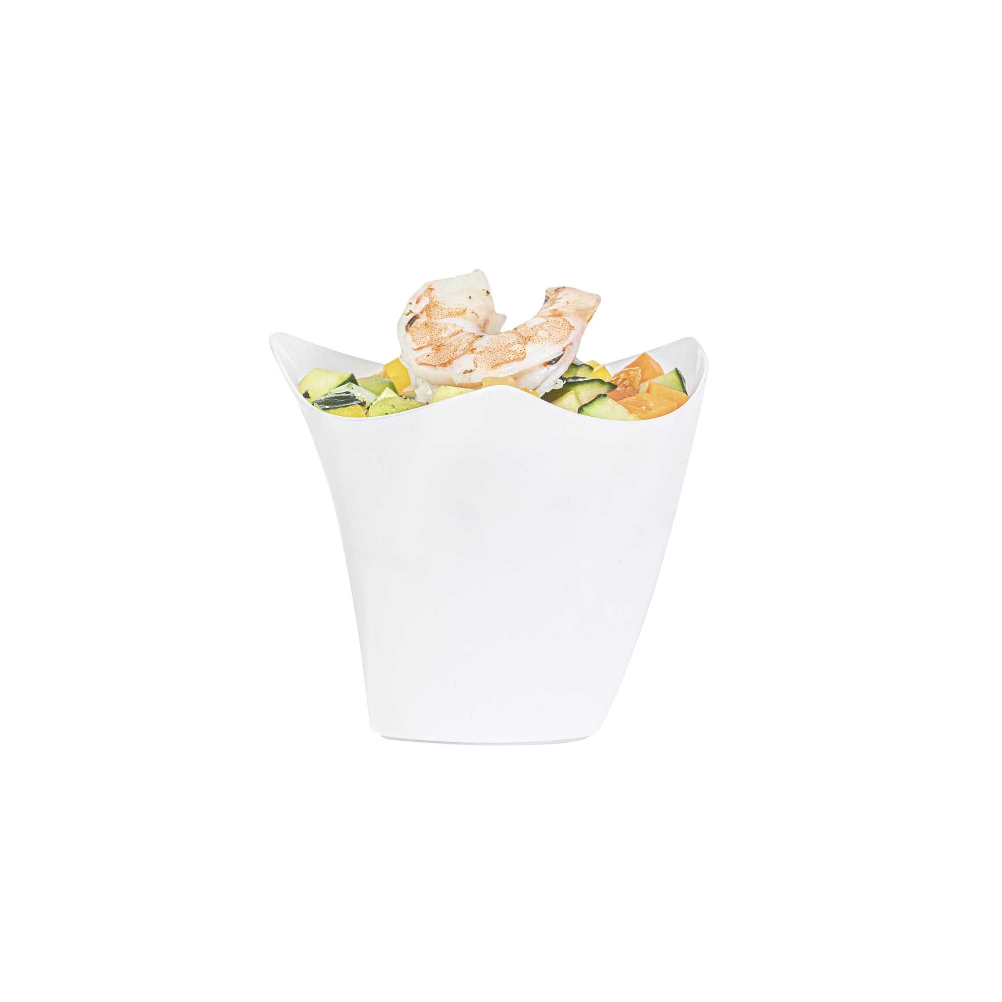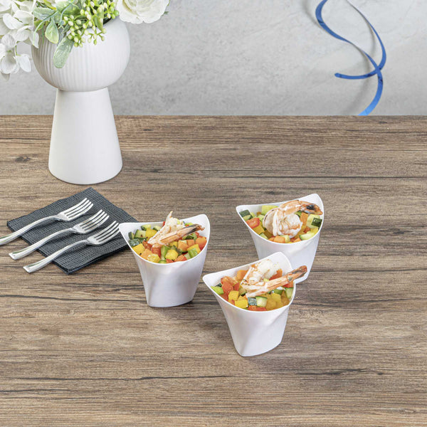 Serve miniature desserts and tasting portions in style with our Mini Serve 4-ounce White Plastic Mini Crescendo Cups. Featuring a unique and geometric-inspired design, these small plastic dessert cups are sure to add a touch of sophistication to any occasion. The polished white finish of these plastic cups creates a striking backdrop for your bite-sized treats, while their sleek triangular rim adds the perfect finishing touch to your presentation. Constructed from high-quality plastic, these mini parfait cups are conveniently disposable and recyclable for quick and easy cleanup. Ideal for serving miniature chocolate mousses, fruit parfaits, or ceviches, these small dessert cups measure 3 inches in diameter by 2.75 inches in height and have a total capacity of 4 ounces. Sold in a 100 count box.