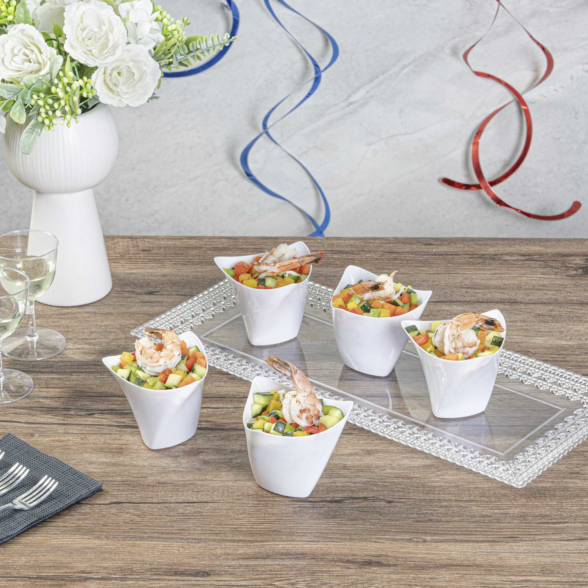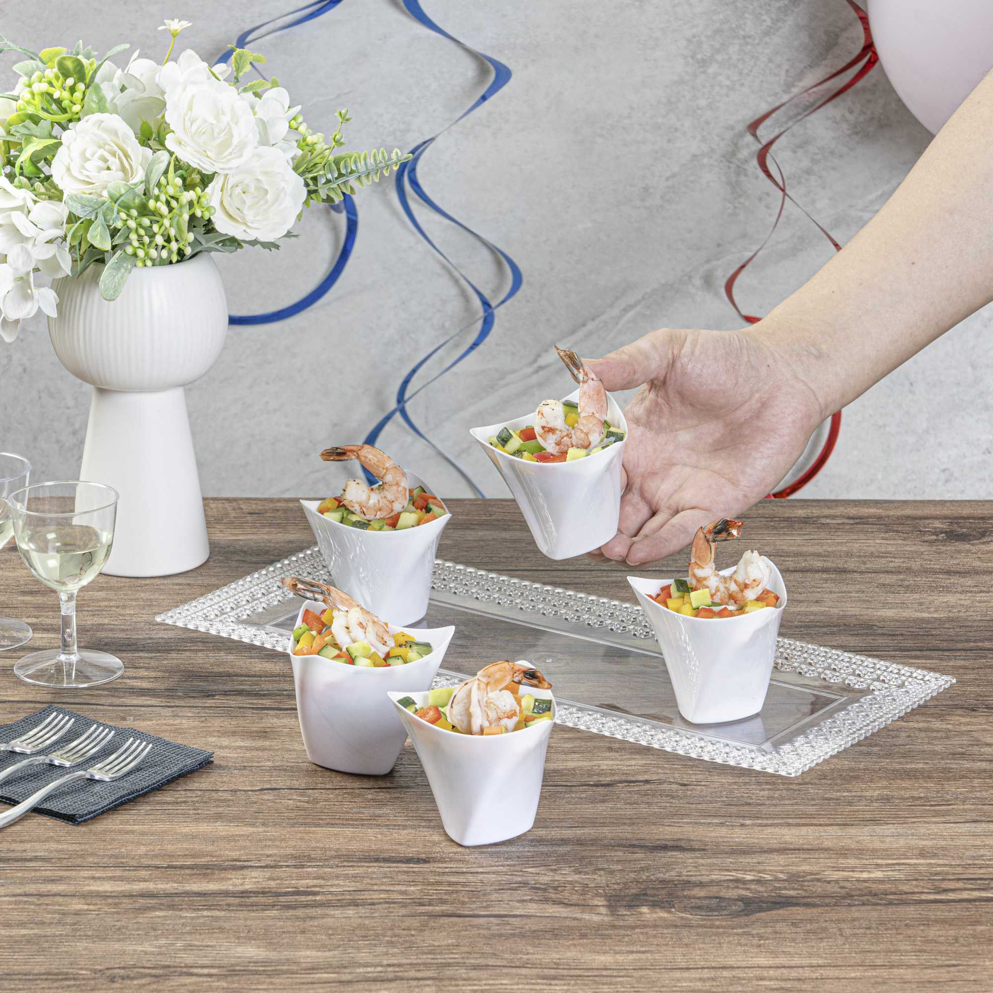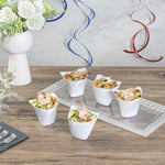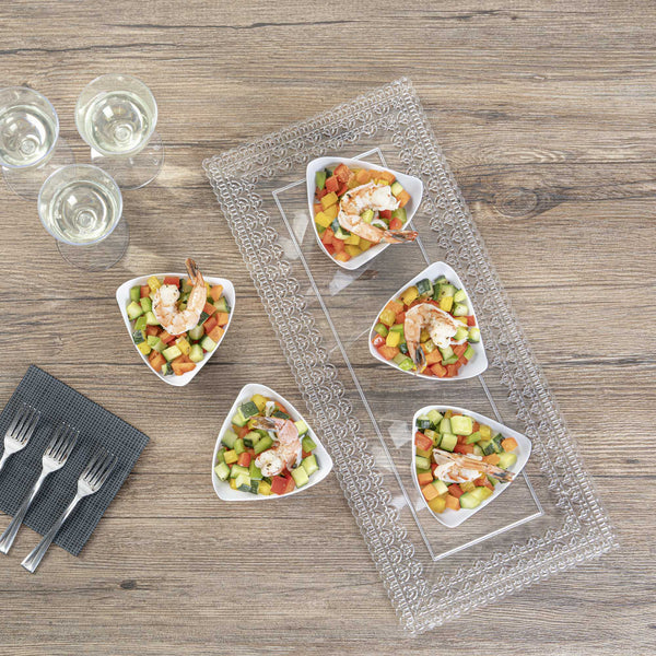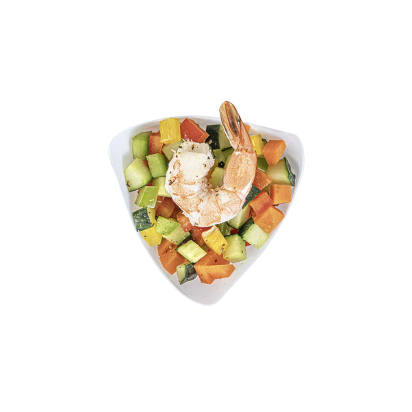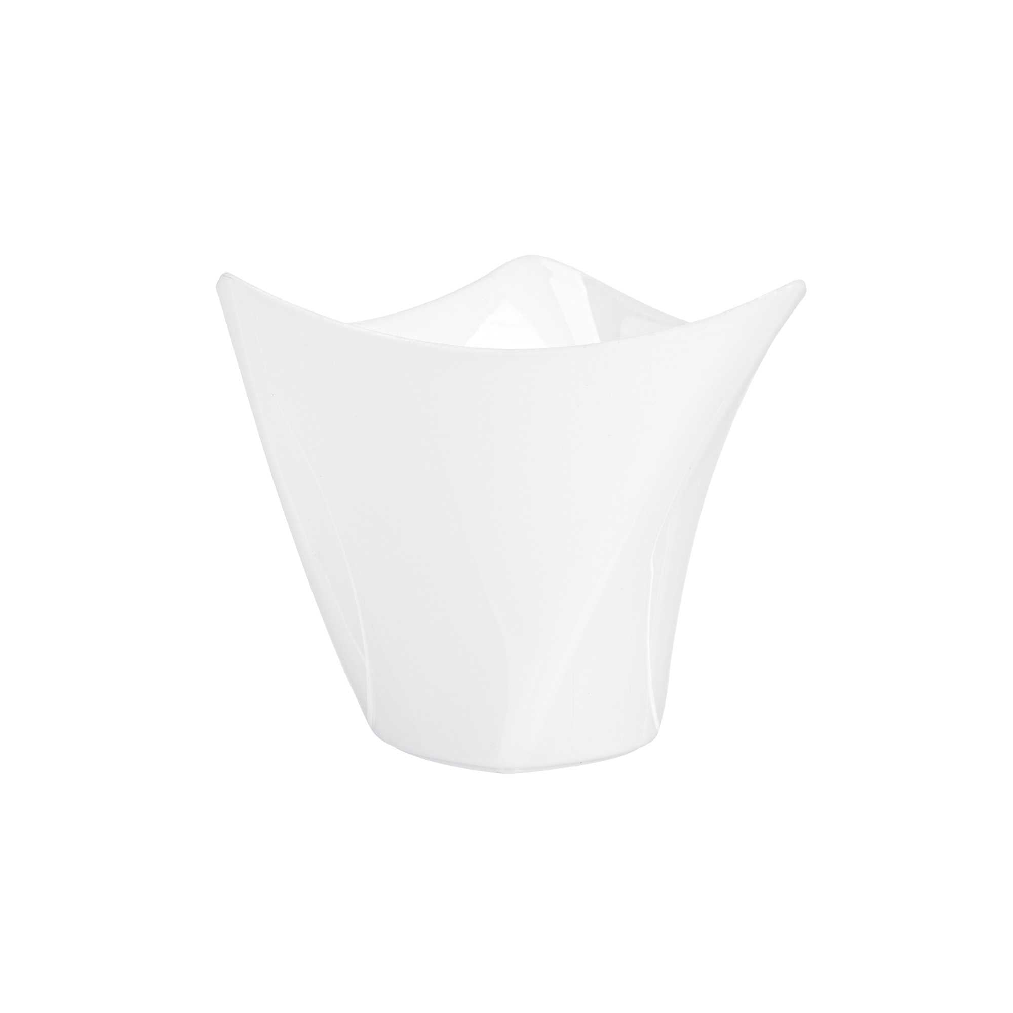 Serve miniature desserts and tasting portions in style with our Mini Serve 4-ounce White Plastic Mini Crescendo Cups. Featuring a unique and geometric-inspired design, these small plastic dessert cups are sure to add a touch of sophistication to any occasion. The polished white finish of these plastic cups creates a striking backdrop for your bite-sized treats, while their sleek triangular rim adds the perfect finishing touch to your presentation. Constructed from high-quality plastic, these mini parfait cups are conveniently disposable and recyclable for quick and easy cleanup. Ideal for serving miniature chocolate mousses, fruit parfaits, or ceviches, these small dessert cups measure 3 inches in diameter by 2.75 inches in height and have a total capacity of 4 ounces. Sold in a 100 count box.