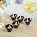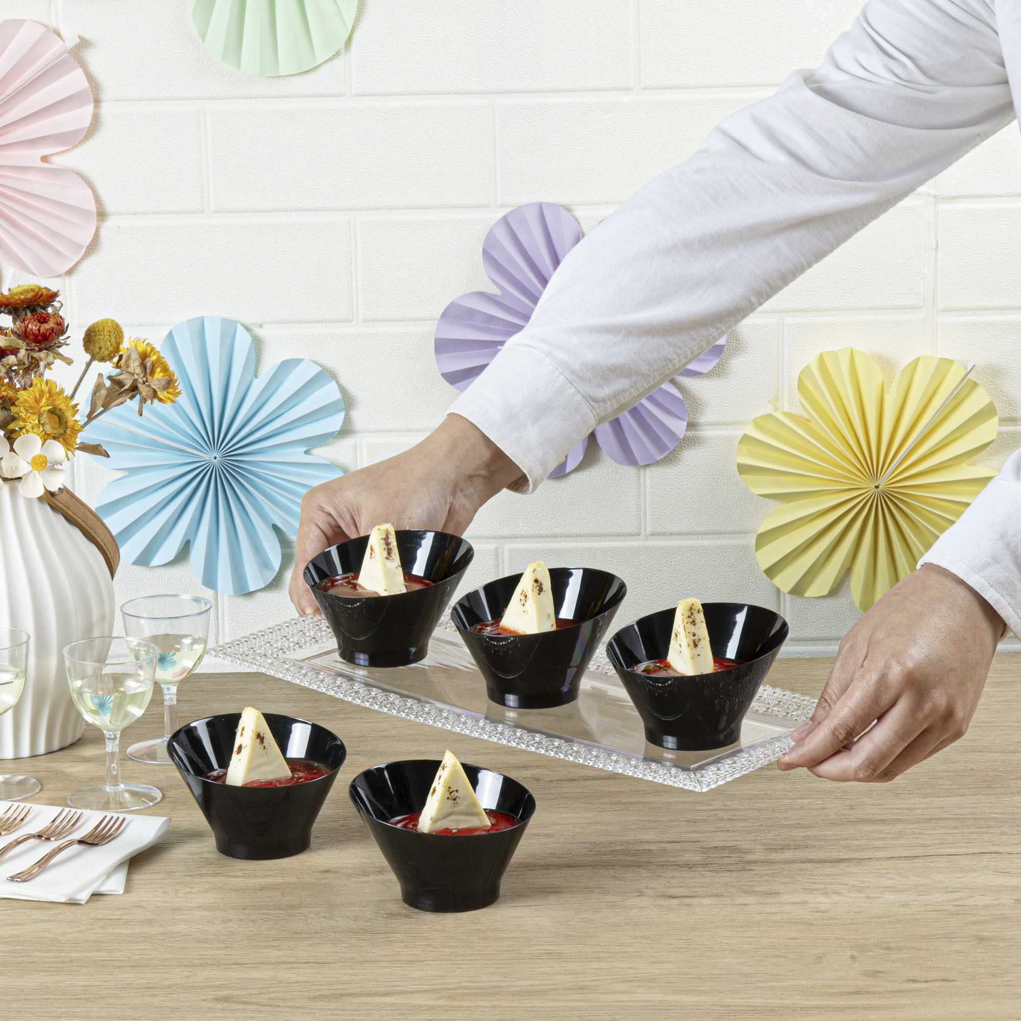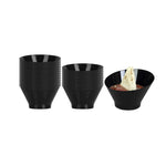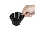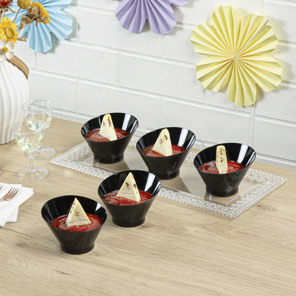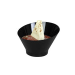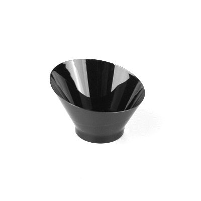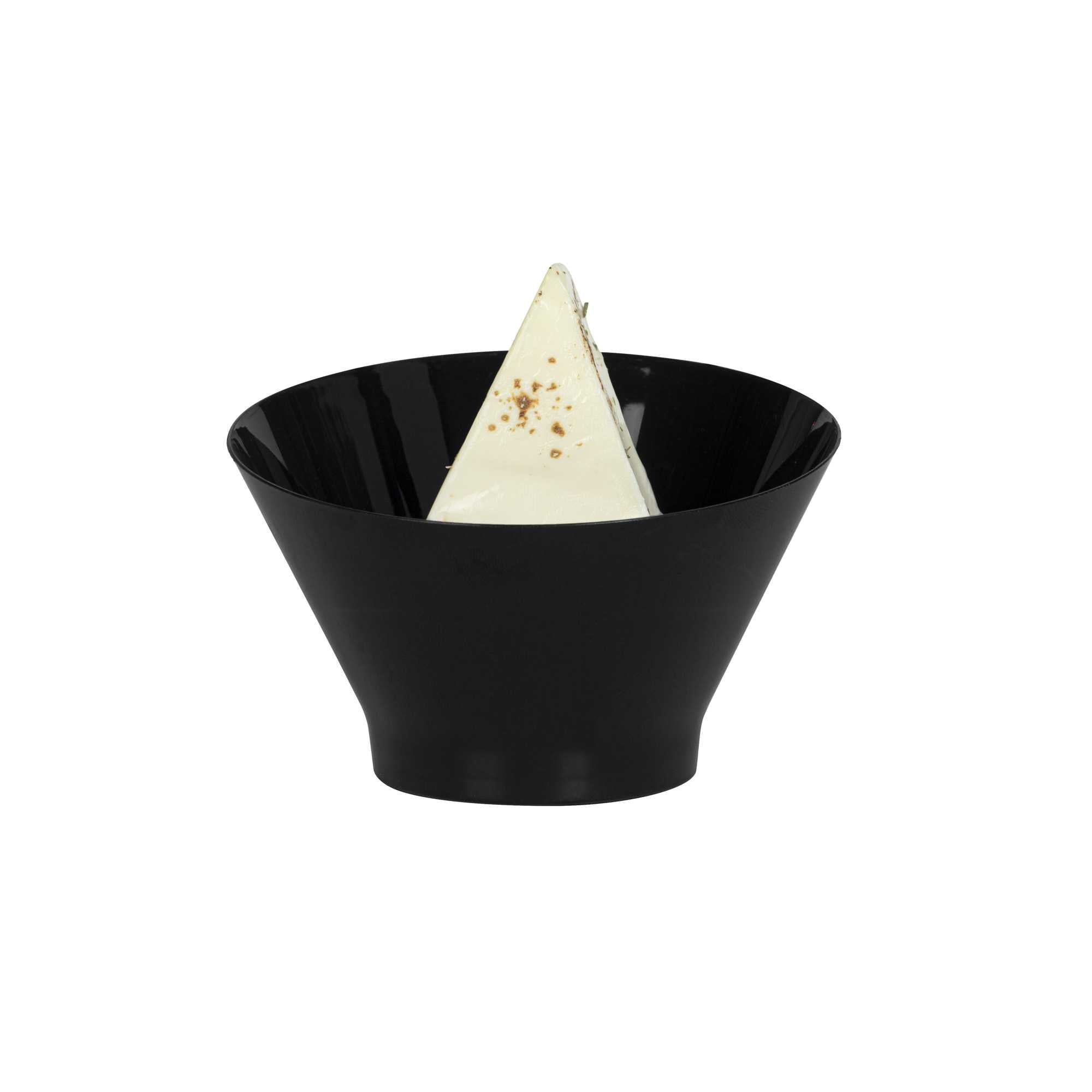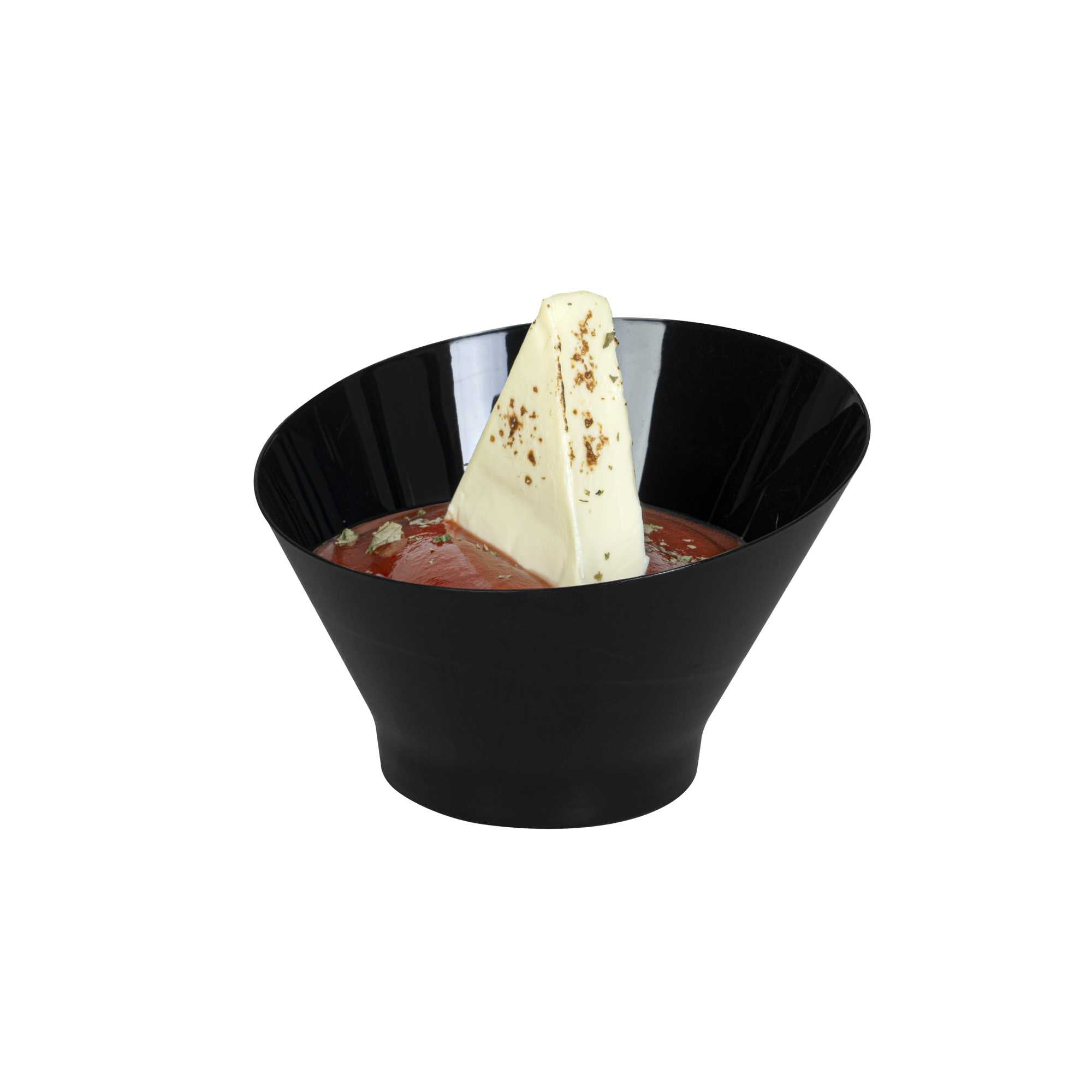 Elegantly display soups and appetizers using our Mini Serve 5-ounce Round Black Plastic Small Incline Bowls. Made with high-quality plastic, these disposable bowls can be easily recycled after use to meet the eco-friendly standards of your foodservice establishment. Designed with a stylish incline shape and glossy black finish, these incline bowls add a sophisticated touch to appetizer and dessert tables. Featuring a sturdy base, these black plastic bowls provide superior stability on surfaces to prevent spills. Perfect for restaurants or catered events, these disposable bowls have a crack-resistant and leak-resistant construction to avoid messes while serving. Measuring 3.75 inches in width by 2.5 inches in height, these disposable bowls hold up to 5 ounces. Shipped in a 100 count box.