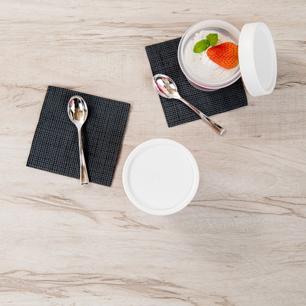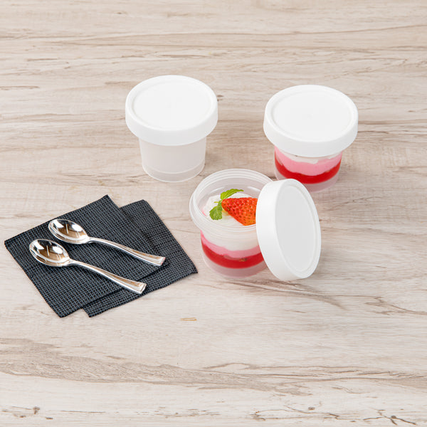 Present your desserts elegantly with our Mini Serve 5-ounce Round Clear Plastic Dessert Cups. Crafted from BPA-free PP plastic, these clear dessert cups are designed to withstand hot and cold foods, making them a versatile option for any catered event or restaurant. With the added convenience of being microwavable, these recyclable plastic dessert cups allow for quick and easy heating of your delectable treats. Each disposable plastic cup boasts a clear finish, showcasing the layers and colors of your desserts and enhancing the overall presentation. These dessert cups with lids provide a secure covering, minimizing any unwanted spills or messes. The stackable design of these clear dessert cups makes storage a breeze, saving you valuable kitchen space. These plastic dessert glasses are disposable for quick cleanup, an efficient solution for food service establishments aiming for a balance of style and function. Measuring 3 inches in diameter by 2.6 inches in height, these clear recyclable plastic dessert cups are compact yet provide ample space with a 5-ounce capacity, perfectly portioning your desserts while maintaining a sophisticated aesthetic. Sold in a 100 count box.