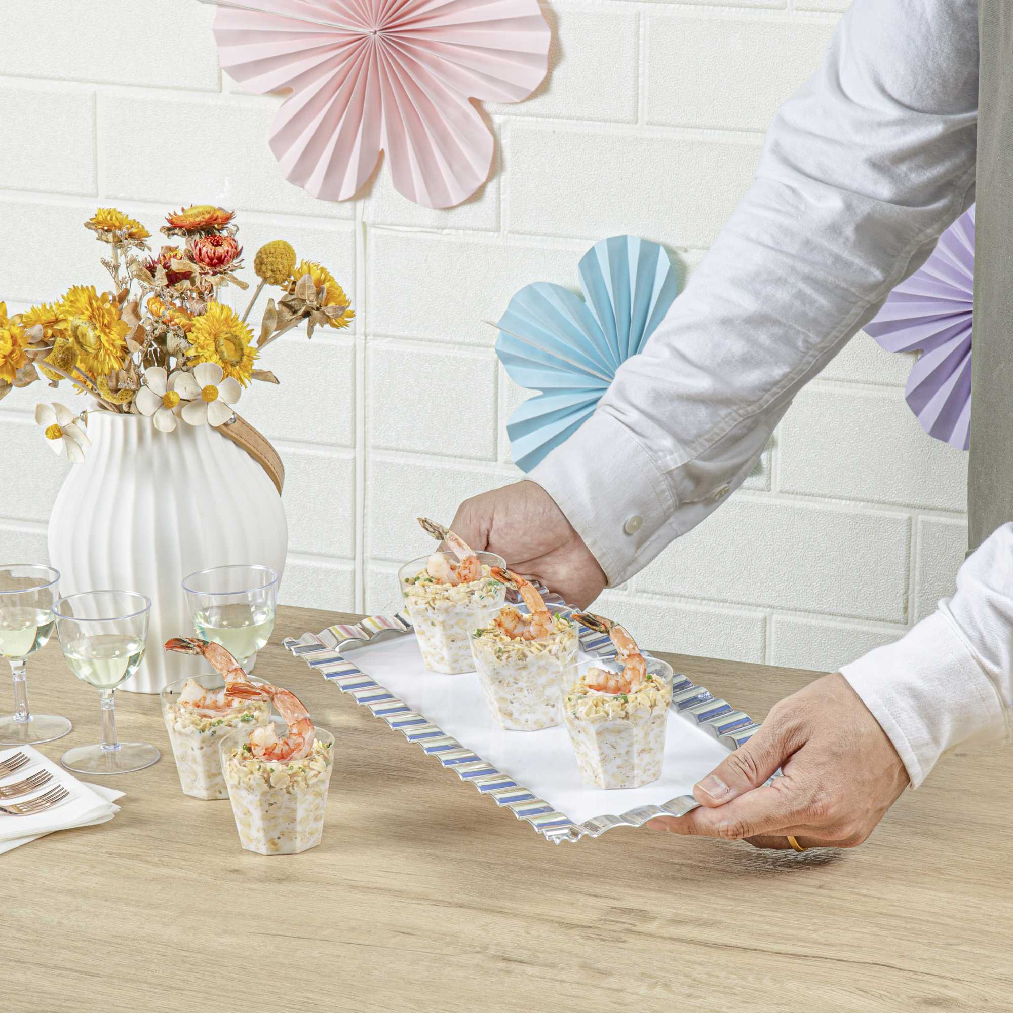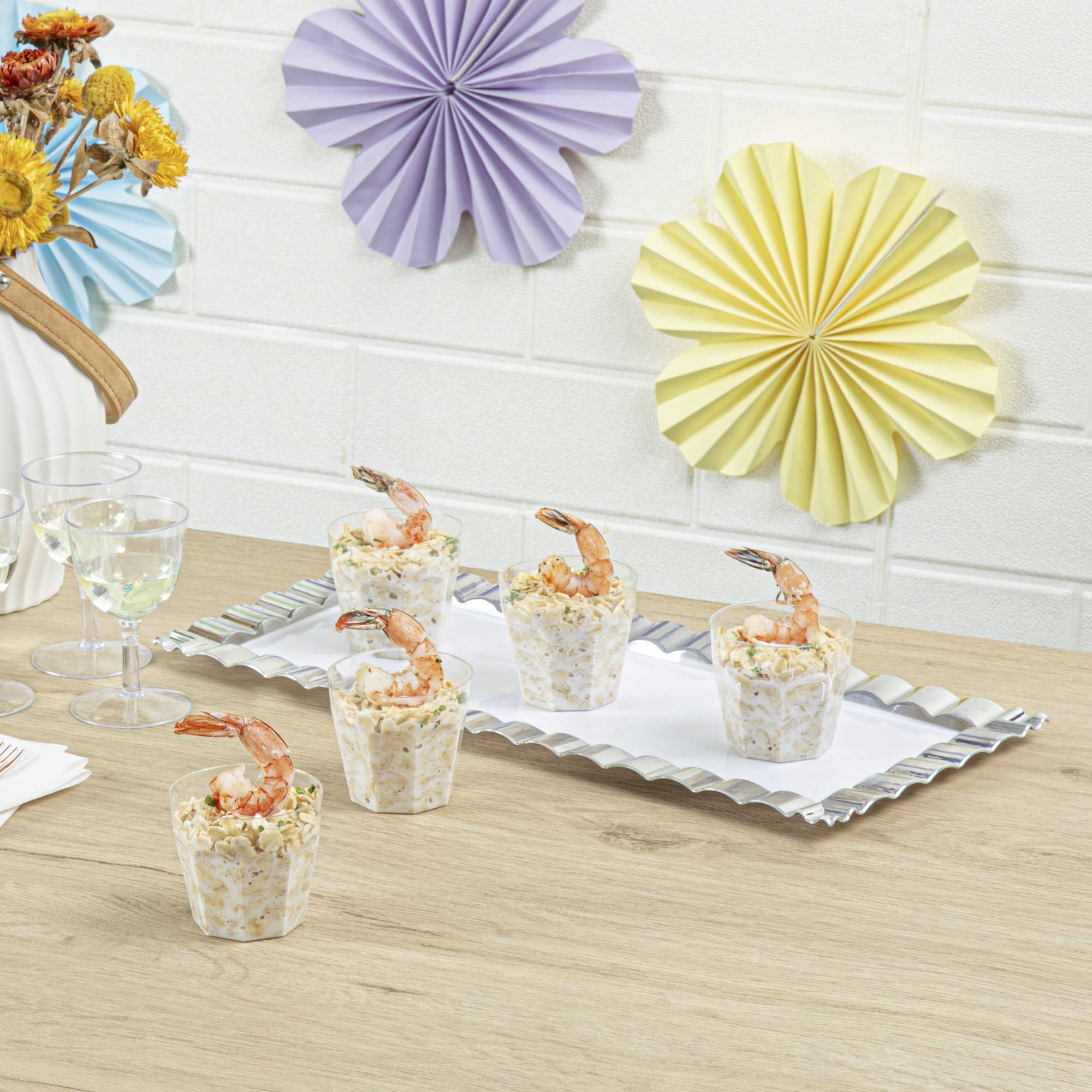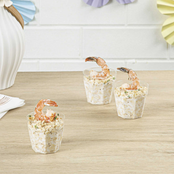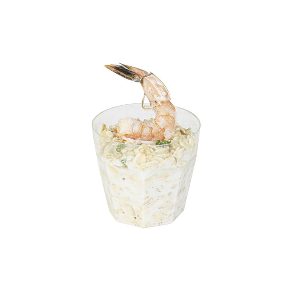 Captivate your guests with unique food presentations in our Mini Serve 5-ounce Round Clear Plastic Mini Pilsner Cups. With a premium plastic construction, these mini appetizer cups are recyclable, providing quick and easy cleanup at your restaurant, buffet, or catering event. Featuring a charming straight-paneled design, these disposable dessert cups effortlessly enhance the decor at any venue. Use these clear mini appetizer cups to beautifully present scrumptious s'mores in a cup at your dessert buffet or stylishly serve delectable tiramisu at your catering event. Containing up to 5 ounces, these small dessert cups measure 2.75 inches in diameter by 2.5 inches in height. Shipped in a 100 count box.