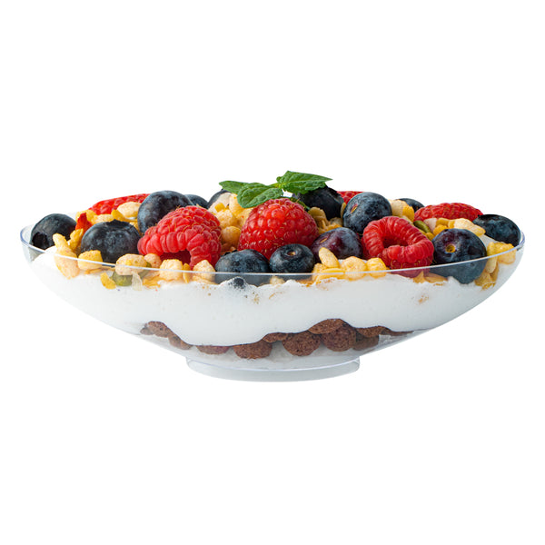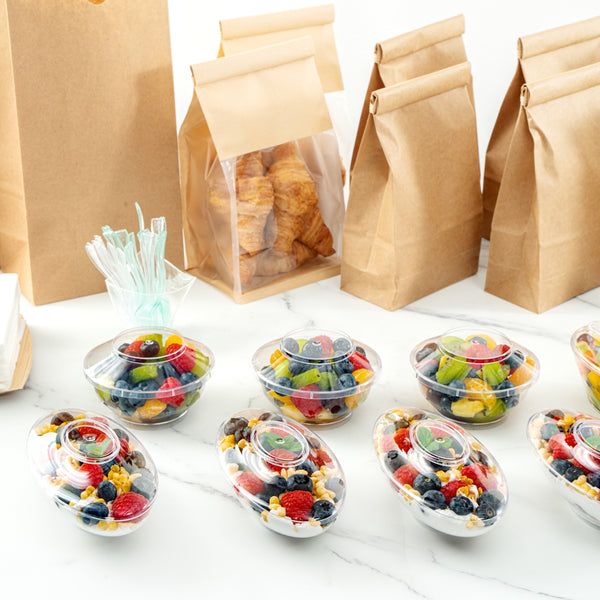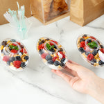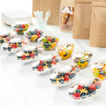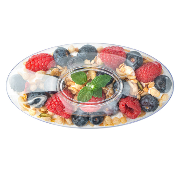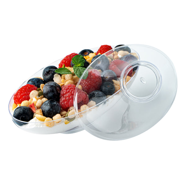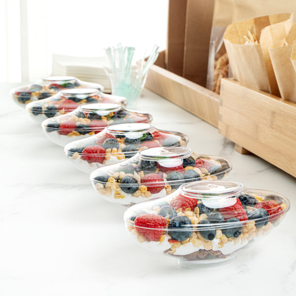 Show off vibrant smoothie bowls and salads using our Mini Serve 6-ounce Oval Clear Plastic Deli Cups. Built with high-quality plastic, these plastic deli cups have a clear finish that expertly displays dishes. These oval containers are designed to be durable and crack-resistant so customers can safely enjoy meals on the go. To prevent spills, these clear deli containers include tight-fitting lids that securely snap onto cups. With a stackable design, these plastic deli cups are ideal for saving space in your kitchen. For eco-friendly disposal after use, these oval containers are conveniently recyclable. These clear deli containers can hold up to 6 ounces and measure 5.5 inches in length by 3.25 inches in width and 2.5 inches in height. Shipped in a 100 count box.