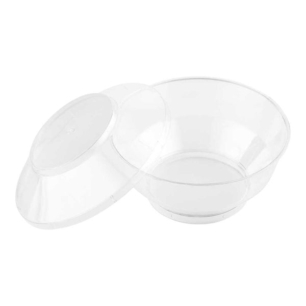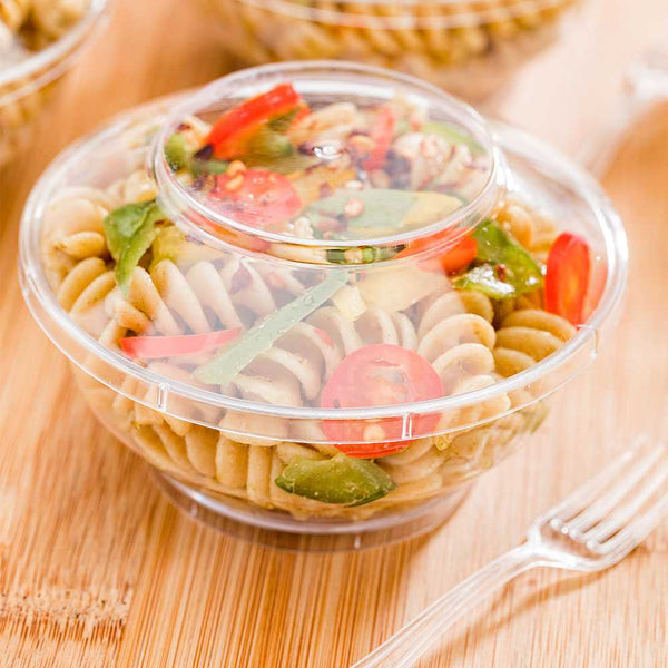 Pack, store, or serve foods using our Mini Serve 6-ounce Round Clear Plastic Large Deli Cups. With a clear finish, these plastic containers effortlessly show off colorful salads and acai bowls. The included lids expertly snap onto these deli cups to keep messes to a minimum. Crafted from premium plastic, these food containers with lids are crack-resistant to keep meals intact during delivery. Great for fast-paced cafes and bakeries, these plastic containers are stackable to streamline prep time and save storage in your kitchen. For an eco-friendly disposal after use, these food containers with lids are conveniently disposable. Measuring 4 inches in length by 3 inches in width and 4 inches in height, these deli cups can hold up to 6 ounces of fare. Sold in a 100 count box.