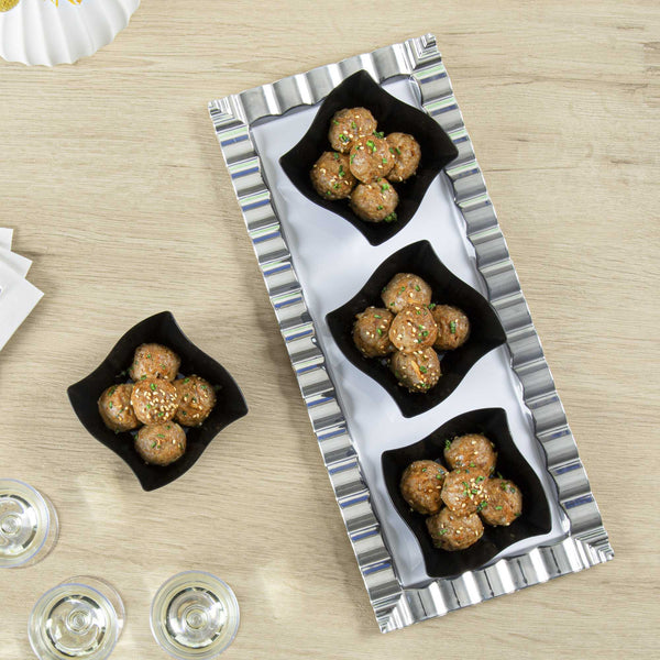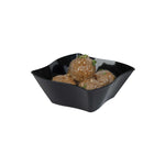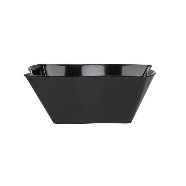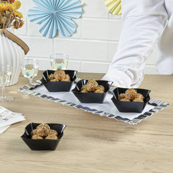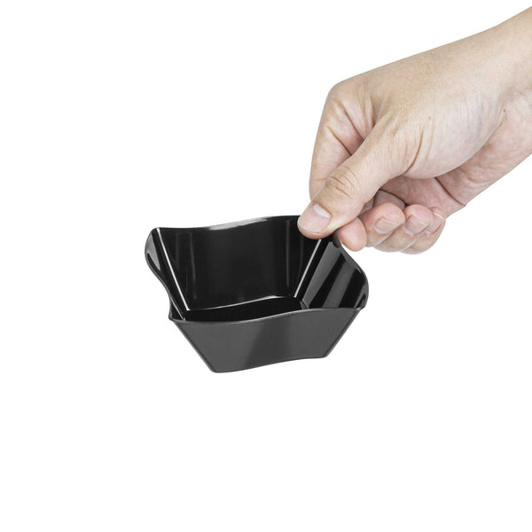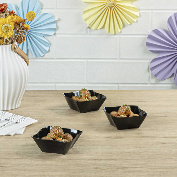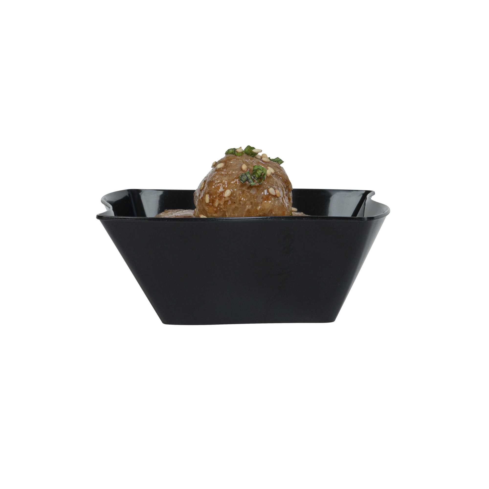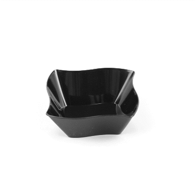 Serve hors d'oeuvres and miniature desserts in style with our Mini Serve 6-ounce Square Black Plastic Aqua Bowls. Featuring a sleek black finish and a contemporary curved design, these small plastic bowls are ideal for buffets, banquets, and other catering events. These modern black bowls feature a strong and sturdy plastic construction that is conveniently disposable. Designed with 1.4-inch raised edges, these mini plastic bowls are an excellent serving solution for saucier appetizers, salads, and desserts. Use these black disposable dessert bowls to serve individual portions of a decadent chocolate tart, or as a mess-free way to serve a garlicky seafood risotto. Each of these plastic bowls can contain up to 6 ounces of your favorite snacks, sides, or sweets and measure 3.25 inches in length by 3.25 inches in width by 1.5 inches in height. Sold in a 100 count box.