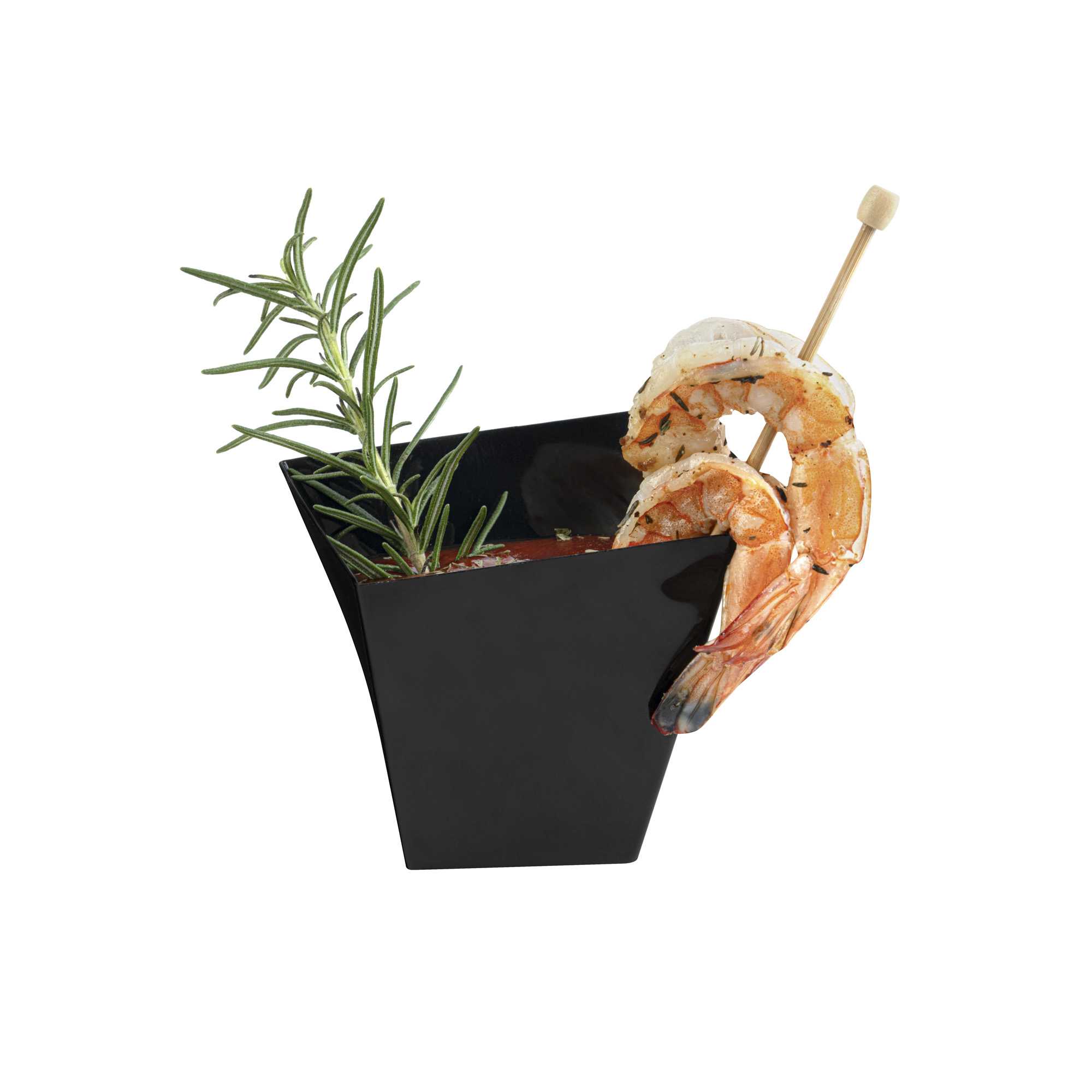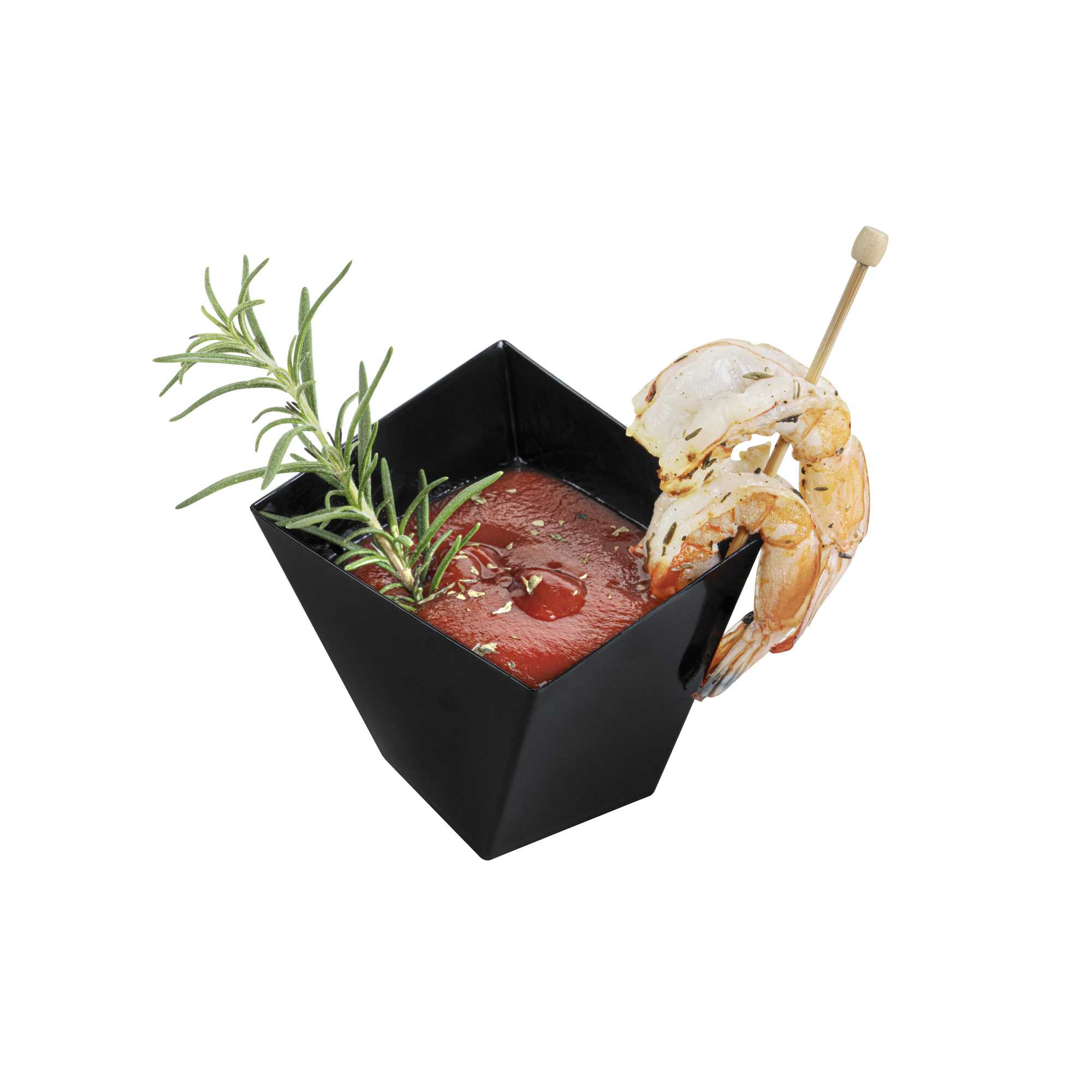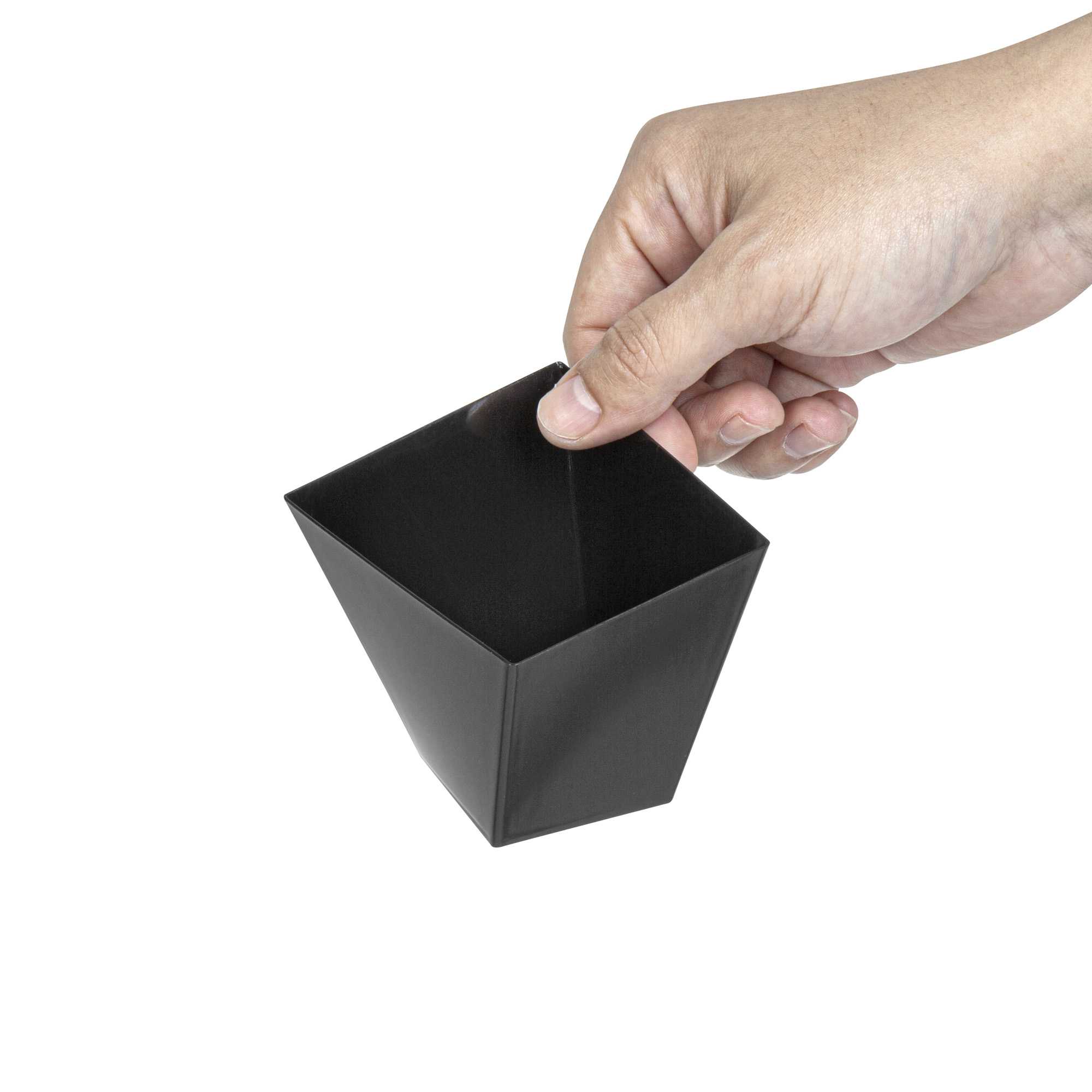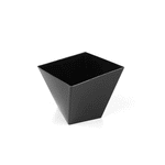 Serve small portions of your favorite appetizers, salads, entrees, and desserts in style with our Mini Serve 6-ounce Square Black Plastic Large Girata Dishes. These square plastic dessert cups feature a geometric-inspired design with crisp corners and clean lines to instantly elevate the presentation of your dishes. Constructed with premium quality plastic, these disposable appetizer cups won't chip or break during use. The premium construction of these plastic snack cups reduces your business’s carbon footprint. These disposable snack bowls make cleaning after events super easy. The black finish of these disposable snack bowls makes your food presentation look sophisticated. These disposable plastic food bowls measure 3.25 inches in length by 2.75 inches in width by 3 inches in height and hold up to 6 ounce. Sold in a 100 count box.