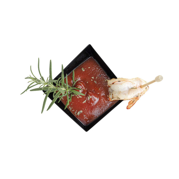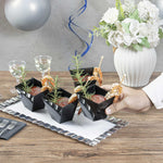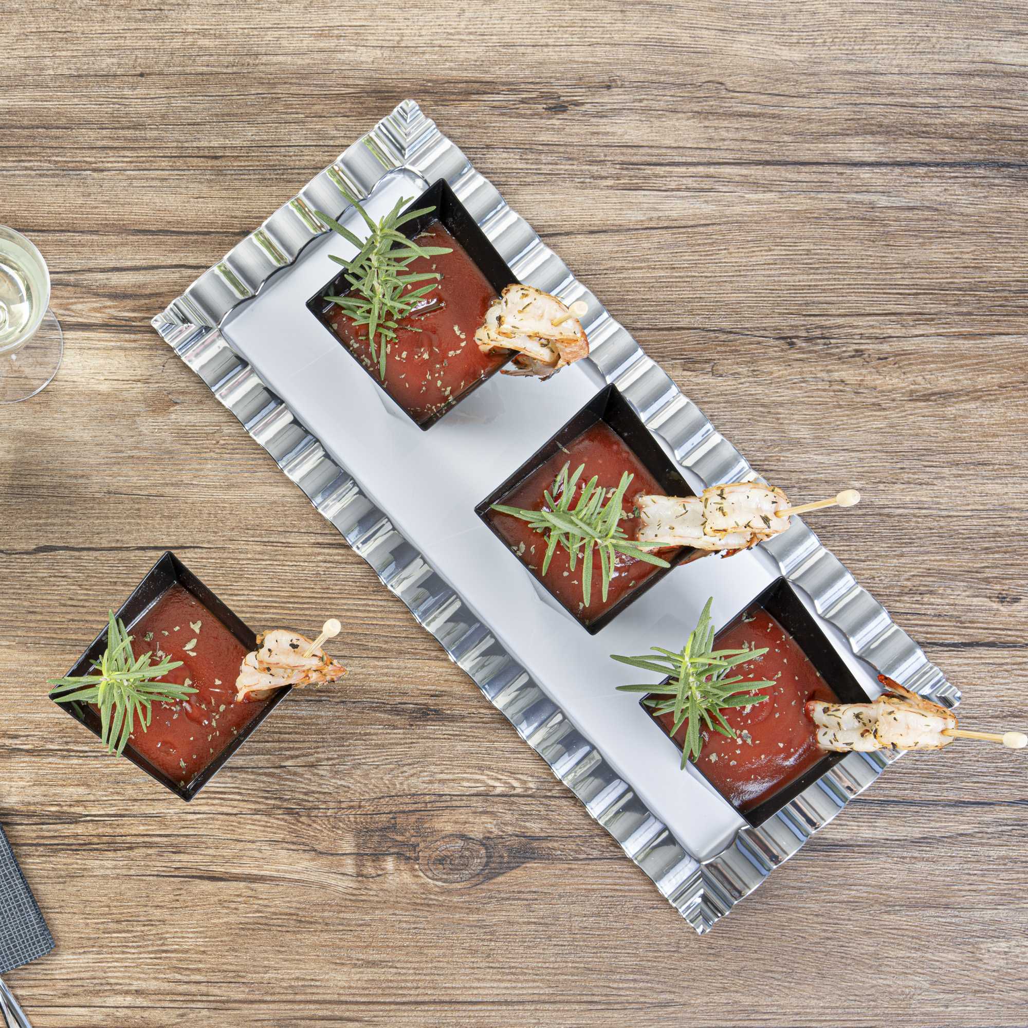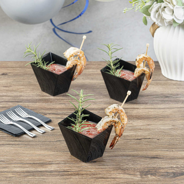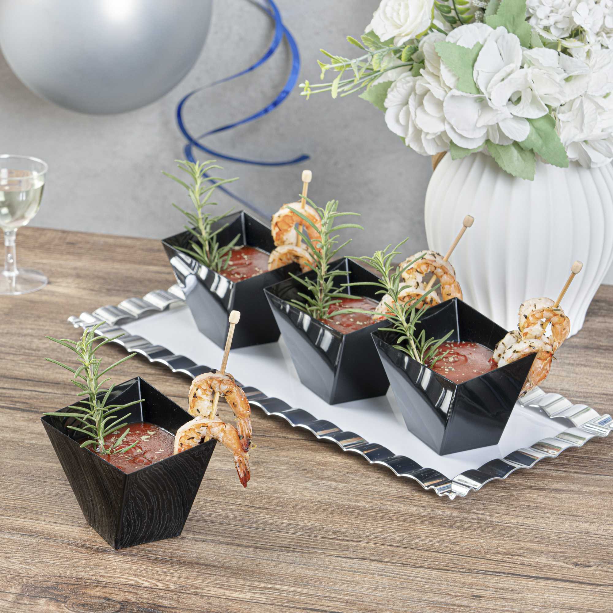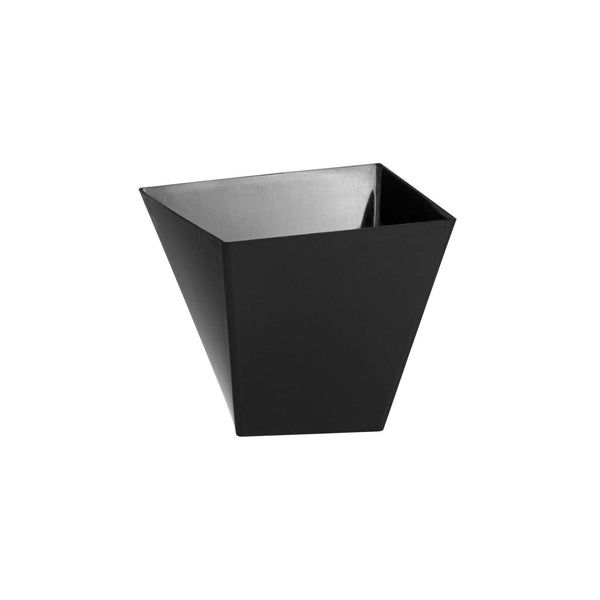 Serve small portions of your favorite appetizers, salads, entrees, and desserts in style with our Mini Serve 6-ounce Square Black Plastic Large Girata Dishes. These square plastic dessert cups feature a geometric-inspired design with crisp corners and clean lines to instantly elevate the presentation of your dishes. Constructed with premium quality plastic, these disposable appetizer cups won't chip or break during use. The premium construction of these plastic snack cups reduces your business’s carbon footprint. These disposable snack bowls make cleaning after events super easy. The black finish of these disposable snack bowls makes your food presentation look sophisticated. These disposable plastic food bowls measure 3.25 inches in length by 2.75 inches in width by 3 inches in height and hold up to 6 ounce. Sold in a 100 count box.