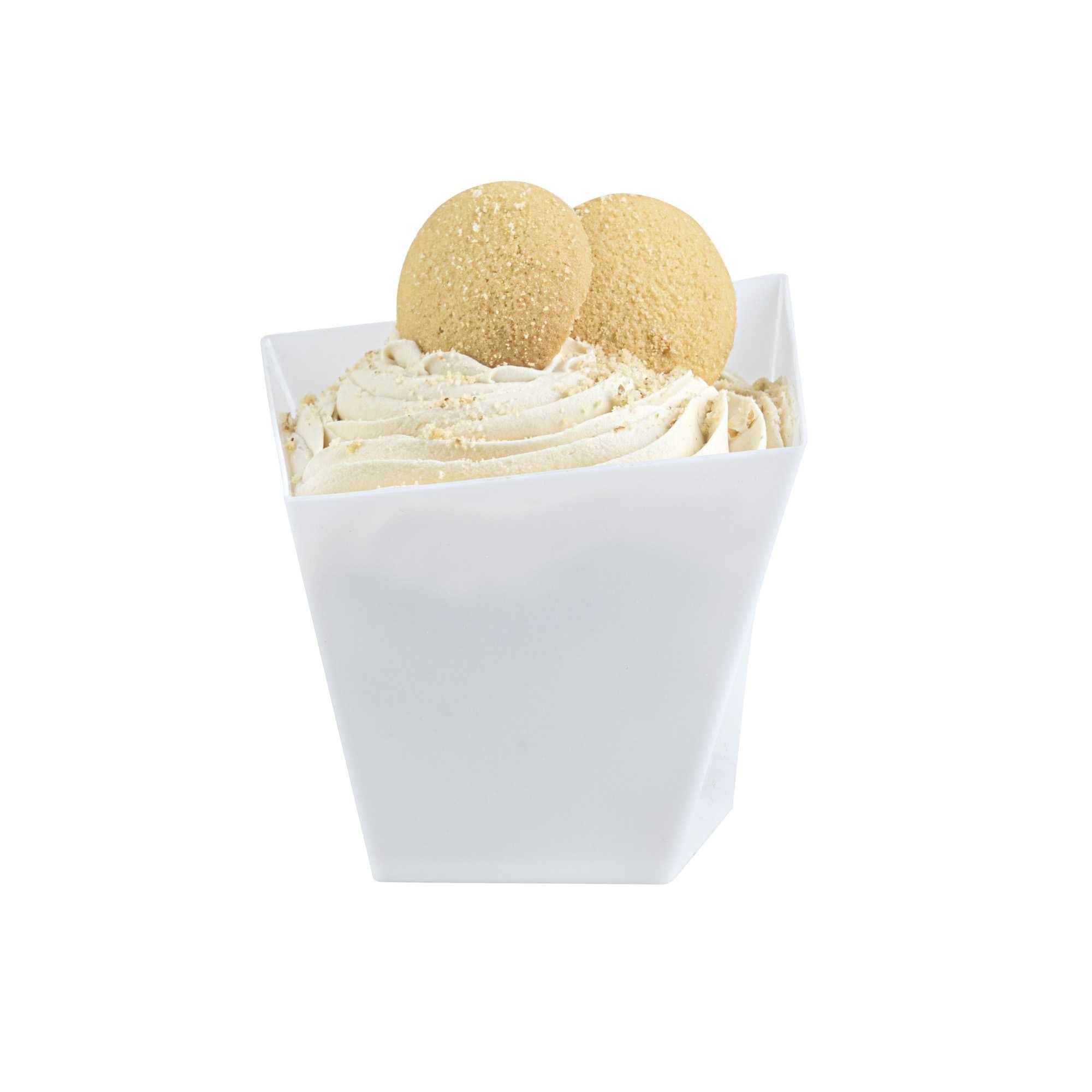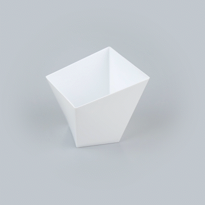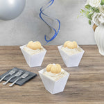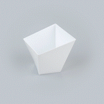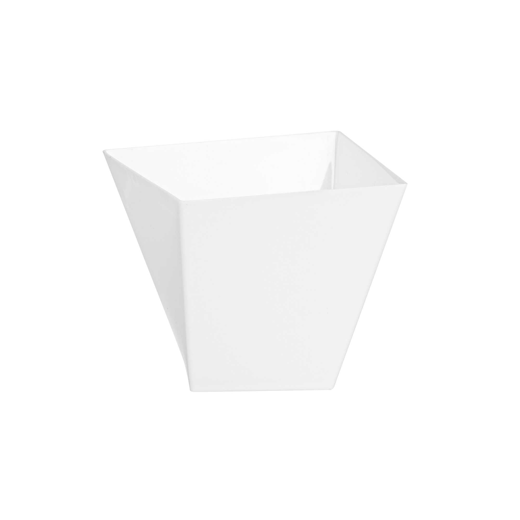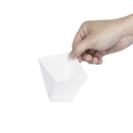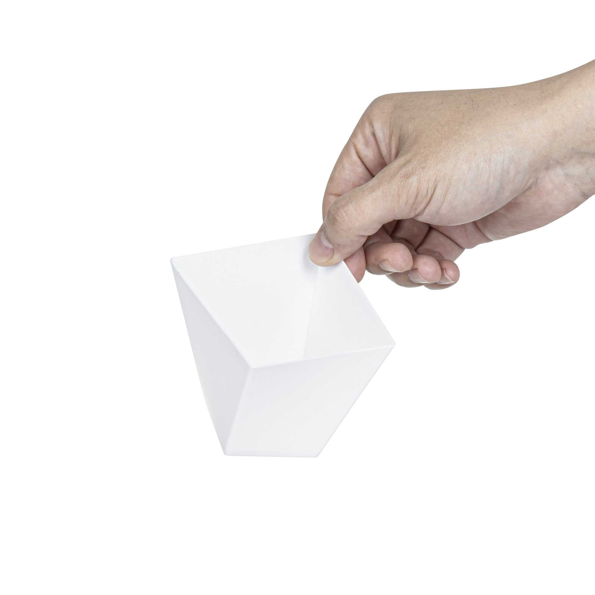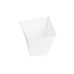 Showcase your favorite appetizers or salads in a chic way using our Mini Serve 6-ounce Square White Plastic Large Girata Dishes. These plastic dessert cups display a cutting-edge geometric design with sharp corners and clean lines, which upgrade the visual appeal of your cuisine instantly. These cups, produced from premium plastic, are exceptionally durable and won't chip or break during regular use. The time-saving disposability of these snack cups ensures super easy cleanup after events. The stylish white finish of these fruit bowls adds sophistication to your food presentation. Each plastic bowl measures 3.25 inches in length by 2.75 inches in width by 3 inches in height and can hold up to 6 ounces. Sold in a 100 count box.