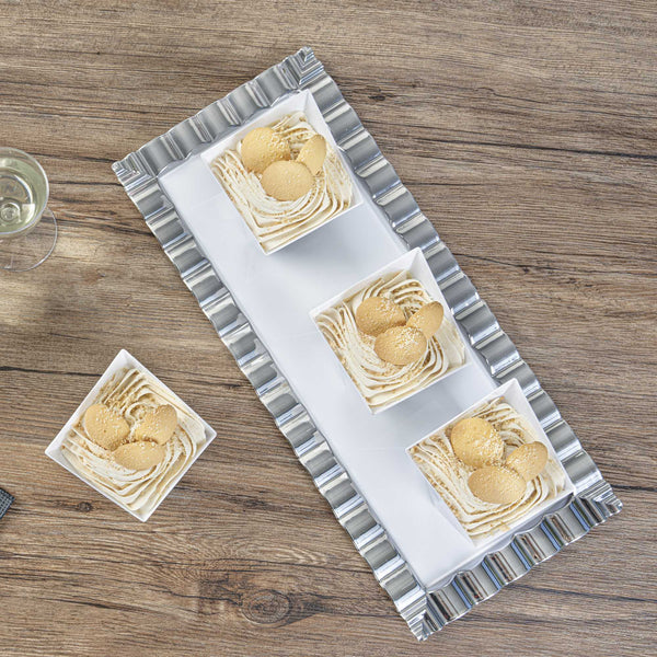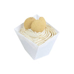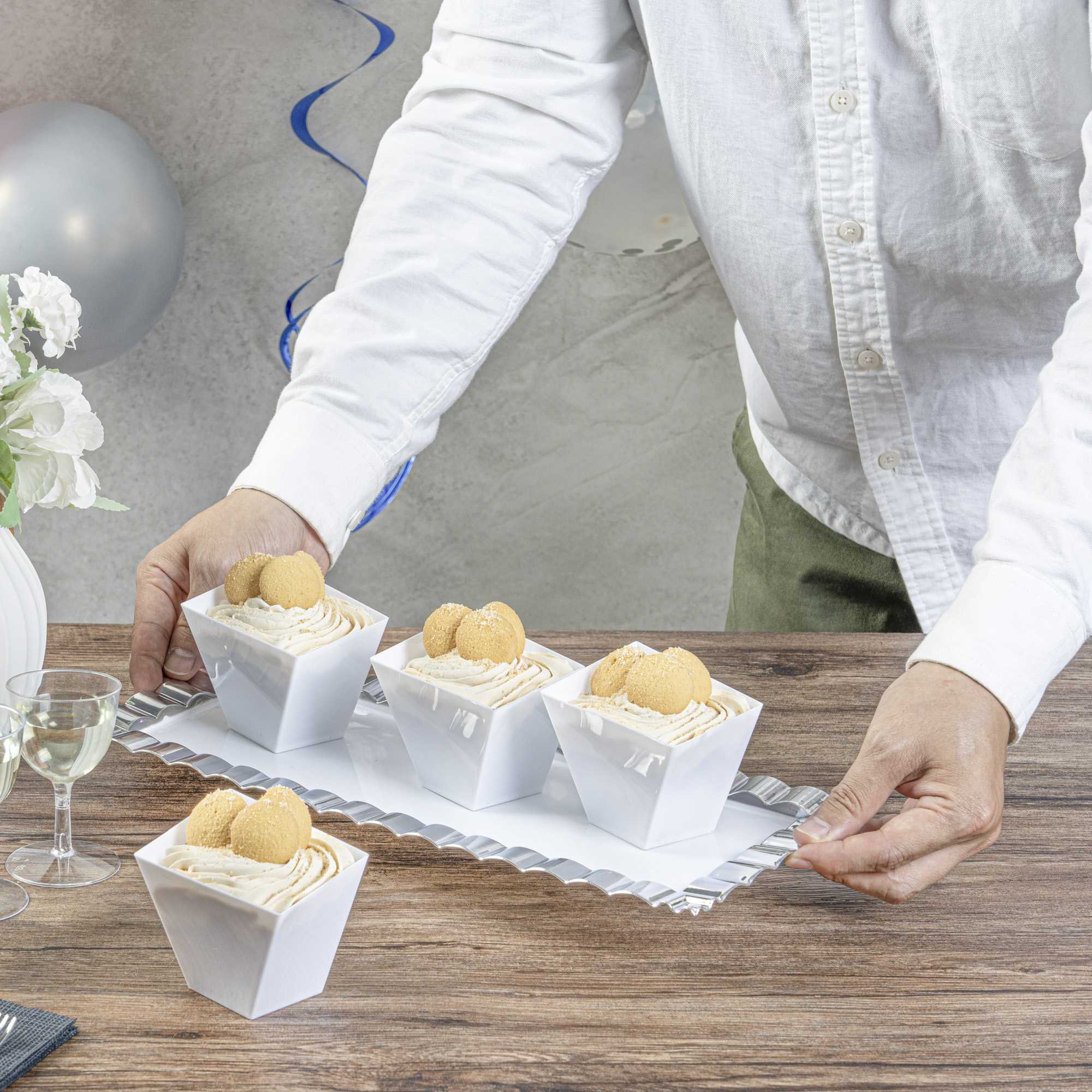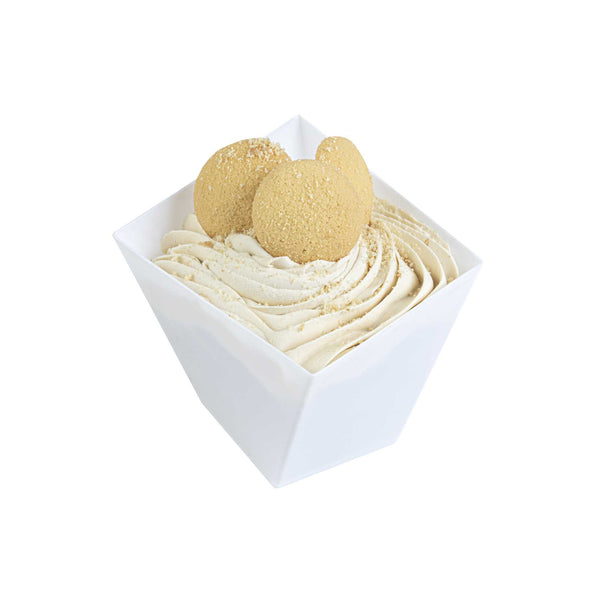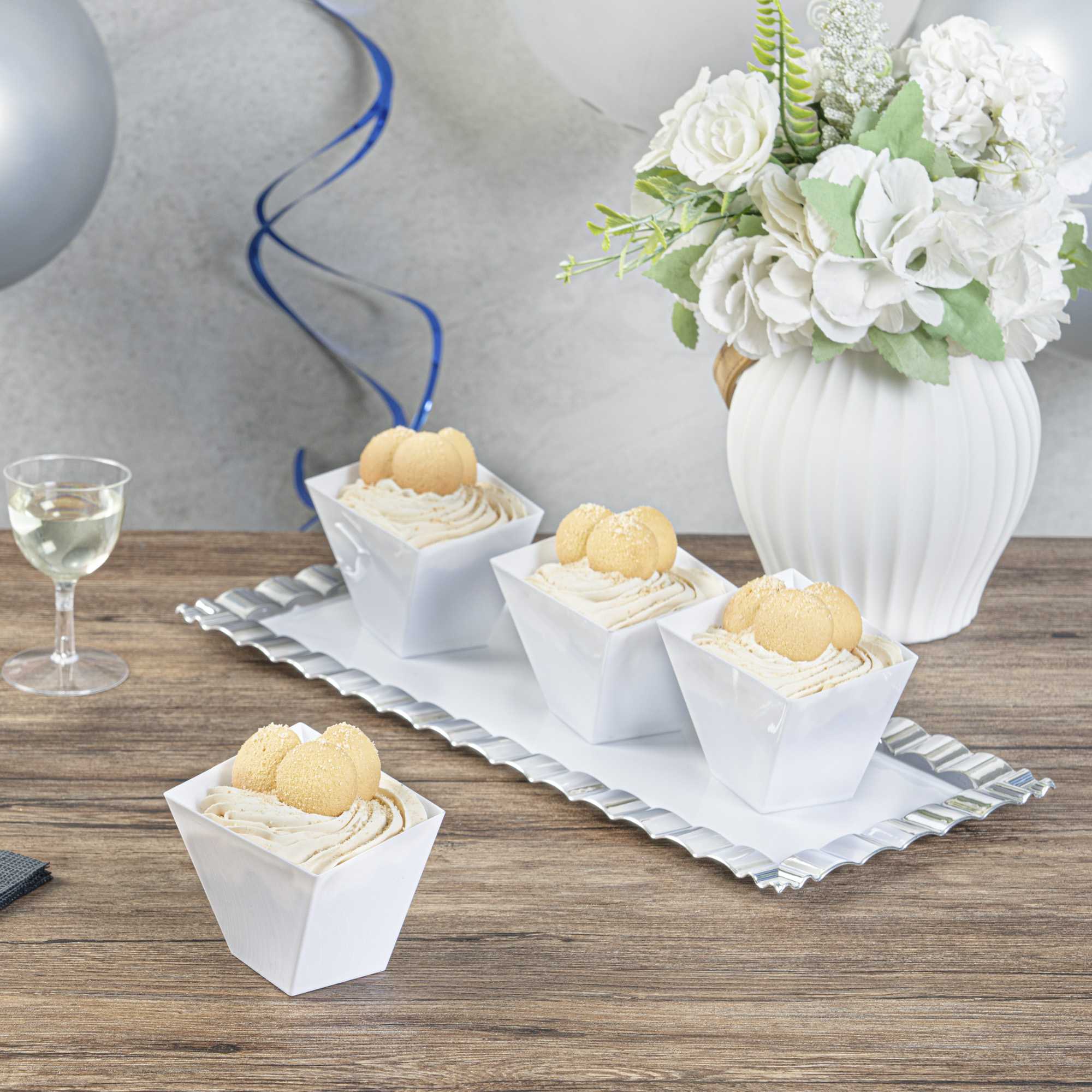 Showcase your favorite appetizers or salads in a chic way using our Mini Serve 6-ounce Square White Plastic Large Girata Dishes. These plastic dessert cups display a cutting-edge geometric design with sharp corners and clean lines, which upgrade the visual appeal of your cuisine instantly. These cups, produced from premium plastic, are exceptionally durable and won't chip or break during regular use. The time-saving disposability of these snack cups ensures super easy cleanup after events. The stylish white finish of these fruit bowls adds sophistication to your food presentation. Each plastic bowl measures 3.25 inches in length by 2.75 inches in width by 3 inches in height and can hold up to 6 ounces. Sold in a 100 count box.