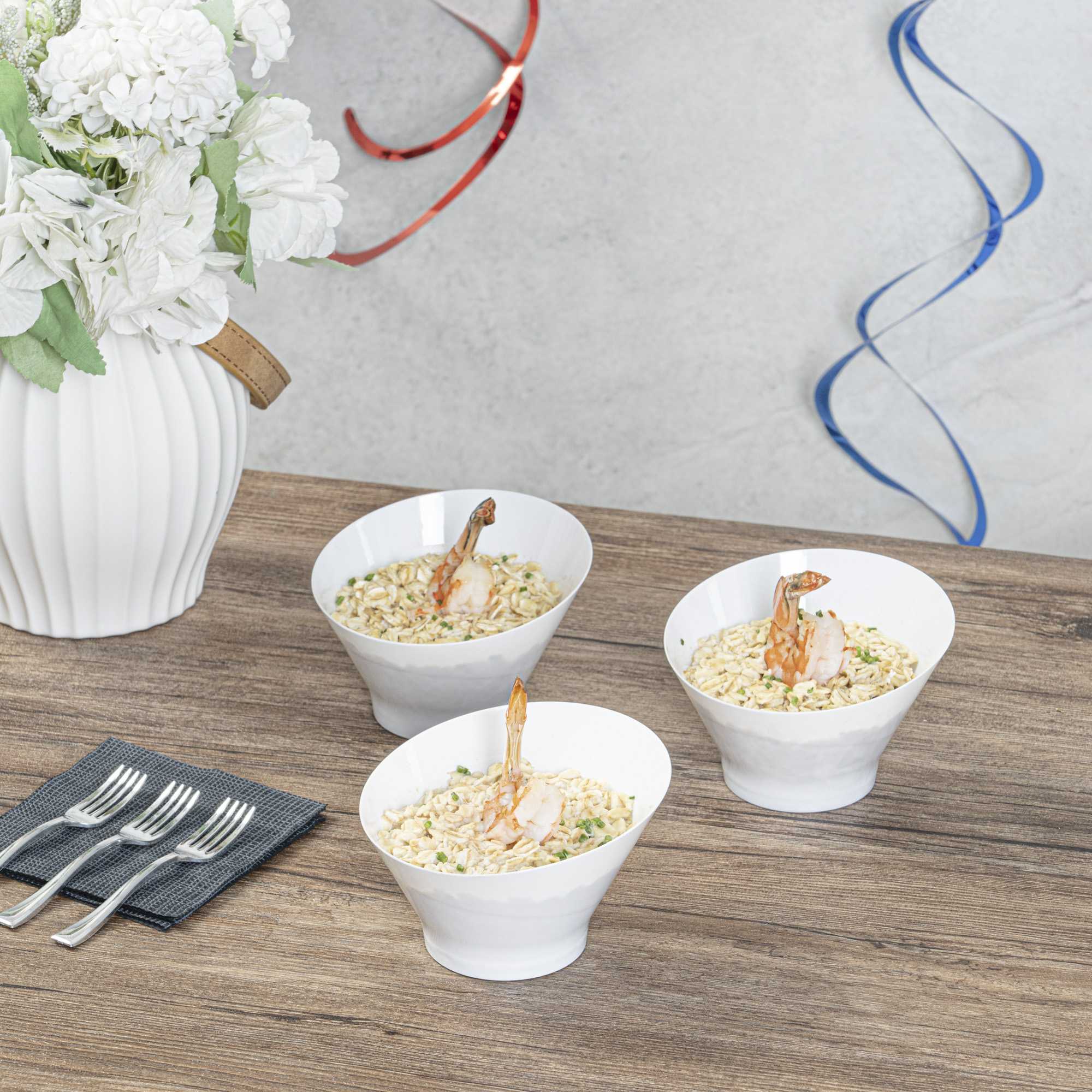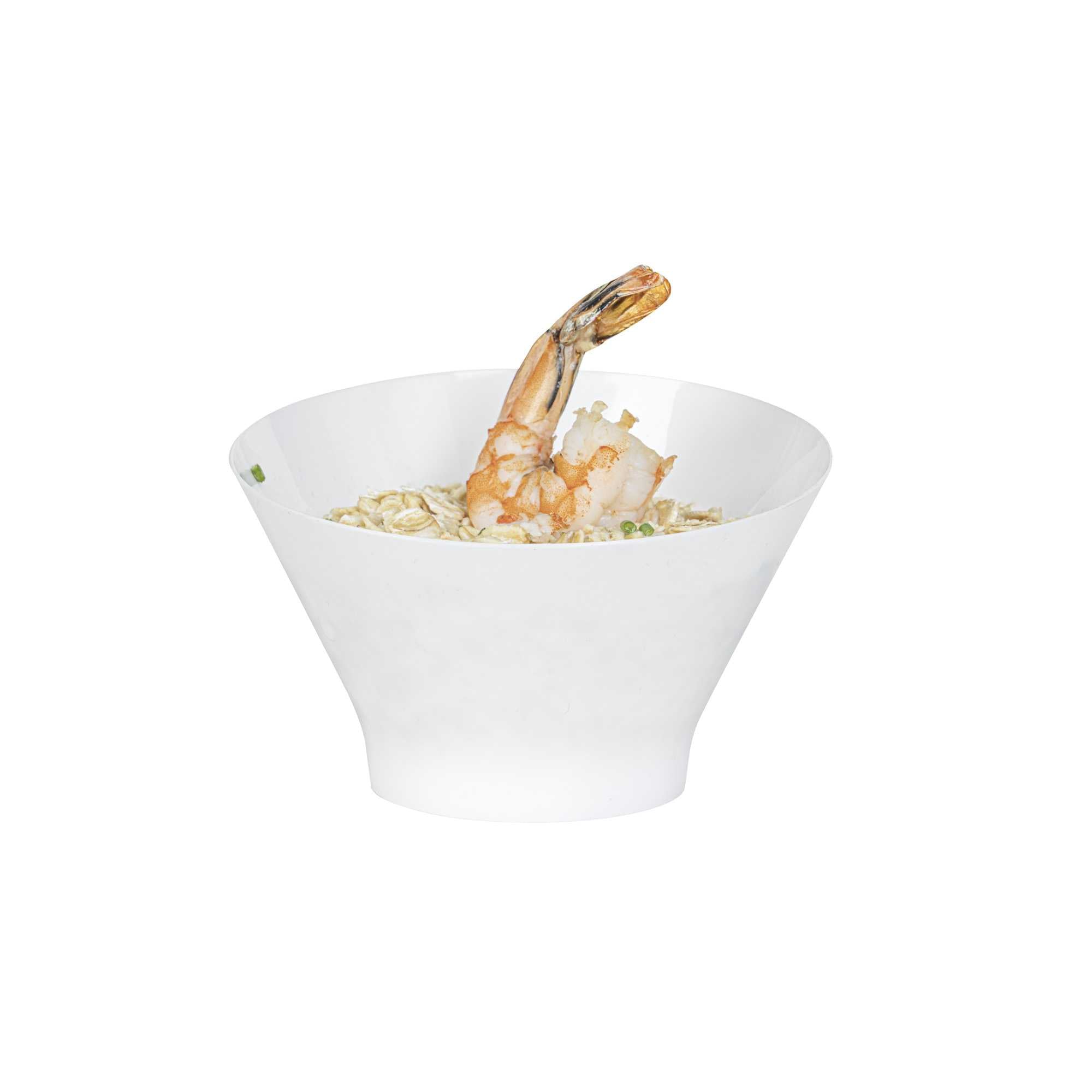 Immerse your customers in a unique dining experience with our Mini Serve 7-ounce Round White Plastic Incline Bowls. The innovative sloping edge of these mini bowls introduces a dynamic element to your dish presentations. These disposable bowls feature a deep structure, providing ample space for serving a variety of dishes, from soups and stews to desserts. These incline bowls offer a nod towards eco-friendly dining solutions. Plus, post-event cleanup is made effortless by these bowls due to their disposable nature. The stylish white finish of these sturdy plastic bowls enhances the presentation of your meals, adding a touch of refinement. With measurements of 4.25 inches in length by 4.25 inches in width by 2.75 inches in height, these compact fruit bowls hold a capacity of 7 ounces. Sold in a 100 count box.