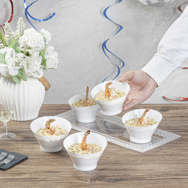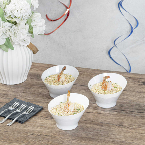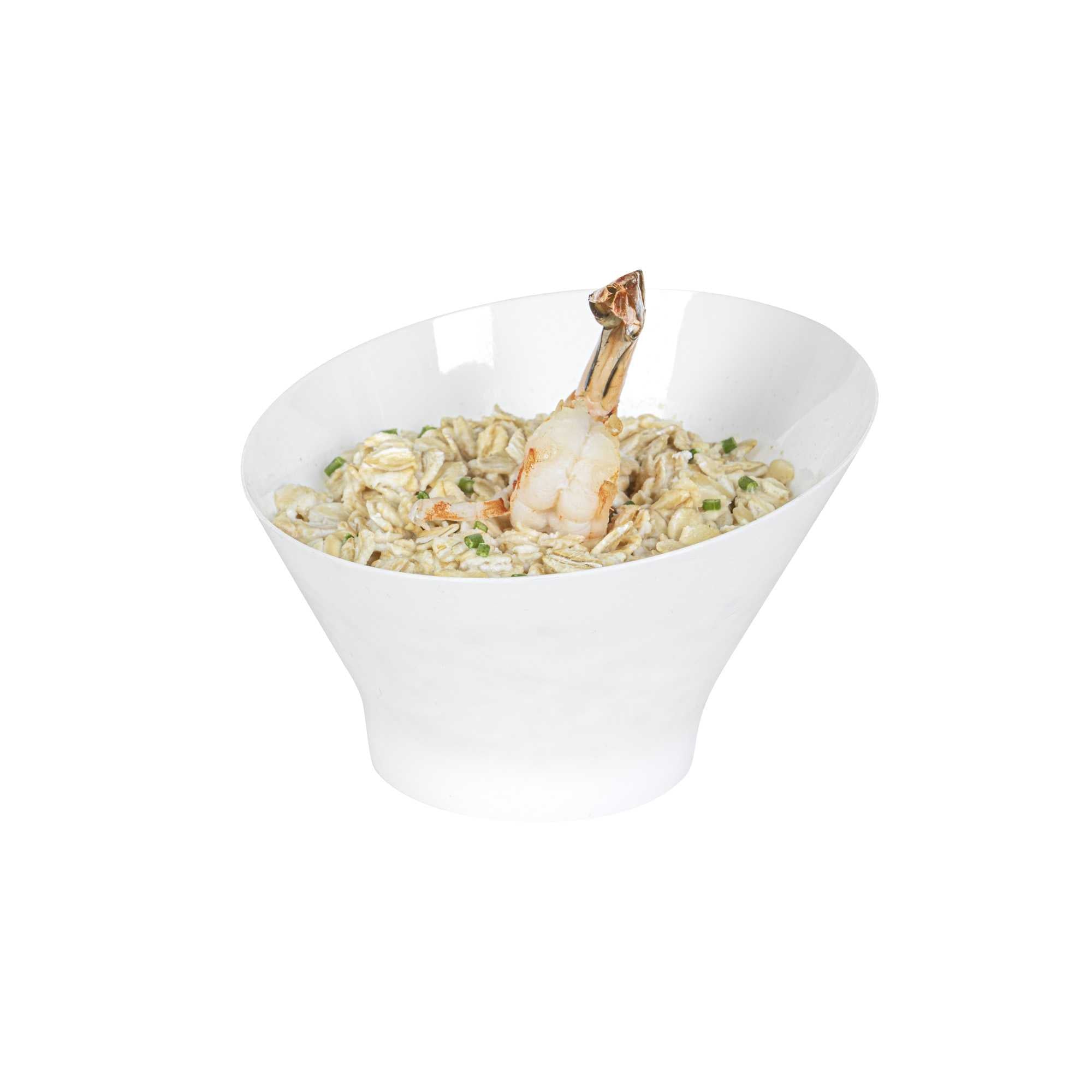 Immerse your customers in a unique dining experience with our Mini Serve 7-ounce Round White Plastic Incline Bowls. The innovative sloping edge of these mini bowls introduces a dynamic element to your dish presentations. These disposable bowls feature a deep structure, providing ample space for serving a variety of dishes, from soups and stews to desserts. These incline bowls offer a nod towards eco-friendly dining solutions. Plus, post-event cleanup is made effortless by these bowls due to their disposable nature. The stylish white finish of these sturdy plastic bowls enhances the presentation of your meals, adding a touch of refinement. With measurements of 4.25 inches in length by 4.25 inches in width by 2.75 inches in height, these compact fruit bowls hold a capacity of 7 ounces. Sold in a 20 count box.