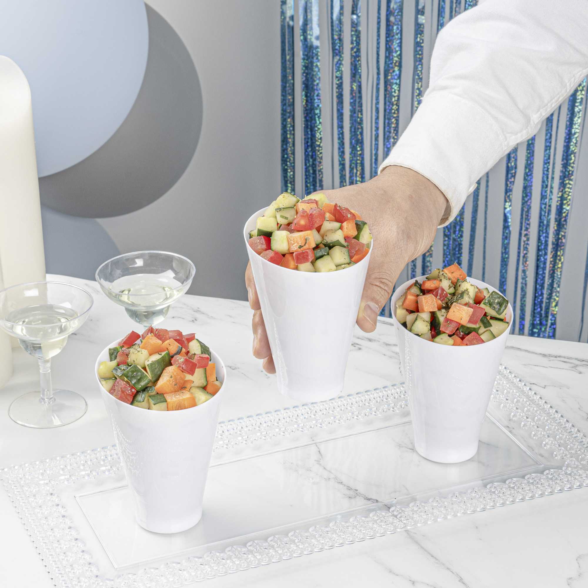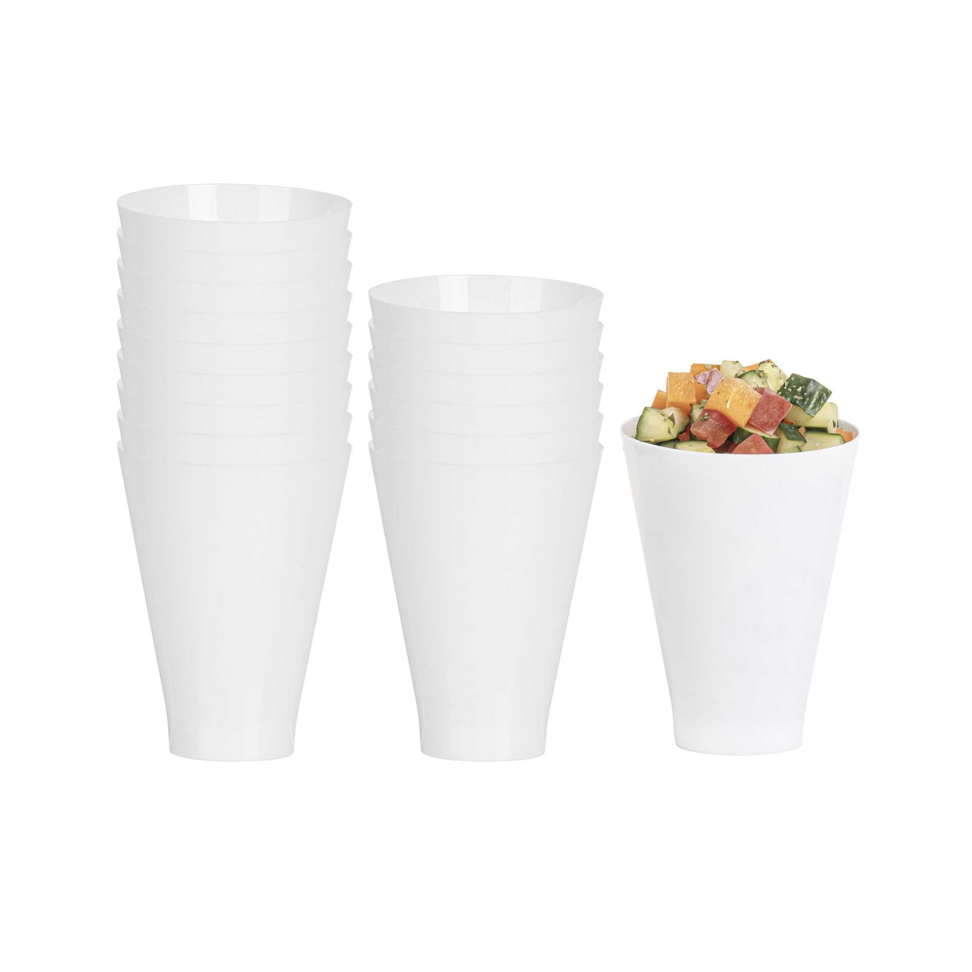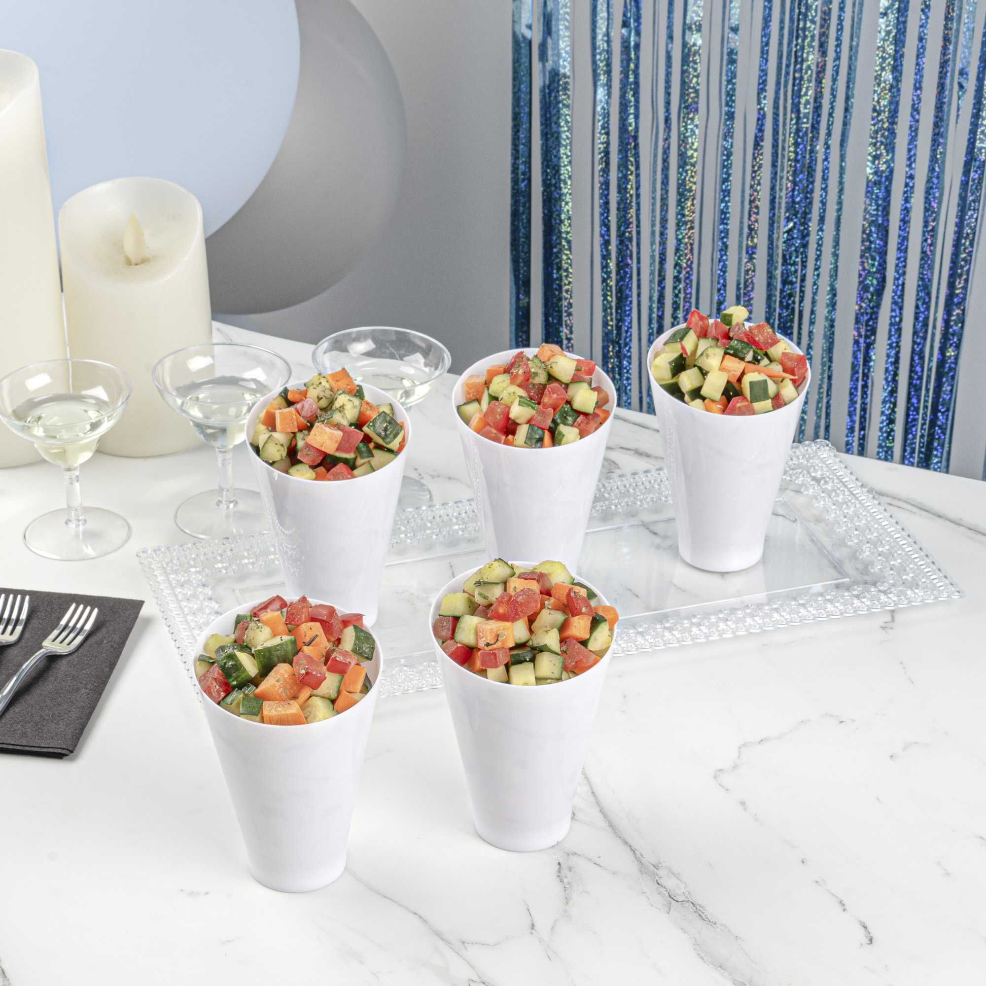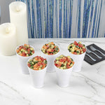 Enhance your appetizer and dessert presentations with our Mini Serve 7-ounce Round White Plastic Incline Glasses. With their contemporary incline shape, these white plastic appetizer cups add a touch of elegance to any chic bakery or upscale catering service. Constructed from robust plastic, these dessert glasses are designed to be disposable for convenience. Lightweight in nature, these transparent dessert glasses beautifully display your sumptuous vanilla bean panna cotta and other delicacies, making them easily portable. The tall design with an inclined edge of these dessert glasses not only facilitates easy gripping but also allows for effortless scooping. Post-use, the premium plastic construction of these dessert cups ensures straightforward disposal for an easy cleanup. The elegant white finish enhances the visual allure of your dessert servings. These disposable dessert cups measure 3 inches in length by 3 inches in width by 4 inches in height and have an accommodating capacity of 7 ounces. Sold in a 100 count box.