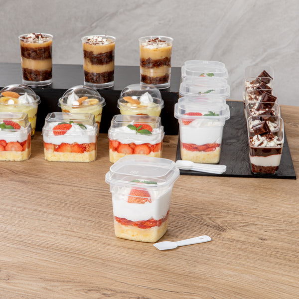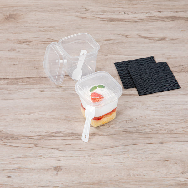 7 OZ SQUARE CLEAR PLASTIC DESSERT CUP - WITH LID AND SPOON