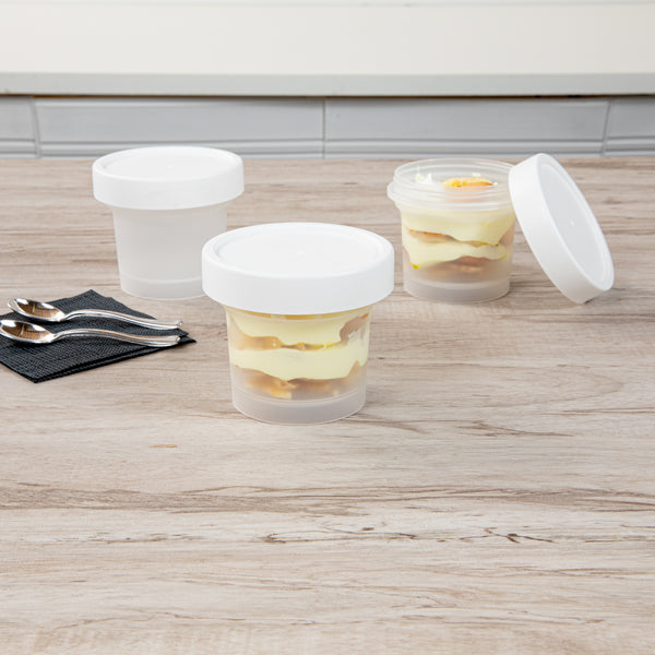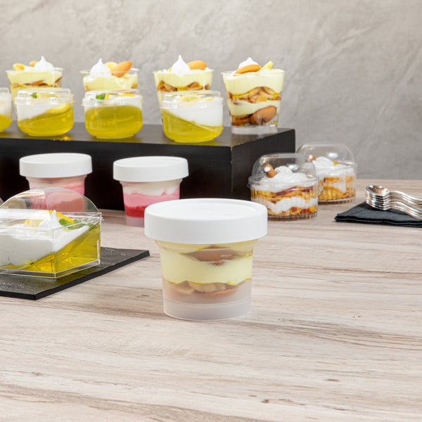 Elevate your dessert presentation with our Mini Serve 7-ounce Round Clear Plastic Dessert Cups. These clear dessert cups with lids are perfect for showcasing your delectable treats while keeping them fresh and protected. Crafted from BPA-free PP plastic, these disposable dessert cups are suitable for hot and cold foods, offering versatility in your dessert menu options. For added convenience, these plastic dessert glasses are microwavable, allowing you to serve your creations at the perfect temperature. The stackable feature of these recyclable plastic dessert cups saves valuable storage space in your kitchen or catering facility. These dessert cups with lids have a clear finish, allowing customers to view and select their preferred treat easily. With a 7-ounce capacity and measuring 3.5 inches in diameter by 3 inches in height, these disposable recyclable plastic dessert cups provide ample room for your delectable creations. Sold in a 25 count box.