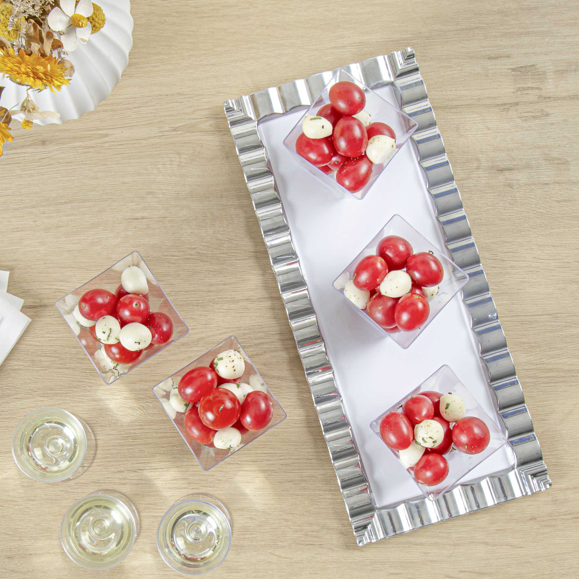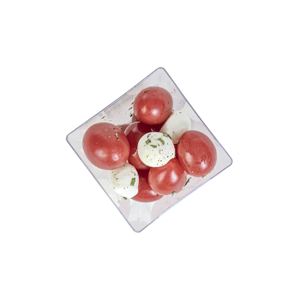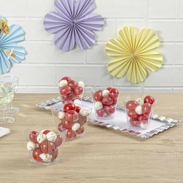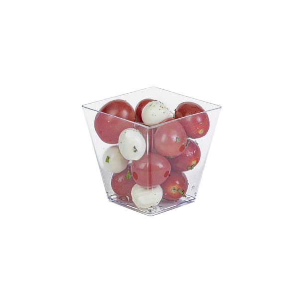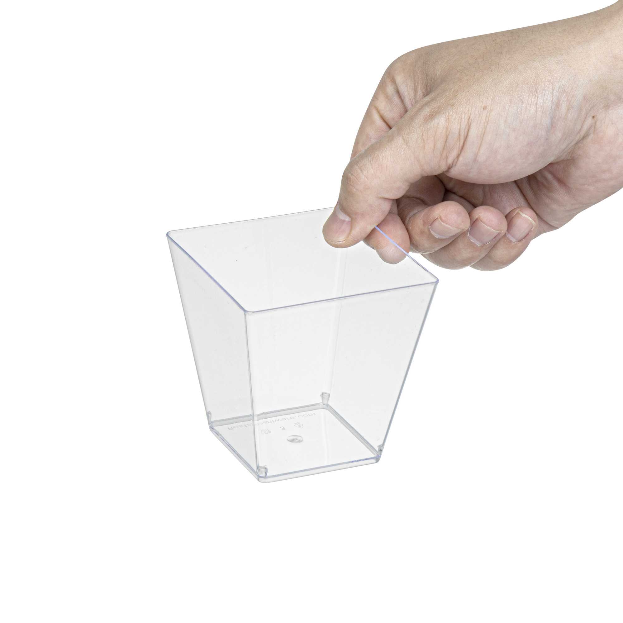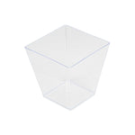 All eyes will be on your tasty treats when they're served in our Mini Serve 8-ounce Square Clear Plastic Large Kova Cups. Built with a sturdy material, these cups for small appetizers do not crack or break, ensuring reliability. Featuring a geometric square design, these appetizer cups are an ideal addition to dessert bars or salad stations at your party. Pair these mini dessert cups with our Mini Serve coordinating lids (SKU RWP0049C) for a mess-free and easy-to-store serving solution. Enabling easy cleaning, these miniature cups for desserts are disposable. With a transparent finish and tapered design, these disposable plastic dessert cups make your dessert presentation look sophisticated. Each plastic cup measures 2.75 inches in length by 2.75 inches in width by 2.75 inches in height and holds 8 ounces. Sold in a 20 count box. Lids are available and sold separately.