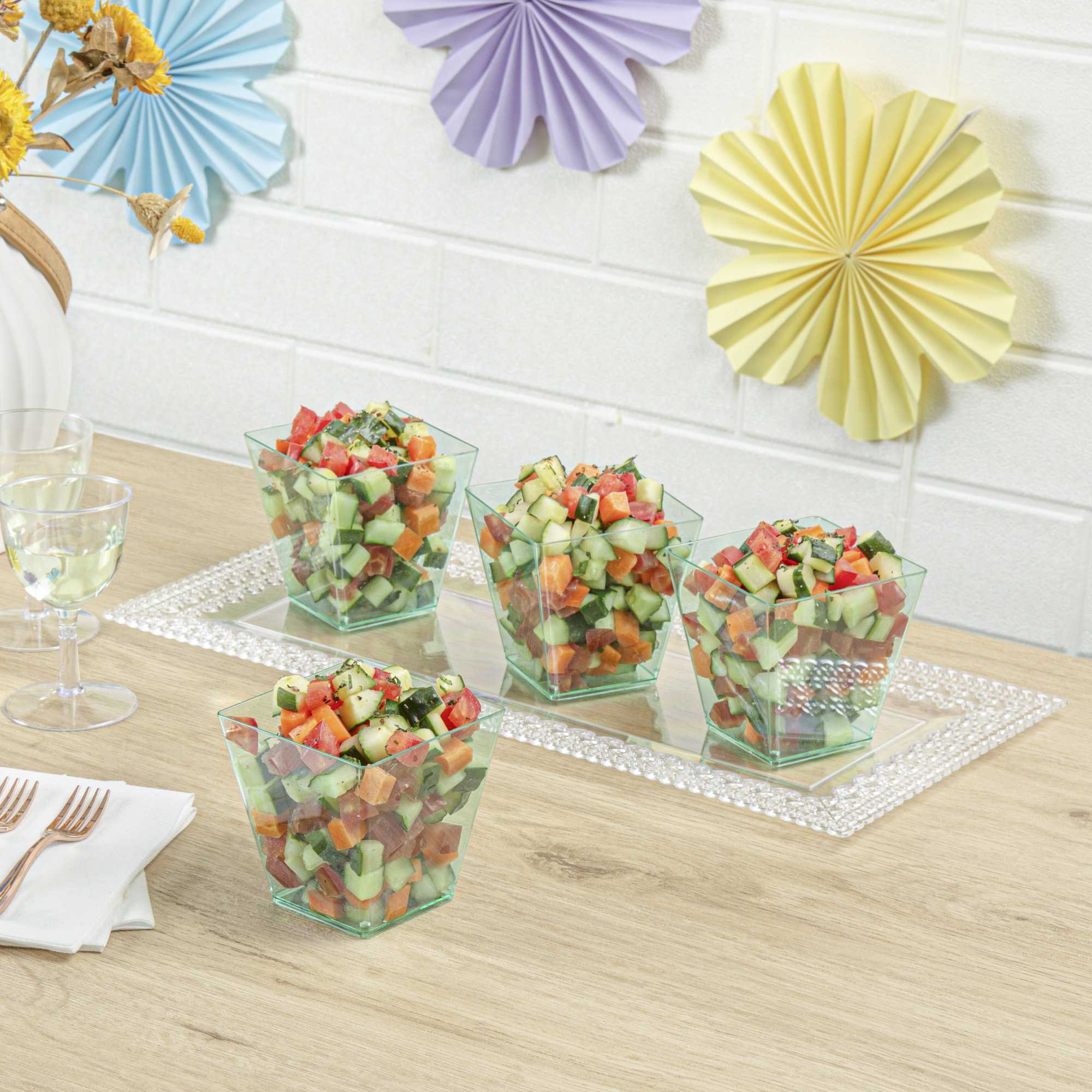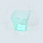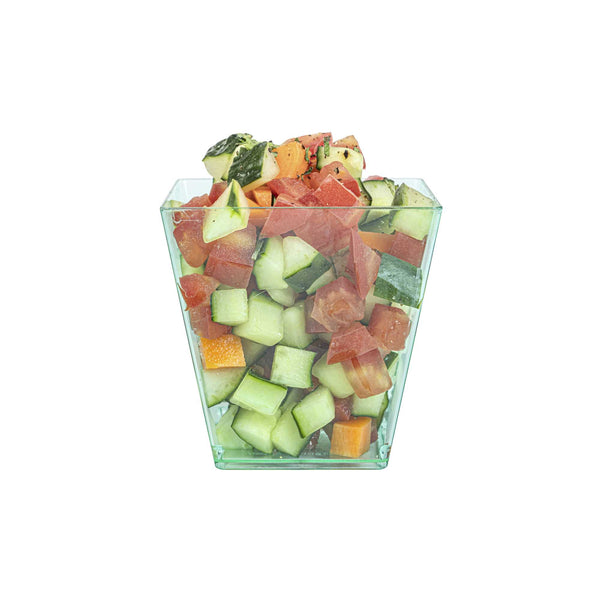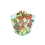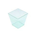 Give the spotlight to your delicious delicacies with our Mini Serve 8-ounce Square Seagreen Plastic Large Kova Cups. Constructed with robust material, these appetizer cups resist cracking and breaking, ensuring their dependability. The geometric square design of these snack plastic cups provides an attractive compliment to dessert bars or salad stations at your event. For a hassle-free and tidy serving solution, pair these mini dessert cups with our Mini Serve matching lids (SKU RWP0049C). Cleaning is a breeze as these miniature dessert cups are disposable. The seagreen tint and tapered design of these disposable plastic dessert cups add a degree of sophistication to your dessert presentations. Each shooter cup measures 2.75 inches in length by 2.75 inches in width by 2.75 inches in height and comfortably holds 8 ounces of content. Sold in a 100 count box. Lids are available and sold separately.
