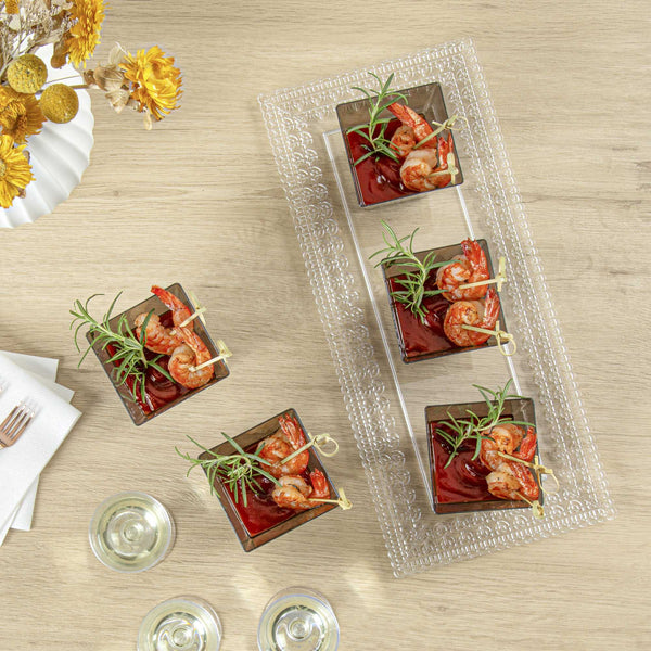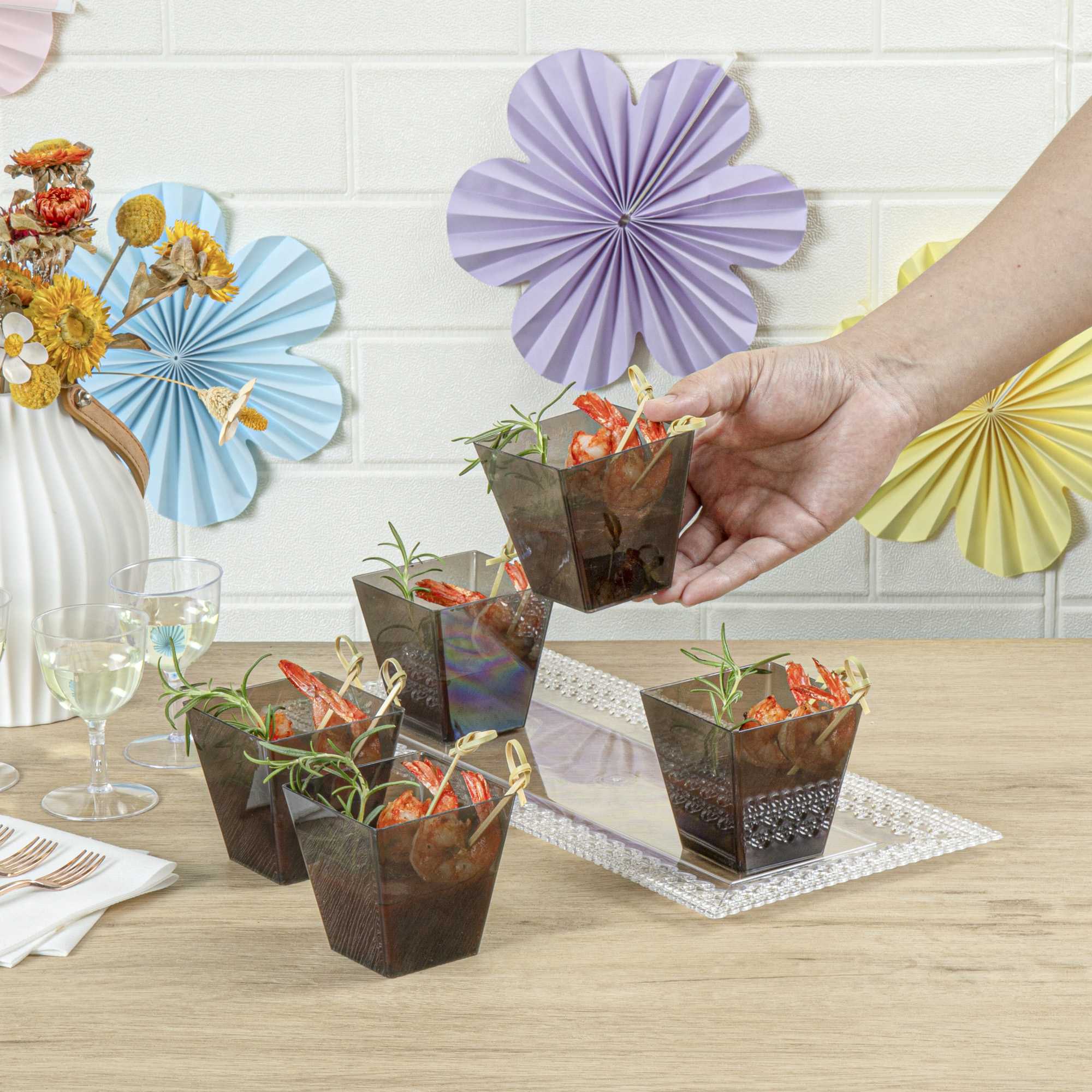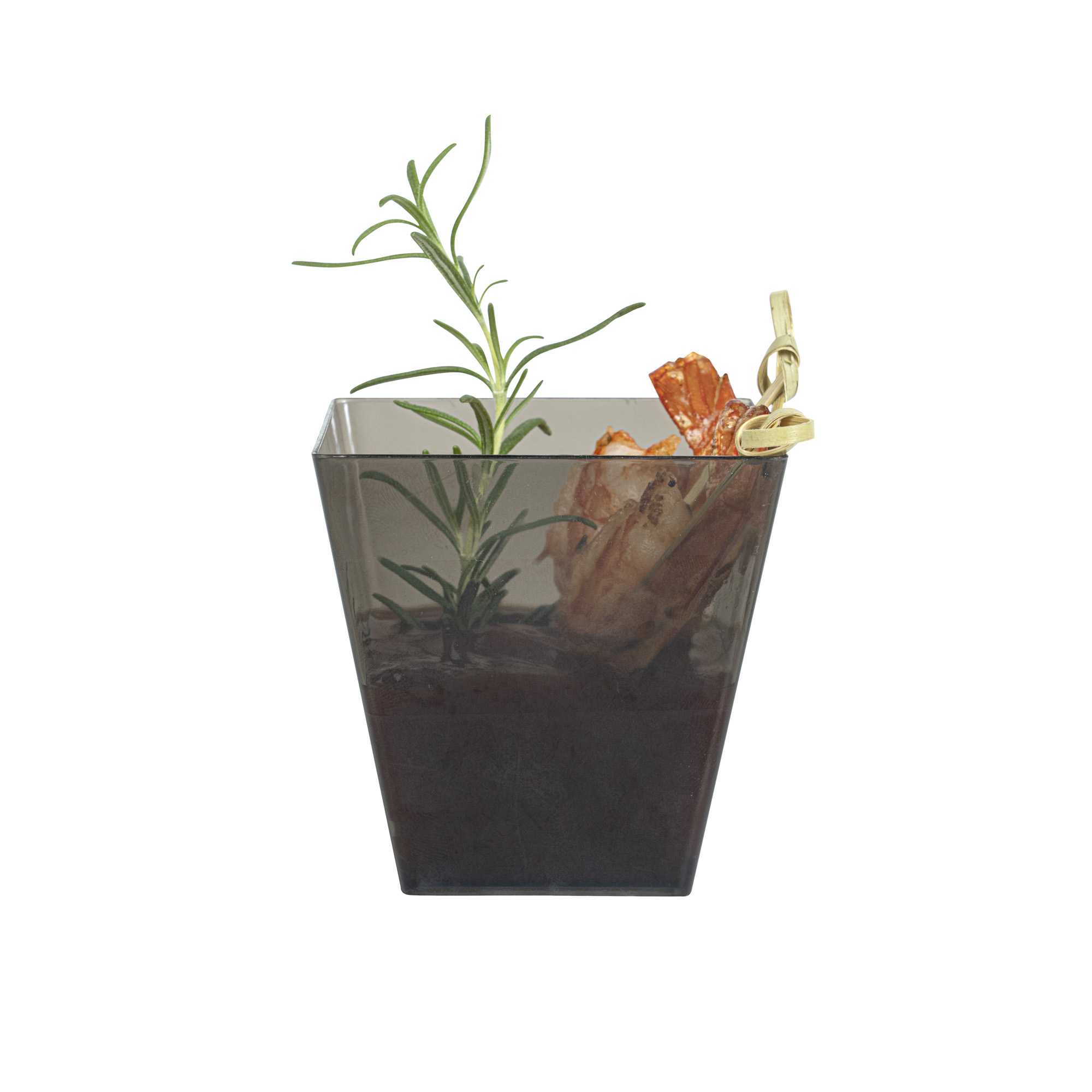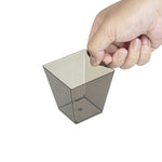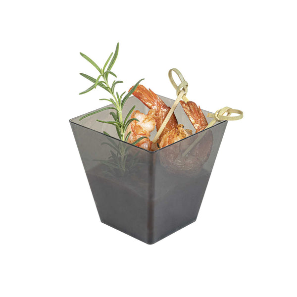 Display your delectable delights in our Mini Serve 8-ounce Square Smoked Gray Plastic Large Kova Cups. Constructed with environmental consciousness in mind, these plastic snack cups actively contribute to a sustainable event service. Using durable material, these appetizer cups are designed to prevent breakages and cracks, ensuring lasting usage. The geometric square profile of these plastic shooter cups provides an attractive aspect to your dessert bars or salad stations. Pair our Mini Serve matching lids (SKU RWP0049C) with these disposable dessert cups for a tidy and straightforward serving solution. The disposable nature of these dessert cups simplifies the post-event cleanup. The classy smoked gray hue combined with a tapered design of these cocktail shooter cups enhances the charm of your dessert exhibits. Each parfait cup measures 2.75 inches in length by 2.75 inches in width by 2.75 inches in height and holds up to 8 ounces. Sold in a 25 count box.