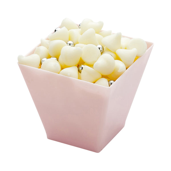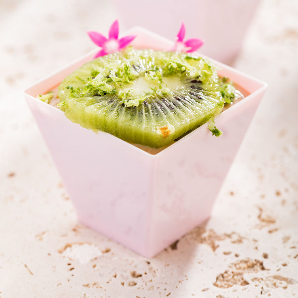 Elevate your dining experience with our Bundle: Mini Serve 100 2-ounce Square Powder Pink Plastic Mini Kova Cups with 100 Silver Plastic 4" Mini Spoons, offering an elegant and eco-friendly solution for your events. This bundle includes 100 exclusive 2-ounce Square Powder Pink Plastic Mini Kova Cups and 100 Silver Plastic Mini Spoons, providing a perfect pairing for serving mini desserts, appetizers, or drinks with style. The durable pink Kova cups, crafted with smooth edges, exude elegance while ensuring a comfortable dining experience without scratches. Plus, the delicate powder pink color of these square mini cups adds a soft, sophisticated touch to your culinary creations. Designed for single-use, these disposable plastic cups simplify the cleanup process, allowing you to focus on enjoying your event, and can be paired with our matching lids (SKU: RWP0305C) to protect the contents. Complementing the cups, our shiny silver plastic spoons effortlessly enhance the presentation of your tantalizing dishes, with their 4-inch size being ideal for miniature tuna tartare, personal-sized strawberry shortcakes, hefty bites of polenta, and big scoops of gelato, while their sturdy handles ensure a firm grip. Made from premium plastic, these spoons are conveniently disposable and completely recyclable, making them a perfect flatware option for eco-conscious cafes, venues, and clients. The cups measure 2 inches in length by 2 inches in width by 1.75 inches in height, and the spoons measure 4 inches in length, providing ample capacity and size for your serving needs. Each order includes 100 pink Kova cups and 100 silver plastic spoons.