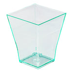 Elevate your culinary presentations with our Bundle: Mini Serve 100 2-ounce Square Seagreen Plastic Bonito Cups with 100 Silver Plastic 4" Mini Spoons, offering an elegant and sustainable solution for showcasing delectable treats. This bundle includes 100 modern, tall, 2-ounce sea green plastic bonito cups and 100 shiny silver plastic mini spoons, providing the perfect pairing for plating appetizers and desserts. The transparent sea green cups elegantly showcase layered desserts like miniature tiramisu or Neapolitan mousse, while the tinted finish adds a luxurious touch to any occasion. With a sturdy build, these mini dessert cups won't chip or break. These mini dessert cups are disposable to ensure easy cleanup for restaurants, buffets, or catered events. Complement the cups with the included 4-inch silver plastic spoons, effortlessly enhancing the presentation of tantalizing dishes like miniature tuna tartare or personal-sized strawberry shortcakes. The strong, sturdy handles of these spoons can handle hefty bites of polenta and big scoops of gelato, making them a versatile addition to any eco-conscious cafe or venue. The cups measure 1.75 inches in length by 1.75 inches in width by 2.25 inches in height, while the spoons are 4 inches long. Each order includes 100 sea green plastic cups and 100 silver plastic mini spoons.