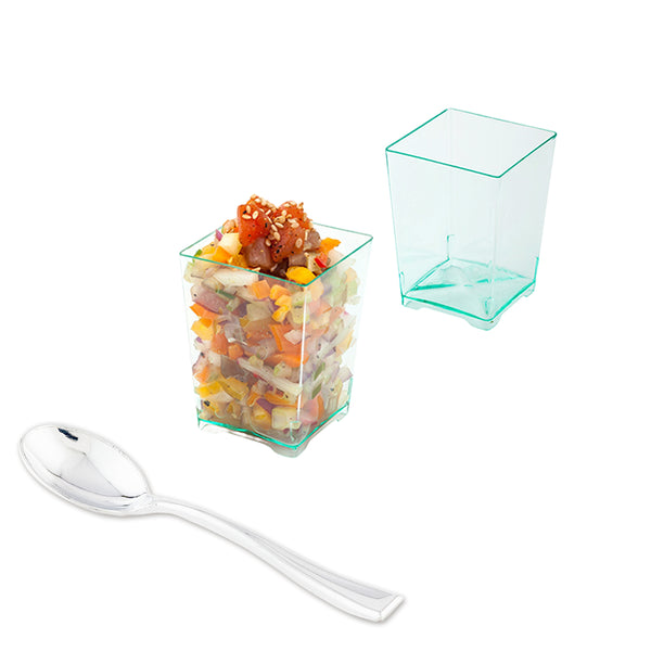 100 4 OZ SEAGREEN PLASTIC QUADRATO CUPS AND 100 SILVER 4" MINI SPOONS