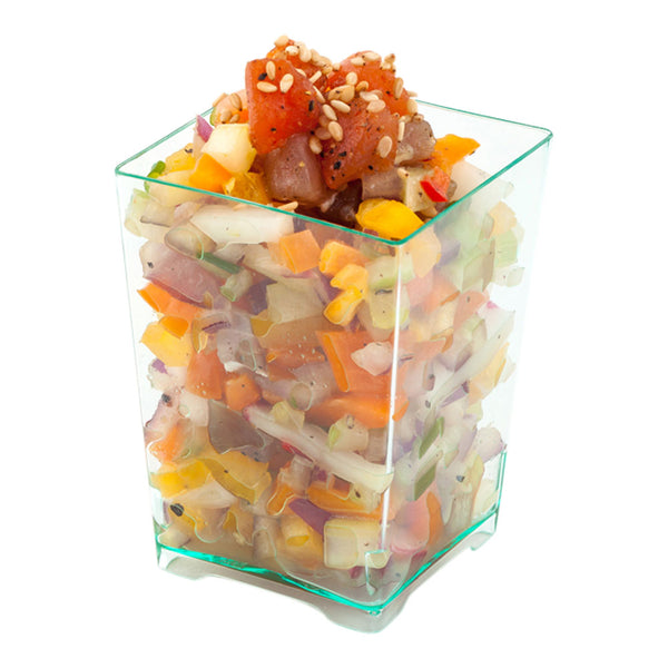 Elevate your event presentations with our Bundle: Mini Serve 100 4-ounce Square Seagreen Plastic Tall Quadrato Cups with 100 Silver Plastic 4" Mini Spoons, offering a stylish and convenient solution for serving appetizers and desserts. This bundle includes premium sea green plastic cups and shiny silver plastic spoons, both crafted from high-quality materials built to last and not crack easily. The tall, square, and stackable design of the sea green cups not only enhances the aesthetic appeal but also provides a space-efficient solution ideal for large gatherings. With a smooth rim, these cups offer a comfortable eating experience, free from accidental scratches. The 4-ounce capacity of the disposable cups makes them perfect for serving small portions of appetizers, desserts, or drinks, while the stylish sea green color complements any setting. Complementing the cups are the silver plastic mini spoons, designed to effortlessly enhance the presentation of your tantalizing dishes. These 4-inch spoons feature sturdy handles that can handle hefty bites and big scoops, making them ideal for serving a variety of appetizers and desserts. Both the cups and spoons are made from premium plastic, ensuring they are conveniently disposable and completely recyclable, making them an eco-friendly choice for conscious cafes, venues, and clients. With dimensions of 2 inches in length by 2 inches in width by 2.75 inches in height for the cups and a length of 4 inches for the spoons, this bundle offers a practical and visually appealing solution for your serving needs. Each order includes 100 sea green plastic cups and 100 silver plastic mini spoons, providing ample quantities for your event or establishment.