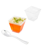 Elevate your event presentations with our Bundle: Mini Serve 300 2-ounce Square Clear Plastic Mini Kova Cups with 300 Silver Plastic 4" Mini Spoons, offering an elegant and convenient solution for serving bite-sized delicacies. This bundle includes 300 clear plastic Kova cups and 300 silver plastic mini spoons, providing all the essentials for a seamless dining experience. The robust material of the clear Kova cups ensures enduring performance, while their smooth-rimmed design guarantees a secure and enjoyable dining experience. The transparent finish of these snack cups allows your menu items to shine, adding elegance and style to casual and upscale events. Perfect for serving bite-sized desserts, appetizers, or beverages, these 2-ounce Kova cups cater well to small portion servings. Disposable and conveniently single-use, these recyclable plastic square cups make post-event cleaning effortless. Pair these cups with our matching lids (SKU: RWP0305C) to protect the contents. Complementing the cups, the silver plastic mini spoons feature a shiny finish, enhancing the presentation of your tantalizing dishes. These 4-inch spoons are the ideal size to accompany miniature tuna tartare or personal-sized strawberry shortcakes, while their sturdy handles stand up to hefty bites of polenta and big scoops of gelato. Made from premium plastic, these appetizer spoons are conveniently disposable and recyclable, making them a perfect flatware option for eco-conscious cafes, venues, and clients. The Kova cups measure 2 inches long by 2 inches wide by 1.75 inches tall, while the spoons are 4 inches long, providing ample capacity and size for your culinary creations. Each order includes 300 Kova cups and 300 silver plastic mini spoons.
