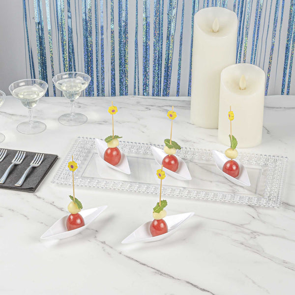 Add an impressive flair to your snack presentation with our Mini Serve Diamond White Plastic Canoe Dishes. These miniature plastic bowls are perfect for serving fruit, sauce, shrimp, or other snack-sized portions, offering a delightful divergence from traditional plastic dinnerware. Made with premium plastic, these stylish mini canoe dishes are durable and won't chip. Using plastic materials, these canoe dishes present an excellent eco-friendly option for your foodservice establishment. The distinct canoe shape of these snack bowls enhances the presentation of nuts or bite-sized cold appetizers, making your culinary showcase truly memorable. The disposable feature of these snack containers allows for quick and easy cleanup post events. Adorned with a sleek white finish, these plastic dishes lend every serving a dash of contemporary elegance. With measurements of 5 inches in length and 1.5 inches in width, these stylish canoes hold up to 1-ounce capacity. Sold in a 100 count box.