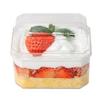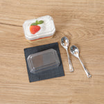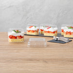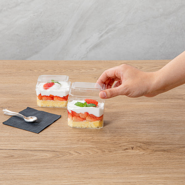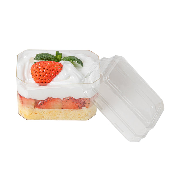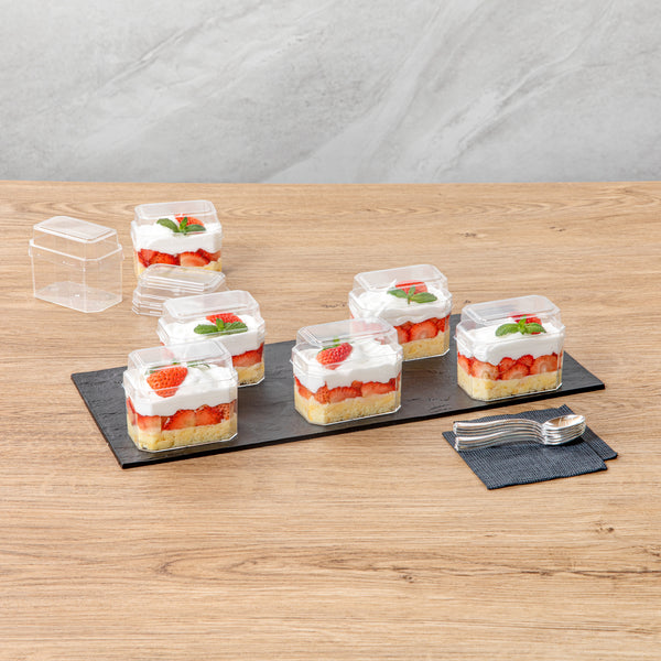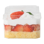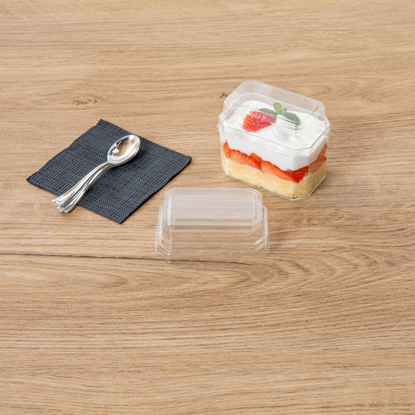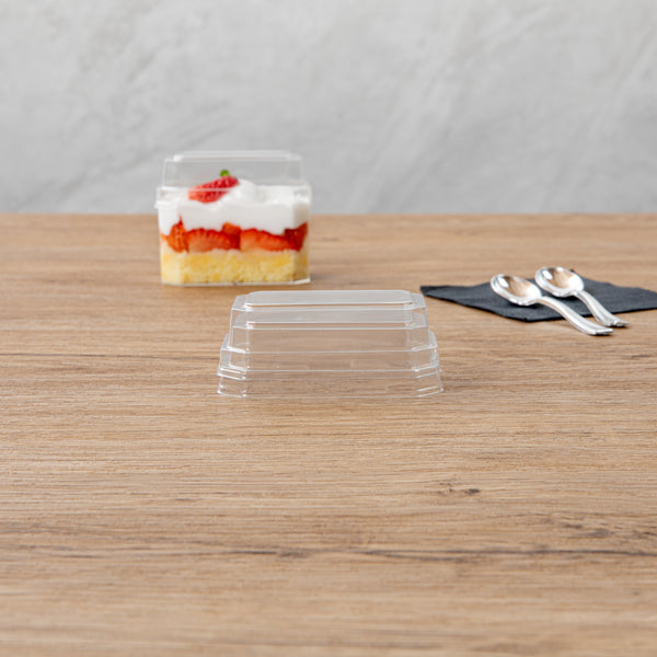 Elevate your dessert presentation with our Mini Serve Rectangle Clear Plastic Dome Lids. Crafted from durable PS plastic, these dome lids are built to withstand the demands of any foodservice environment. With their dome design, these plastic dome lids provide extra space for your delectable treats, ensuring they stay intact and visually appealing. Perfectly suited for cold foods, these recyclable clear dome lids are ideal for serving all kinds of desserts. The clear finish of these plastic lids allows for easy identification and display of your desserts, adding convenience to your food service operations. Designed to be stackable, these clear plastic lids optimize storage space and streamline your dessert preparation process. These disposable dessert cup lids provide a seamless cleaning solution after large events. Pair them with our 3-ounce dessert cups (RWP1421C), enhancing their functionality and aesthetic appeal. These plastic dome lids measure 3.25 inches in length by 2 inches in width by 1.25 inches in height, providing ample coverage for your dessert cups. Sold in a 100 count box. Dessert cups are available and sold separately.