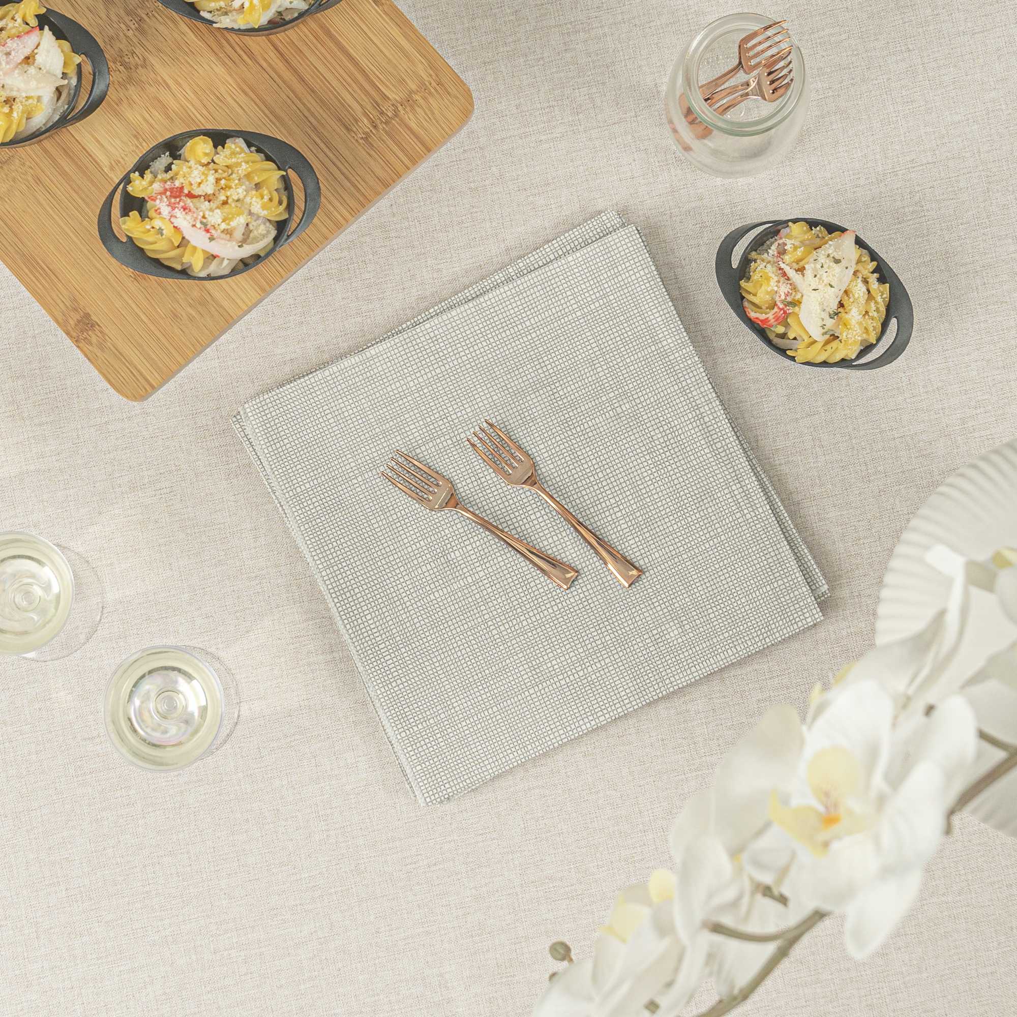 Achieve a higher level of elegance for your table setting with our Mini Serve Rose Gold Plastic Mini Forks. Featuring a shiny finish, these rose gold plastic forks are designed to effortlessly enhance the presentation of your delicious dishes. With their strong and sturdy handle, these cake forks are built to stand up to hefty bites of polenta and big scoops of gelato. Made from premium plastic, these appetizer forks are recyclable and can be conveniently disposed of after use. Measuring 4 inches in length, these single-use forks are the ideal size to accompany miniature tuna tartare or personal-sized strawberry shortcakes. Shipped in a 100 count box.