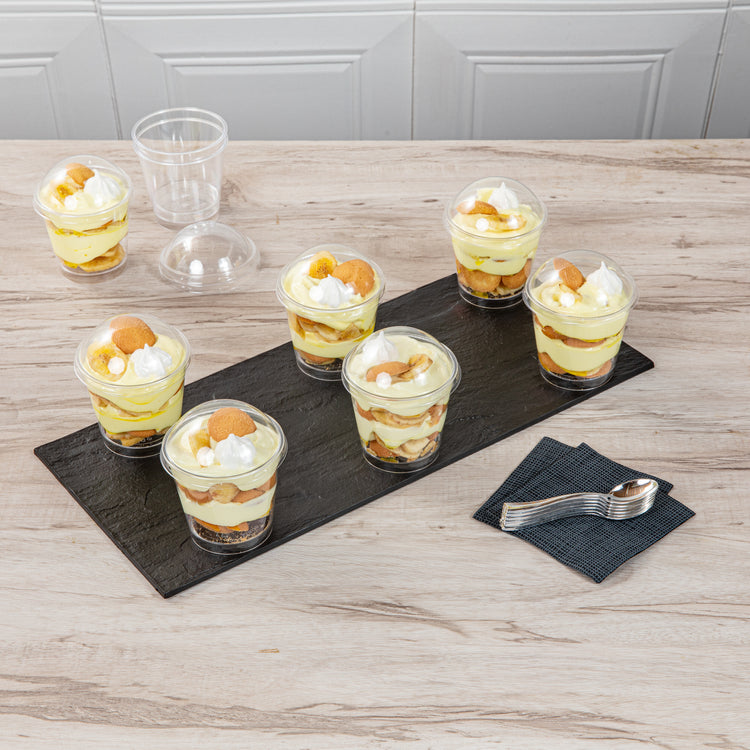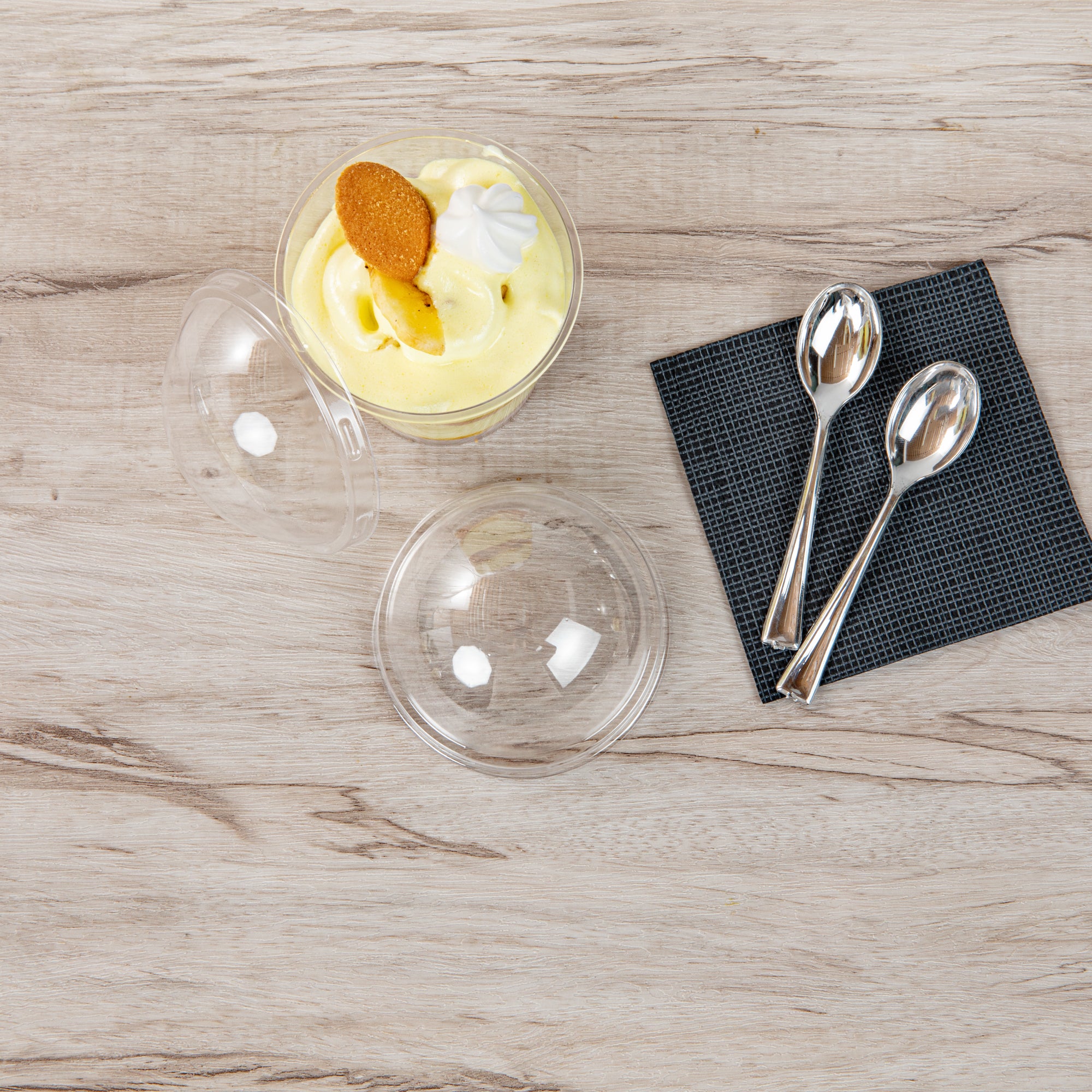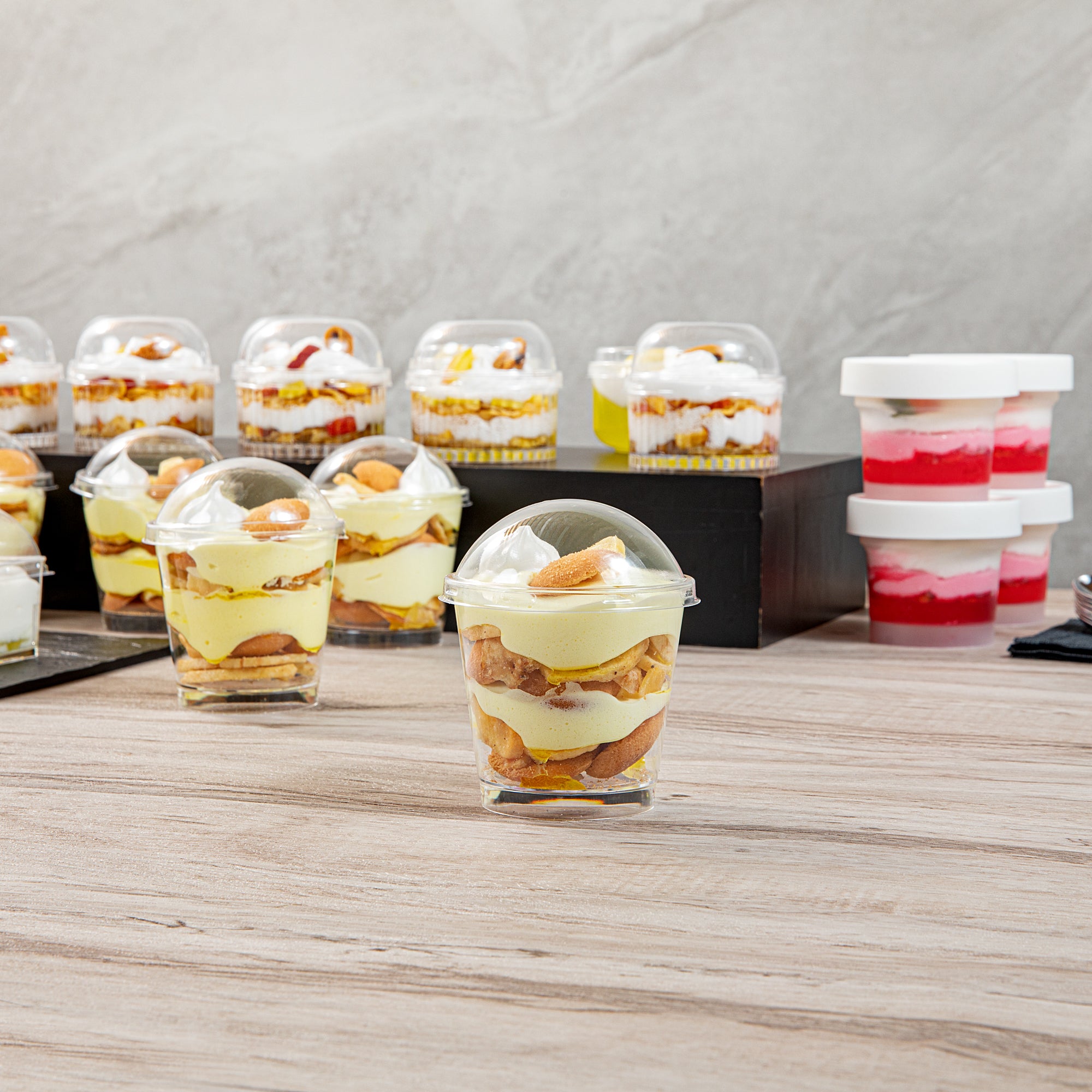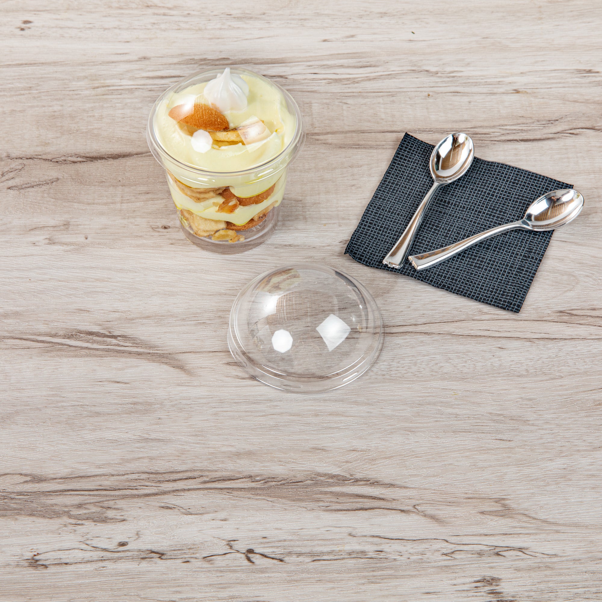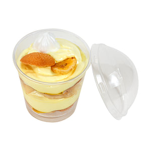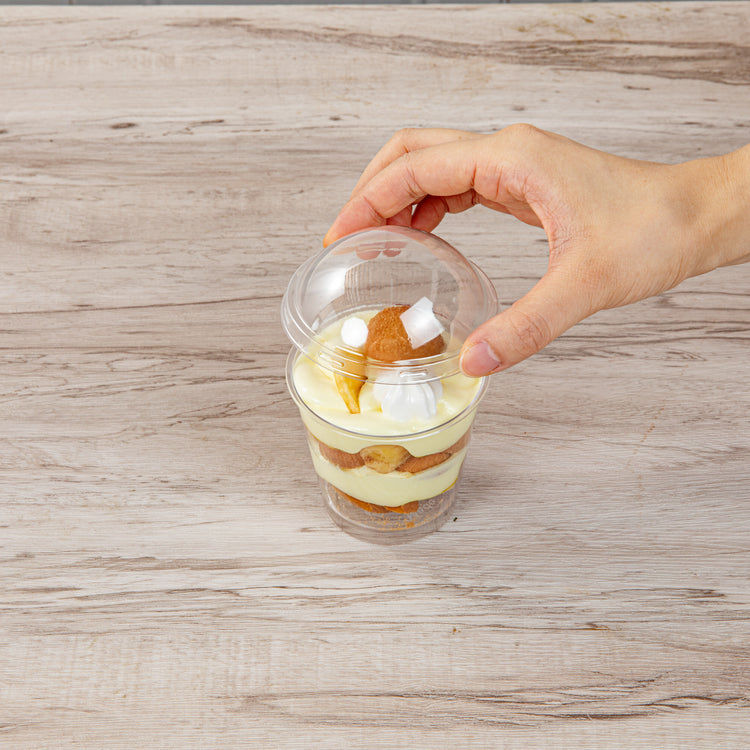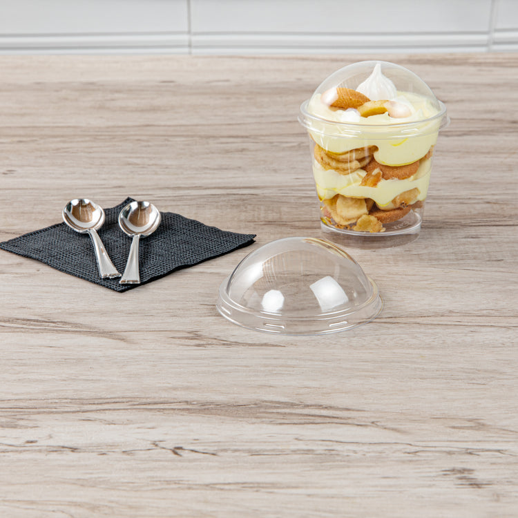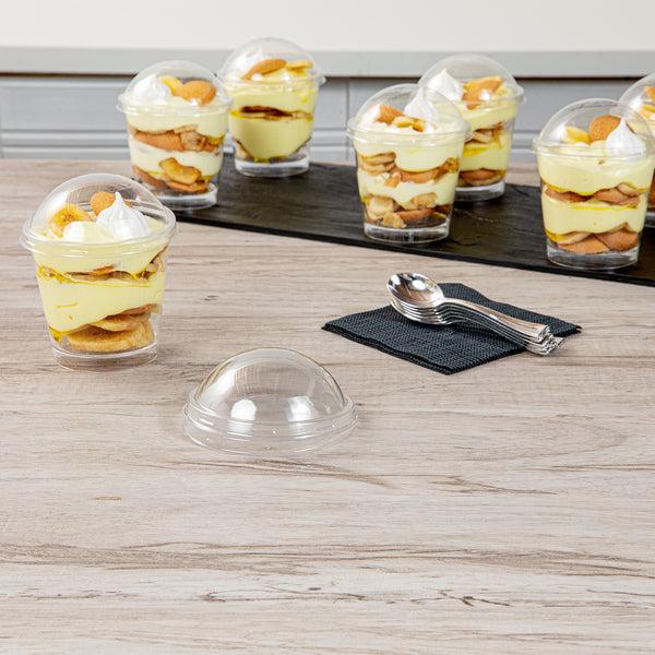 Elevate your dessert presentation with our Mini Serve Round Clear Plastic Dome Lids. Crafted from durable PS plastic, these dome lids are sturdy and are perfect for outdoor events or takeaway services. The dome design of these plastic lids allows you to decorate the treats and provides easy stacking, saving valuable space in your kitchen or display counter. Suitable for cold foods, these recyclable clear dome lids help maintain the freshness and quality of your culinary creations. With a clear finish, these disposable plastic lids allow customers to easily view their selected treats, enhancing their dining experience. These recyclable clear dome lids measure 3 inches in diameter by 1.25 inches in height, fitting perfectly with our 6-ounce dessert cups (RWP1414C-25). Sold in a 25 count box. Dessert cups are available and sold separately.