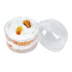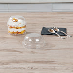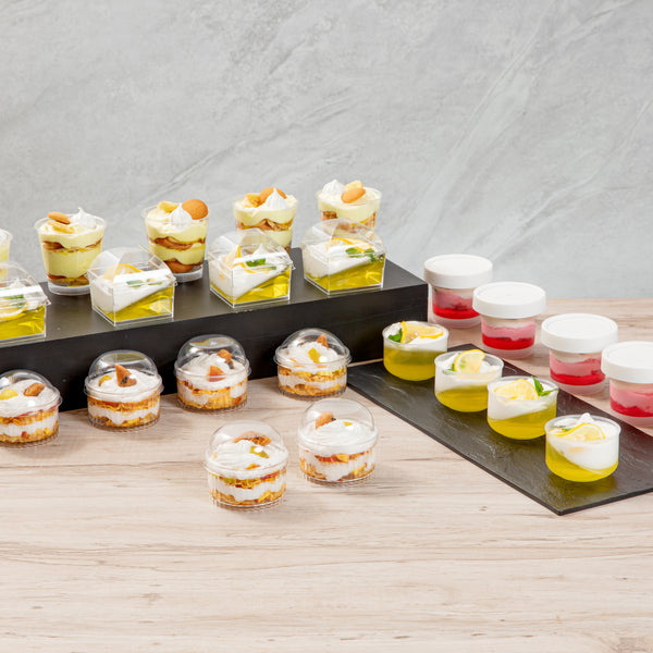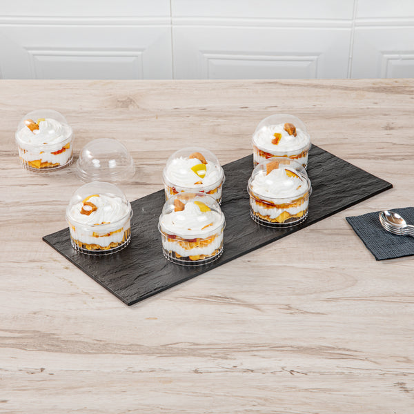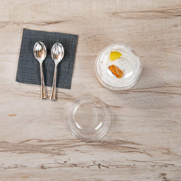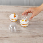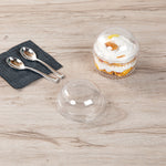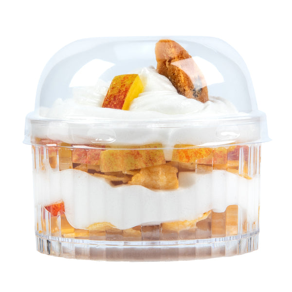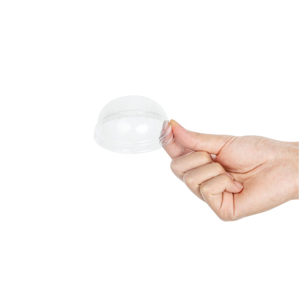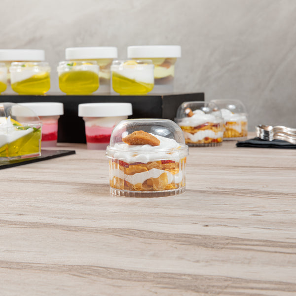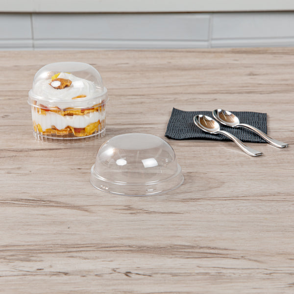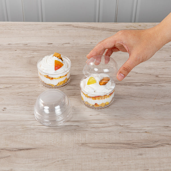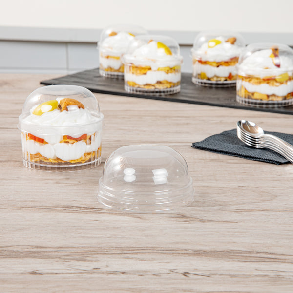 Elevate your dessert presentations with our Mini Serve Round Clear Plastic Dome Lids. These plastic dome lids, crafted from durable PS plastic, are built to withstand the rigors of any bustling kitchen or event. The clear dome lid's unique design not only showcases the appealing aesthetics of your cold food offerings but also provides extra space for dessert toppings. With a clear finish, these recyclable dessert cup lids allow for easy identification and display of your sweet treats, making them perfect for buffets, catering events, or dessert shops. The stackable design of these clear plastic lids ensures efficient storage, saving valuable space in your kitchen. These disposable plastic dome lids provide an easy cleanup after use. Measuring 3 inches in diameter by 1.25 inches in height, these clear dome lids are designed to pair perfectly with our 4-ounce fluted dessert cups (RWP1416C-25), creating a uniform and professional look. Sold in a 25 count box. Dessert cups are available and sold separately.