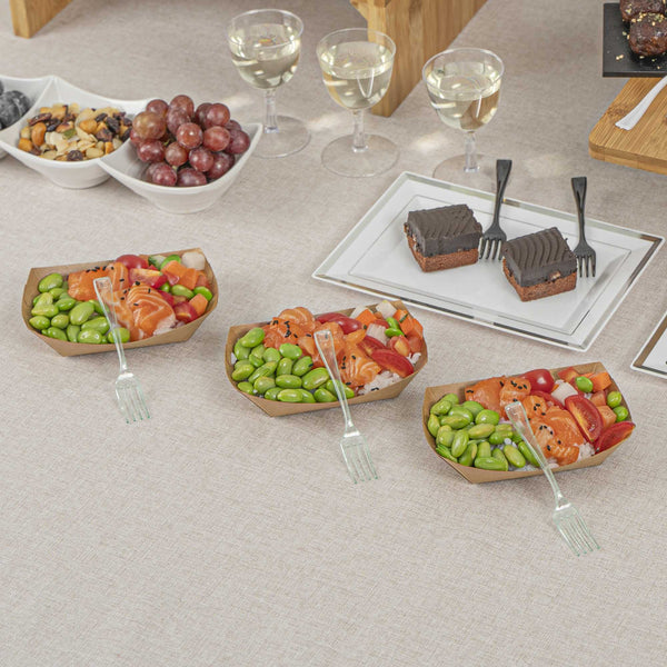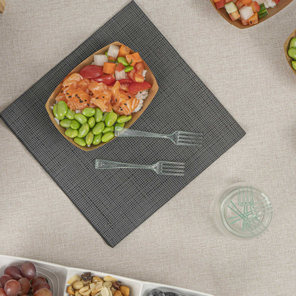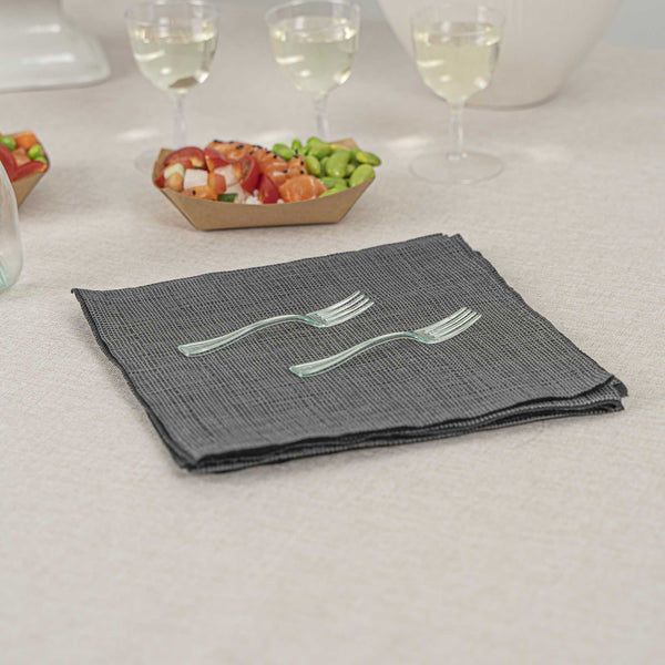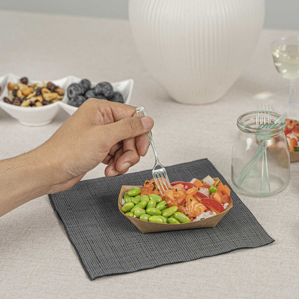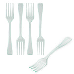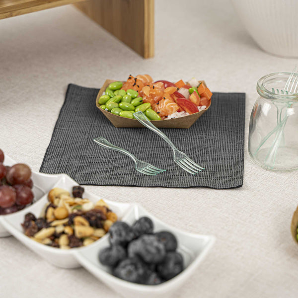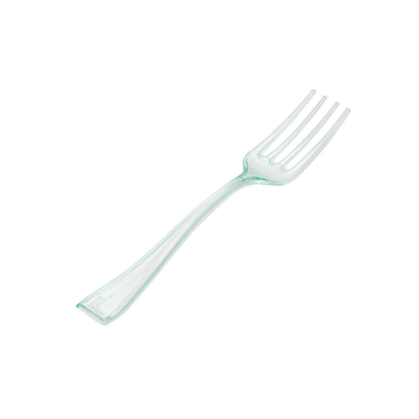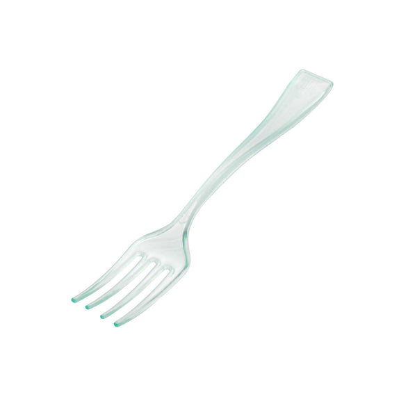 Give your hors d'oeuvres and miniature desserts a rejuvenating makeover with our Mini Serve Seagreen Plastic Mini Forks. Featuring a glass-like seagreen finish, these small plastic forks are the perfect finishing touch for upscale banquets and catering events. The high-quality plastic construction of these premium plastic forks ensures that they stay strong against the weight of heavy forkfuls of polenta and big bites of chocolate souffle. These mini plastic forks are recyclable and conveniently disposable, ensuring quick and easy event prep and cleanup. Measuring 4 inches long, you can use these versatile small forks for appetizers, tapas, desserts, and more. Sold in a 100 count box.