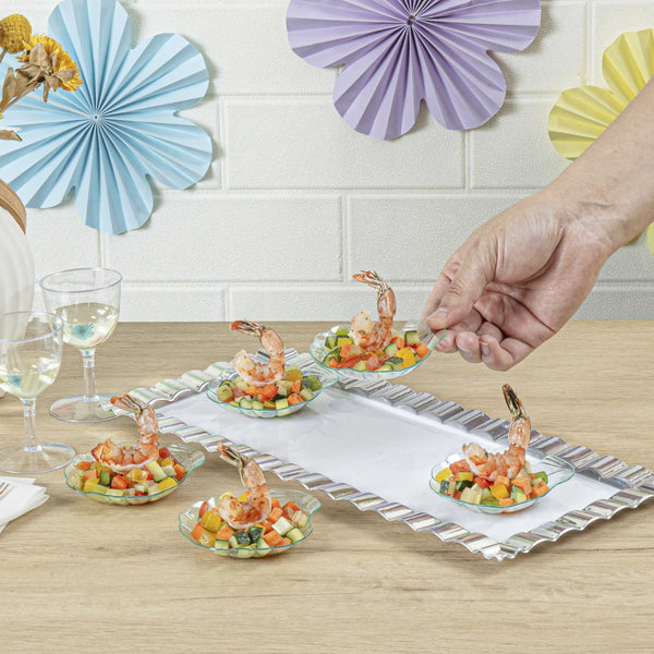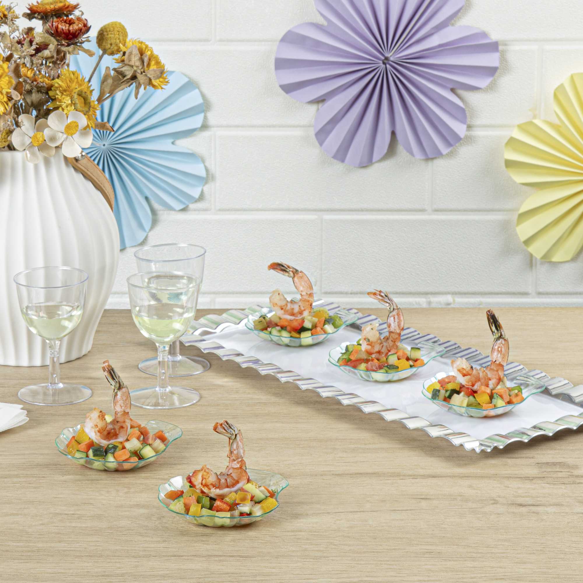 Display your tantalizing appetizers with our Mini Serve Seagreen Plastic Shell Plates. With their compact seashell shape, these appetizer plates are perfect for serving bite-sized seafood samples. These disposable plastic plates are constructed from durable plastic, ensuring easy recyclability. The depth of these elegant appetizer plates allows them to double as sauce plates or tasting cups. Plus, these disposable snack plates are suitable for use as stylish condiment containers. These sauce plates feature a realistic seashell design, adding an elegant touch to food-tasting events. The chic seagreen finish of these plastic sauce dishes enhances the presentation of even simple sauces like ketchup, soy sauce, or barbecue sauce. these plastic appetizer plates measure 3.25 inches in length and 3.25 inches in width. Sold in a 100 count box.