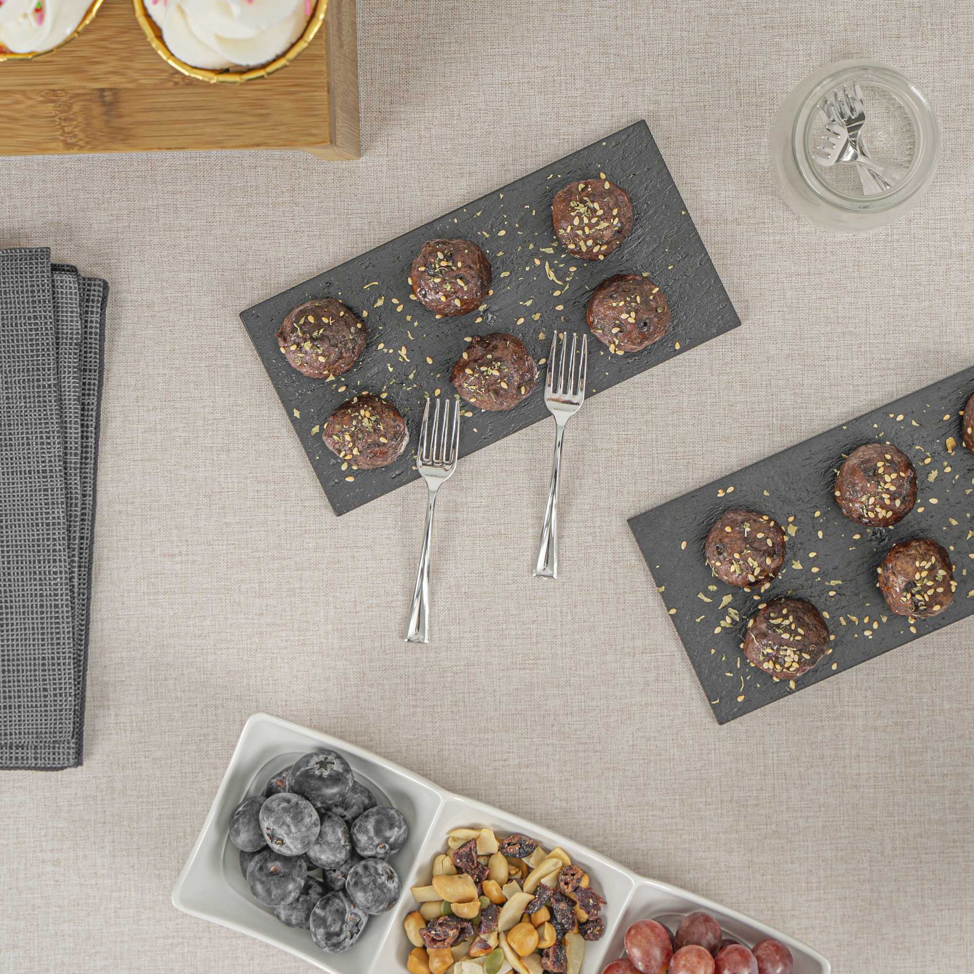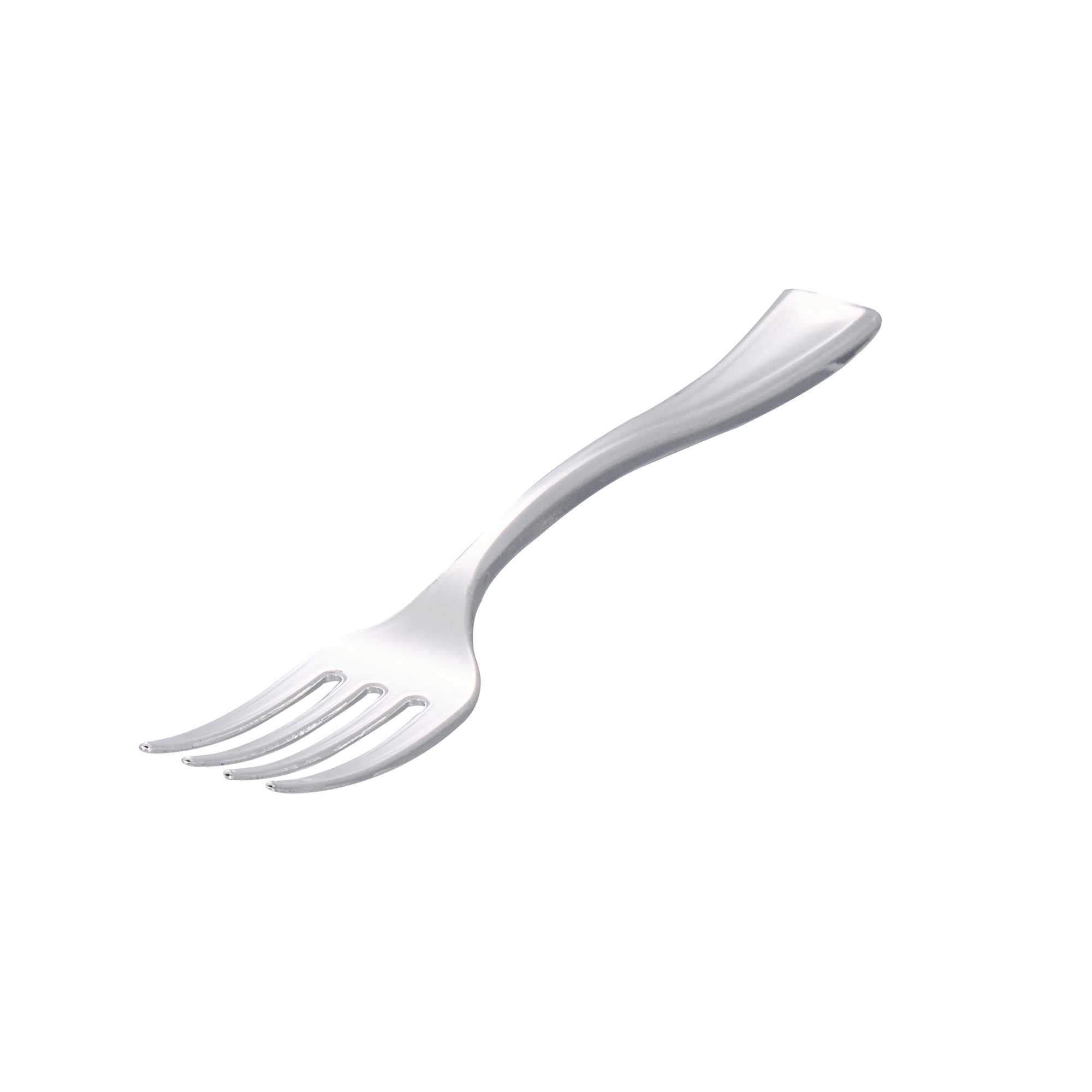 Elevate the look of your table setting with our Mini Serve Silver Plastic Mini Forks. Featuring a shiny silver finish, these silver plastic forks are designed to effortlessly enhance the presentation of your tantalizing dishes. With their strong and sturdy handles, these cake forks are built to stand up to hefty bites of polenta and big scoops of gelato. Made from premium plastic, these appetizer forks are conveniently disposable and recyclable, making them a perfect flatware option for eco-conscious cafes, venues, and clients. Measuring 4 inches in length, these single-use forks are the ideal size to accompany miniature tuna tartare or personal-sized strawberry shortcakes. Shipped in a 100 count box.