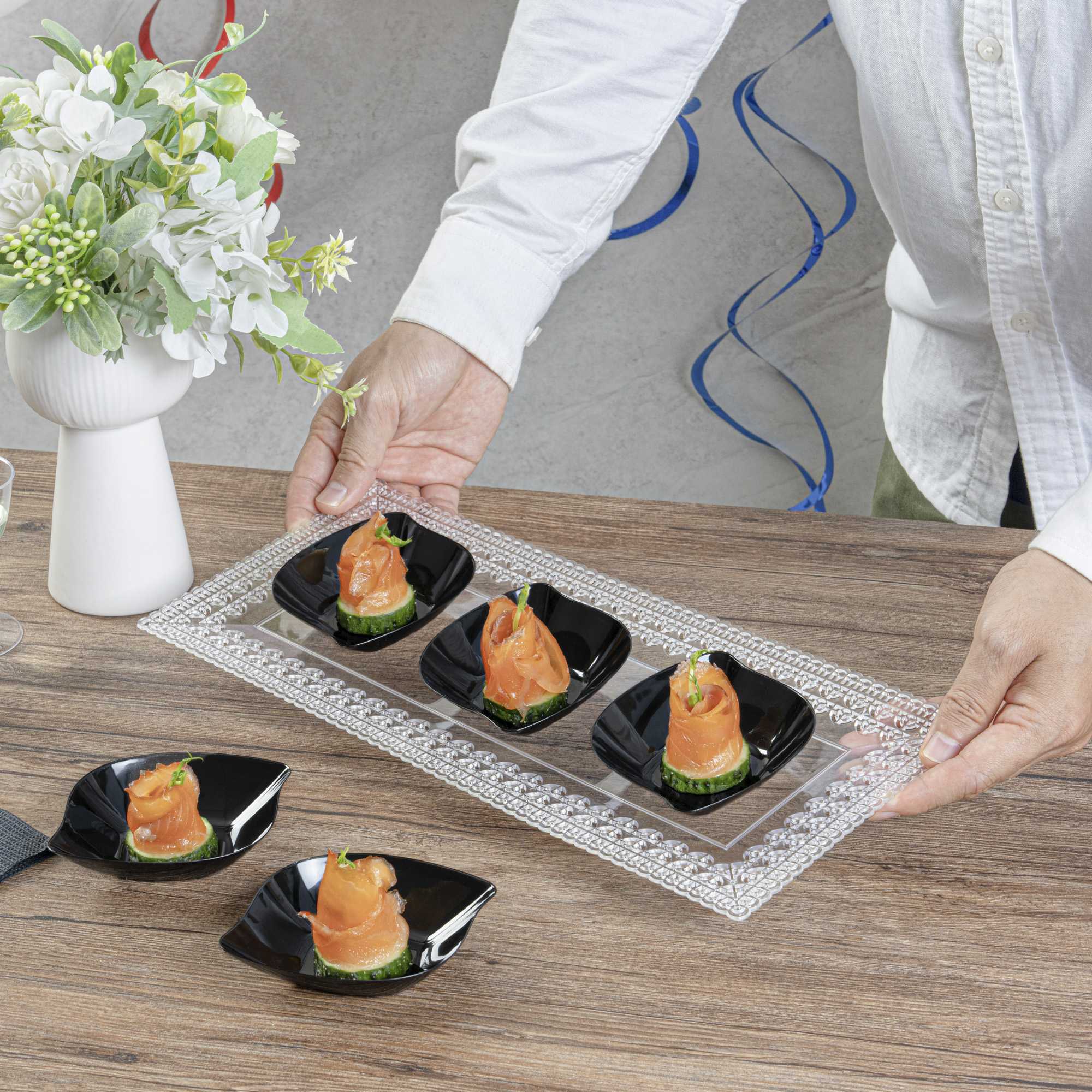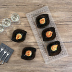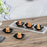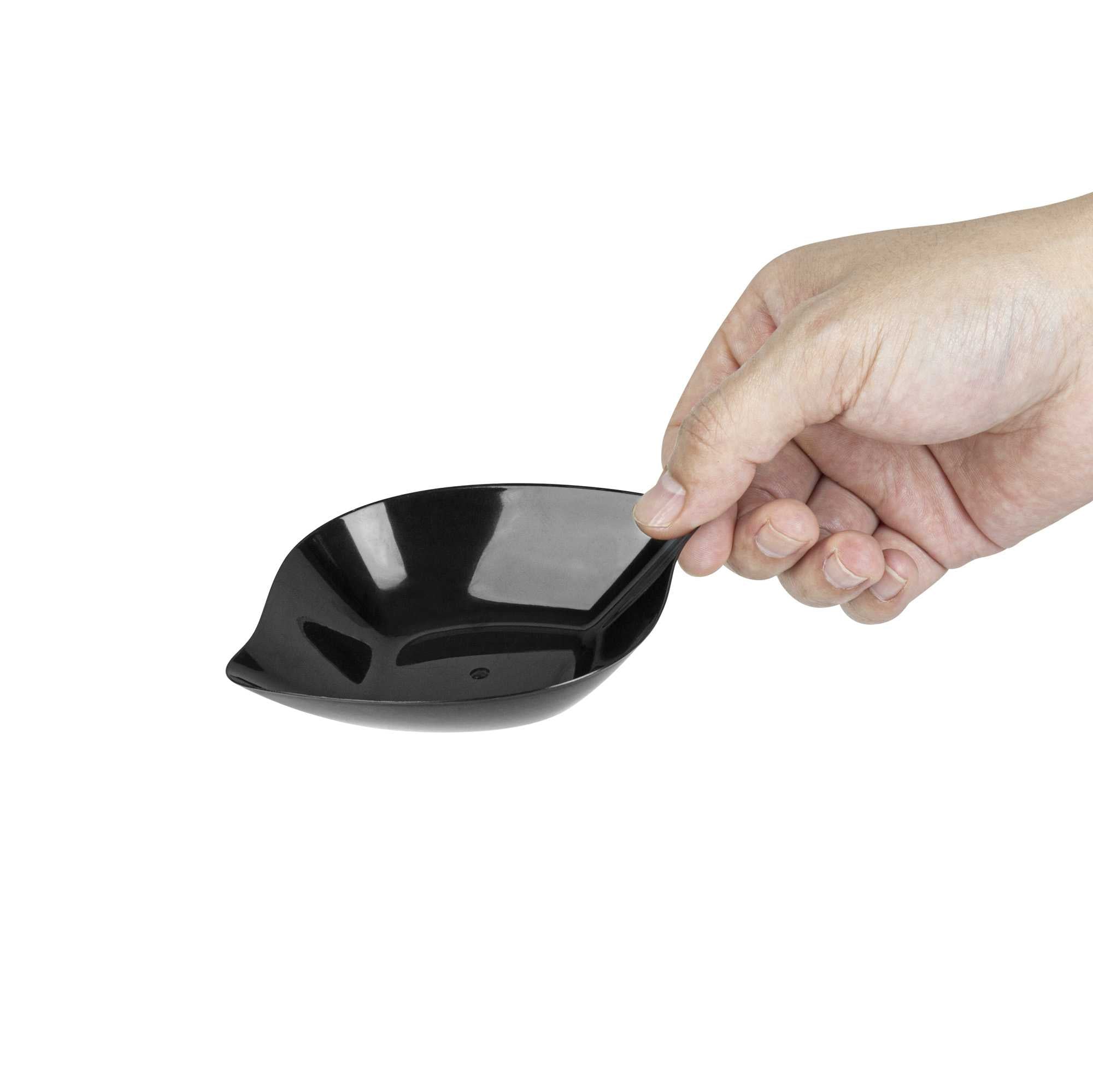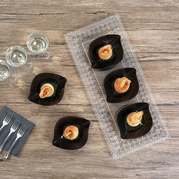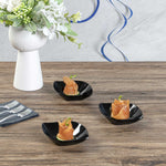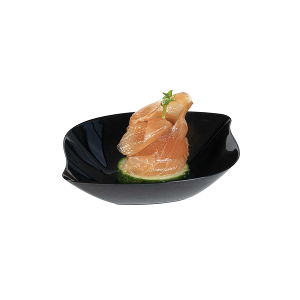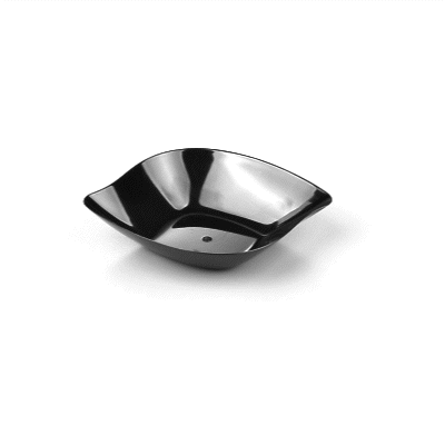 Enhance the charm and convenience of serving miniature appetizers with our Mini Serve Square Black Plastic Comma Plates. Constructed from plastic, these mini appetizer plates are the ideal sustainable option for any foodservice establishment. Featuring a unique askew comma design for a distinctive refined aesthetic, these plastic appetizer plates give an upscale appearance to your food presentations. Sturdy and dependable, these black plastic plates do not chip and break. Made to serve fruit, shrimp, desserts, salads, and other bite-sized fare, these disposable mini black plastic bowls ensure elevated presentation and easy cleanup afterward. With a sleek black finish, these plastic bowls with a distinct design make for an elegant addition to any catered event or restaurant. These black disposable plates measure 3.5 inches in length by 4.5 inches in width. Sold in a 100 count box.