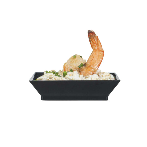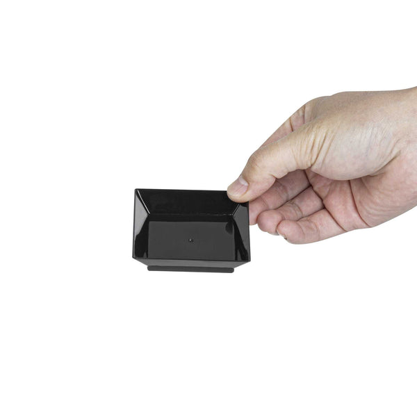 Use our Mini Serve Square Black Plastic Mini Modern Plates as a beautiful blank canvas to artfully plate your fare for catered events or cocktail parties. These durable square plastic plates are designed to be sturdy without chipping or breaking during use. These sophisticated disposable plates feature raised edges that are great for keeping your plating and presentation chic and organized. Plus, the protective edges of these starter plates help to ensure easy and mess-free serving. With a sophisticated black finish, these medium-sized plastic plates are the perfect backdrop for displaying your delectable fares. Measuring 2.5 inches in length by 2.5 inches in width, these plastic plates are ideal for all catering services. Sold in a 100 count box.