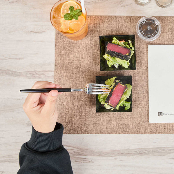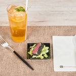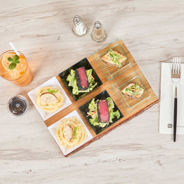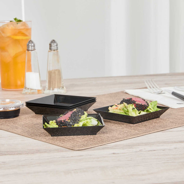 Artfully plate unique appetizers using our Mini Serve Square Black Plastic Small Modern Plates. Perfect for catering events, banquets, or restaurants, these sturdy disposable plates are made from high-quality plastic and are recyclable for an easy and eco-friendly cleanup. Featuring a squared design and glossy black finish, these square appetizer plates add a high-end look to small servings of stuffed dates, canapes, and tarts. The raised edges of these black plastic plates are ideal for mess-free serving. To keep dishes intact and stop spills, these disposable plates are crack-resistant and leak-resistant. These square appetizer plates can be stacked together for easy space-saving storage. Measuring 3.9 inches in length by 3.9 inches in width, these black plastic plates are sold in a 100 count box.