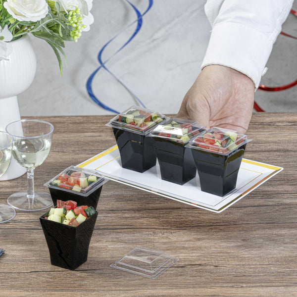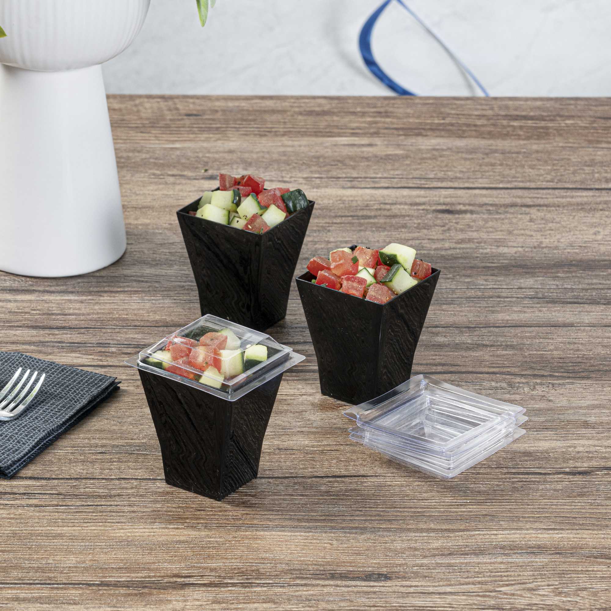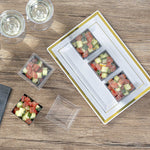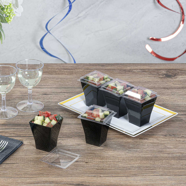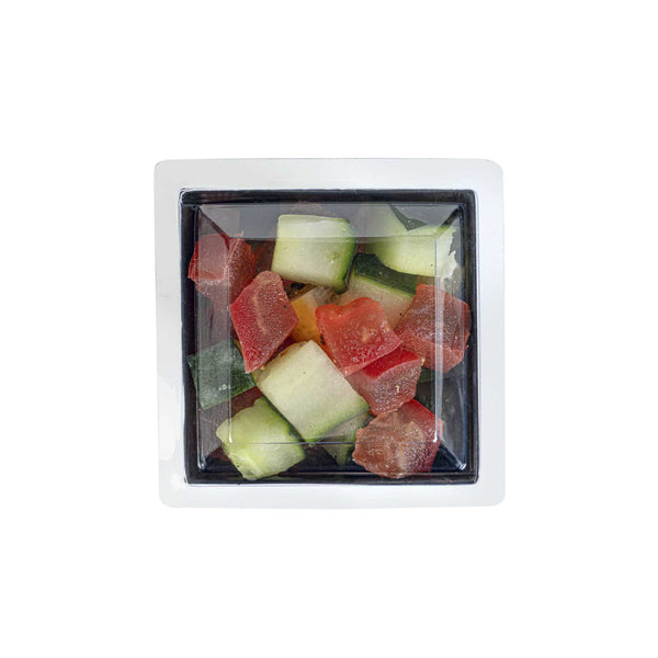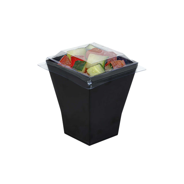 Secure your delicate desserts with our Mini Serve Square Clear Plastic Lids. These small plastic lids were created to precisely fit our Mini Serve Bonito Cups (SKU: RWP0032B, RWP0032G). Constructed from premium plastic, these small clear lids are firmly locked onto our Mini Serve Bonito mini dessert cups. Featuring a crystal clear finish and a square modern design, these small food containers stylishly protect your miniature appetizers, desserts, and more. Complete our Mini Serve Bonito Collection of plastic cups with these lids to safely serve tasty treats at your cafe, buffet, or catered event. These plastic lids measure 1.75 inches long by 1.75 inches wide. Sold in a 100 count box. Matching cups are available and sold separately.