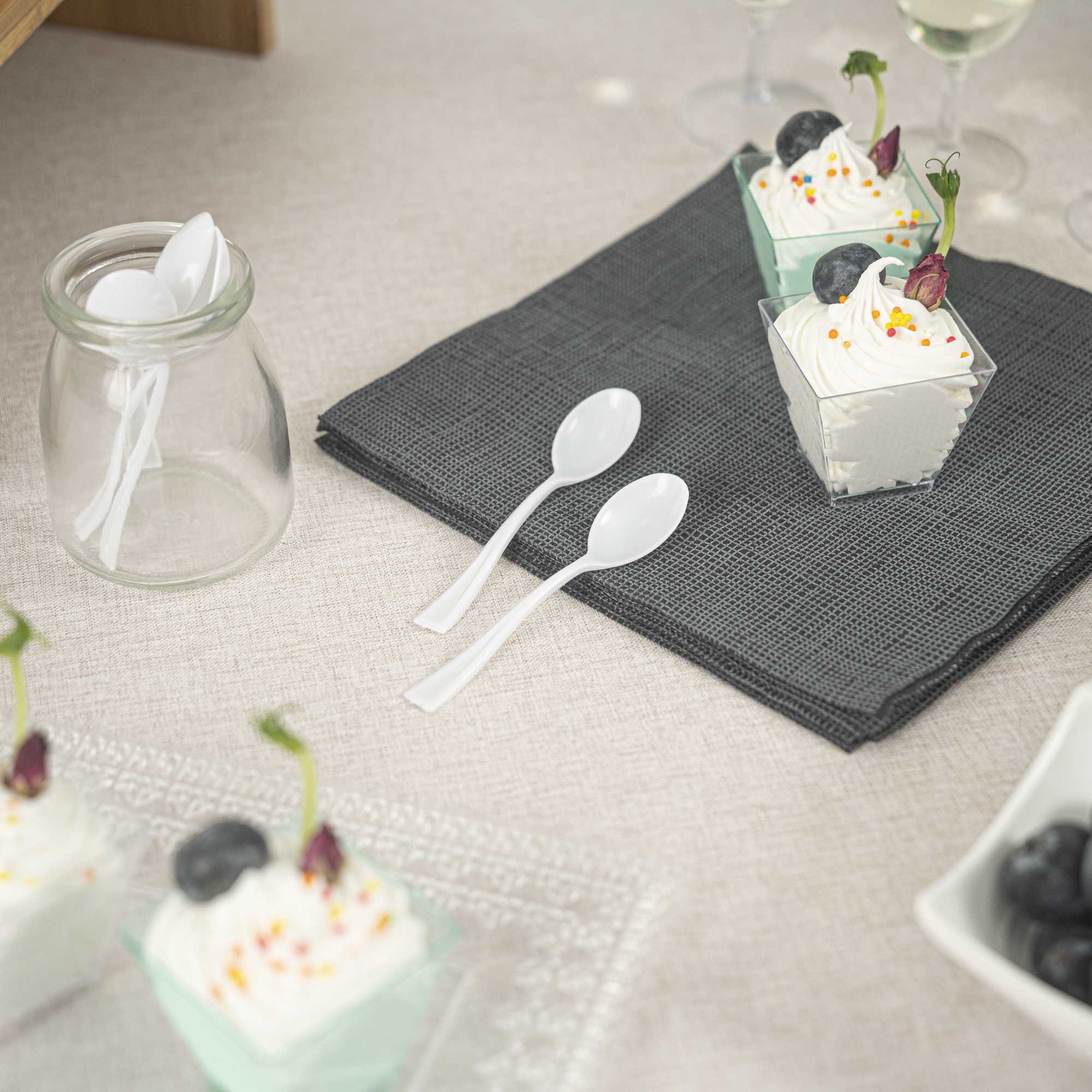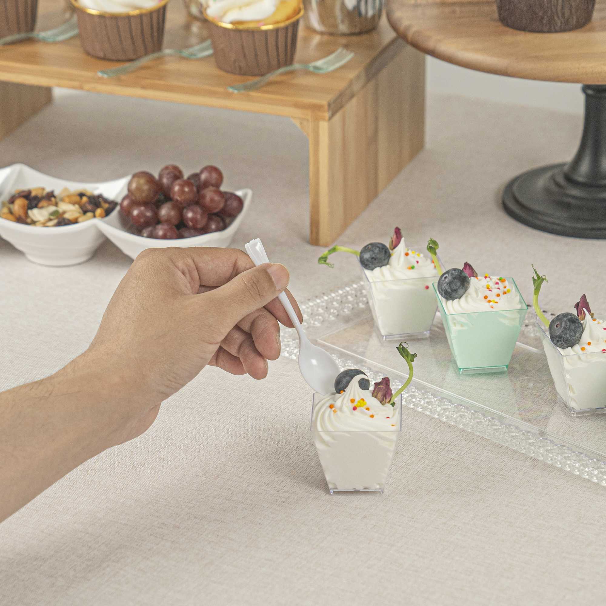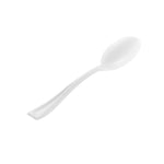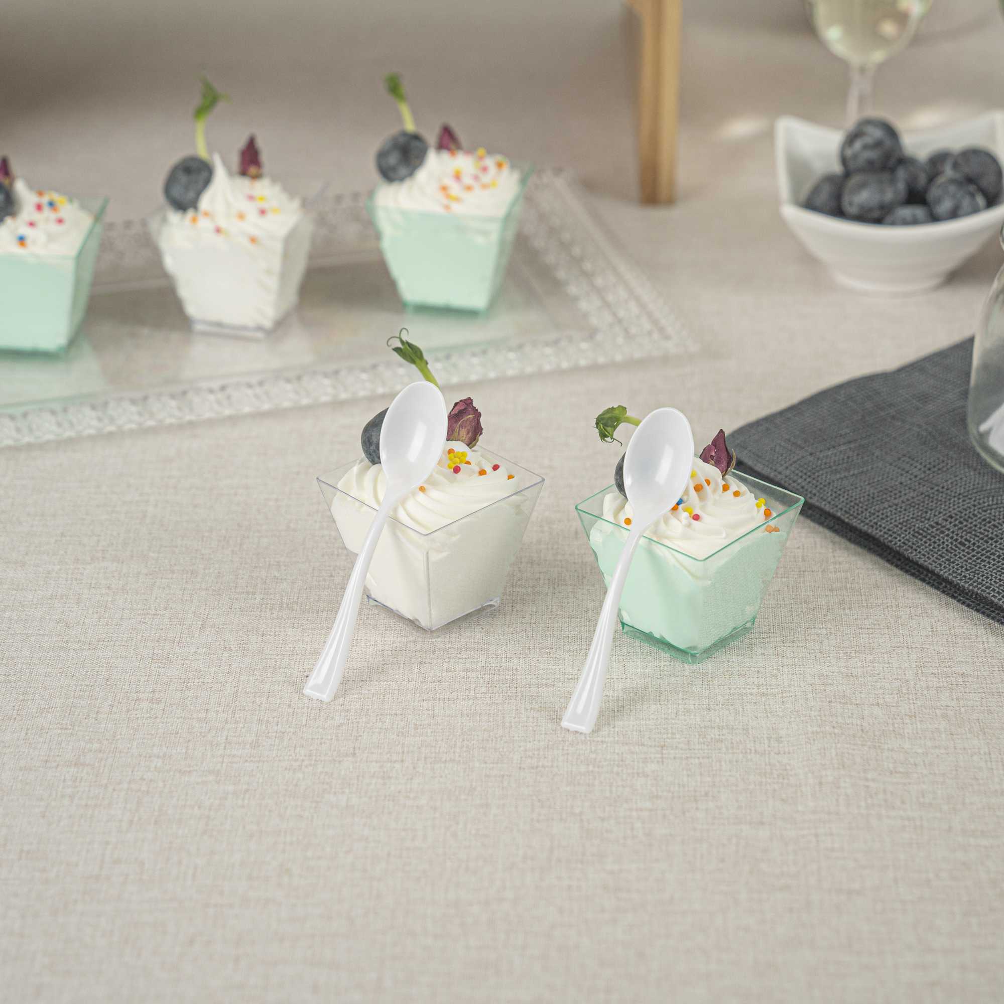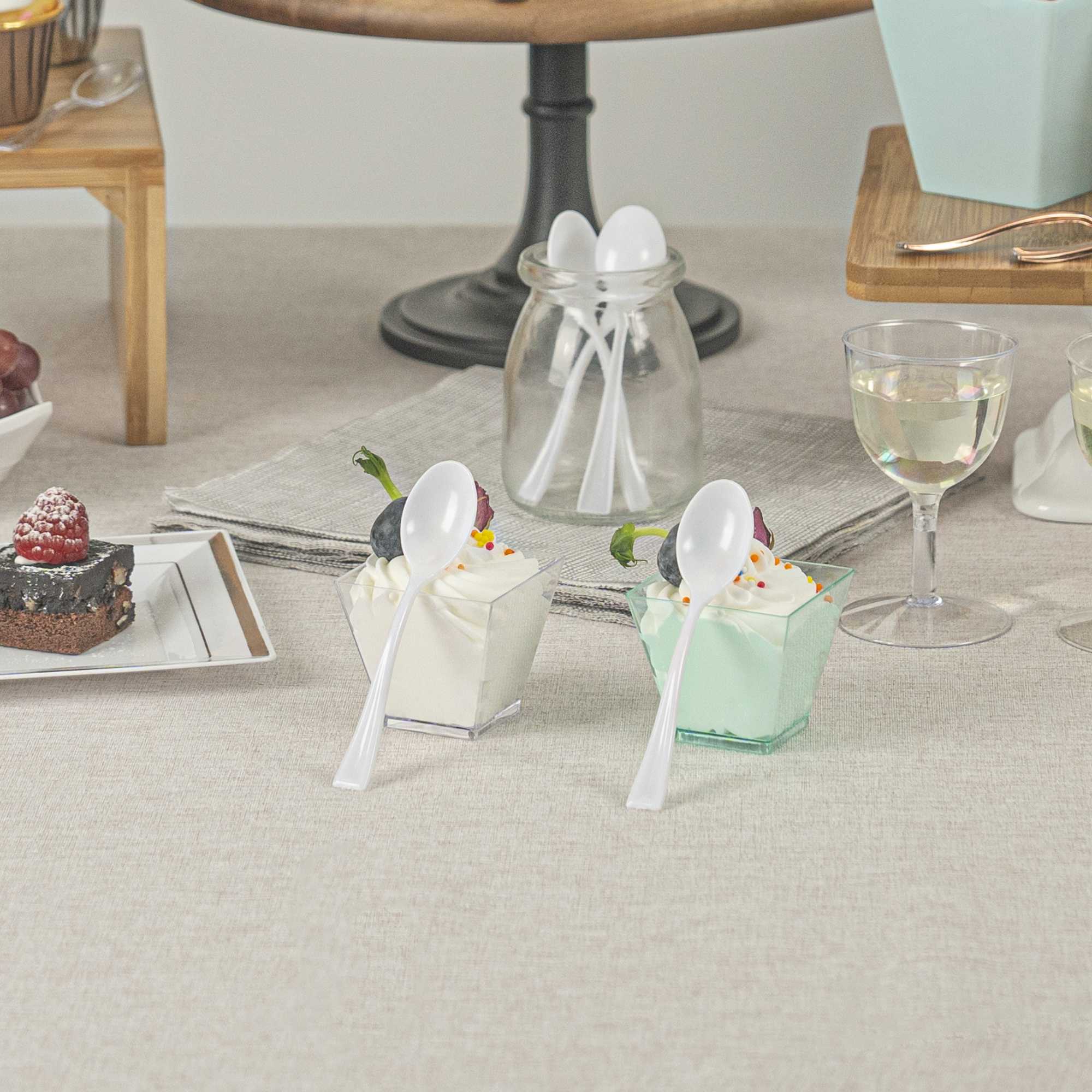 Infuse an essence of refined sophistication with our Mini Serve White Plastic Mini Spoons. Crafted from premium plastic, these mini-plastic spoons are durable and strong. These plastic spoons for dessert are recyclable, reducing your carbon footprint. These durable plastic spoons have a high-quality construction that makes them compatible with cold foods. The white finish of these dessert spoons lets you conveniently coordinate them with any venue and tablescape. Each clear plastic spoon measures 4 inches in length. Sold in a 100 count box.