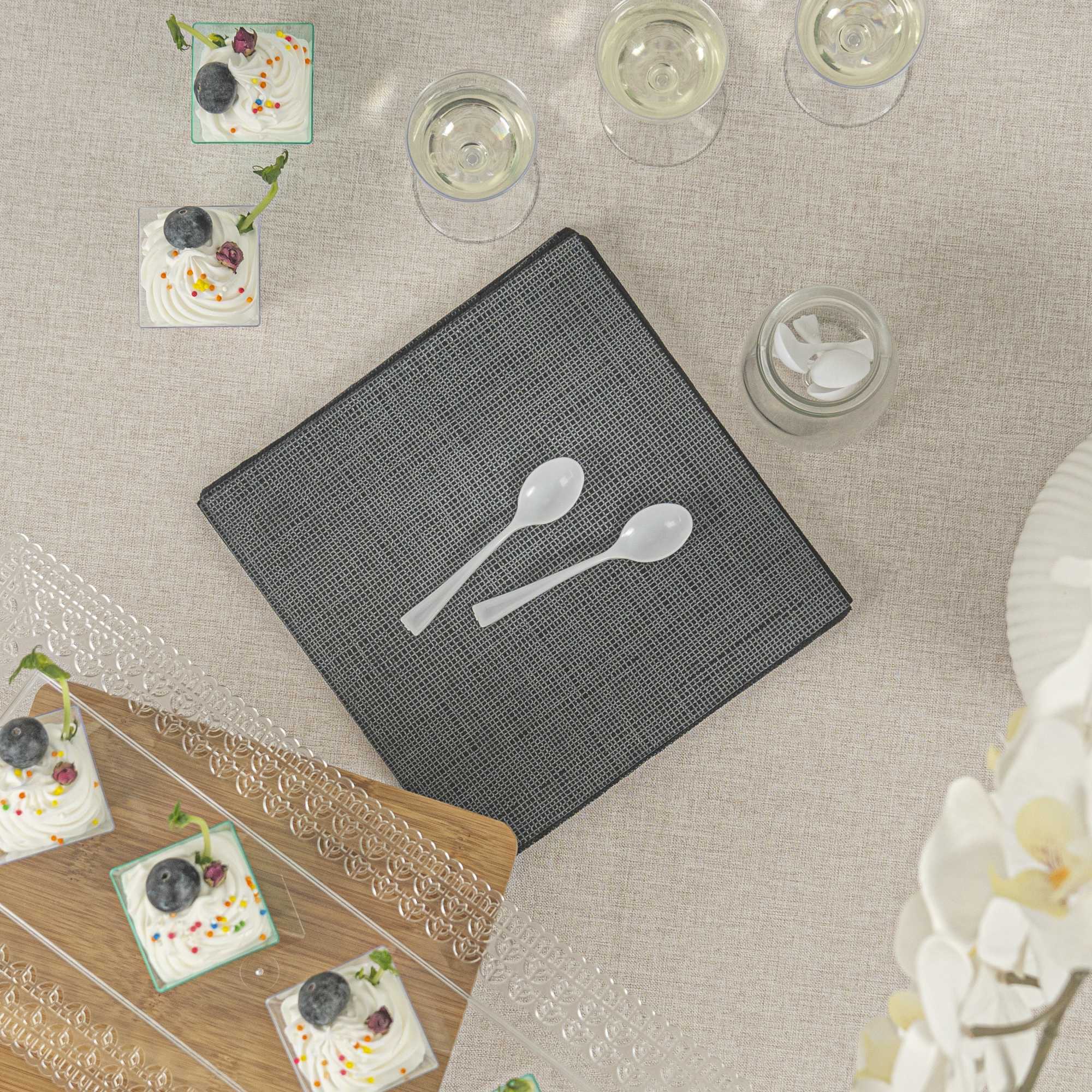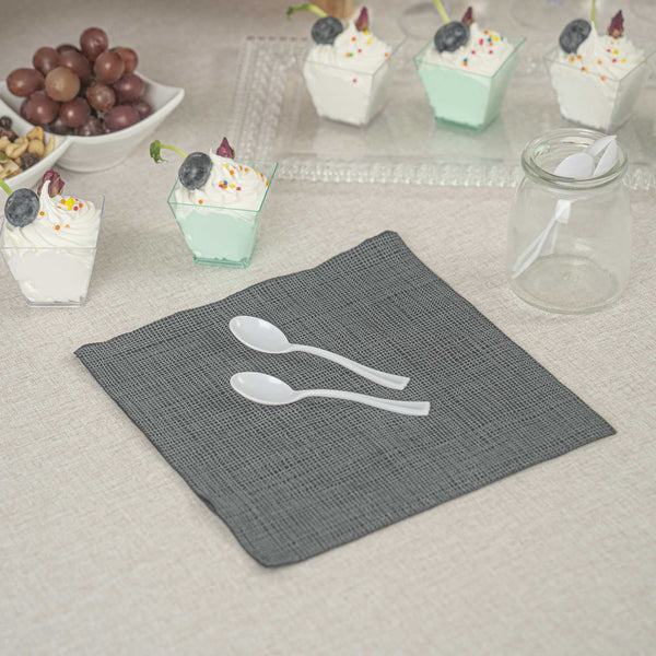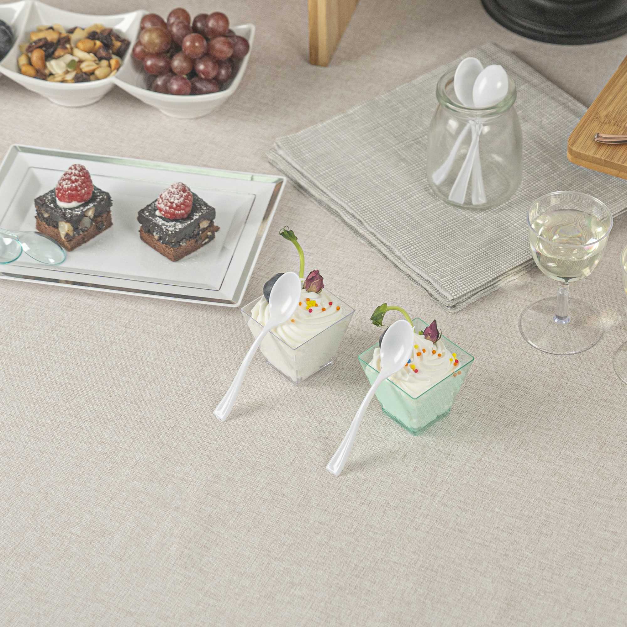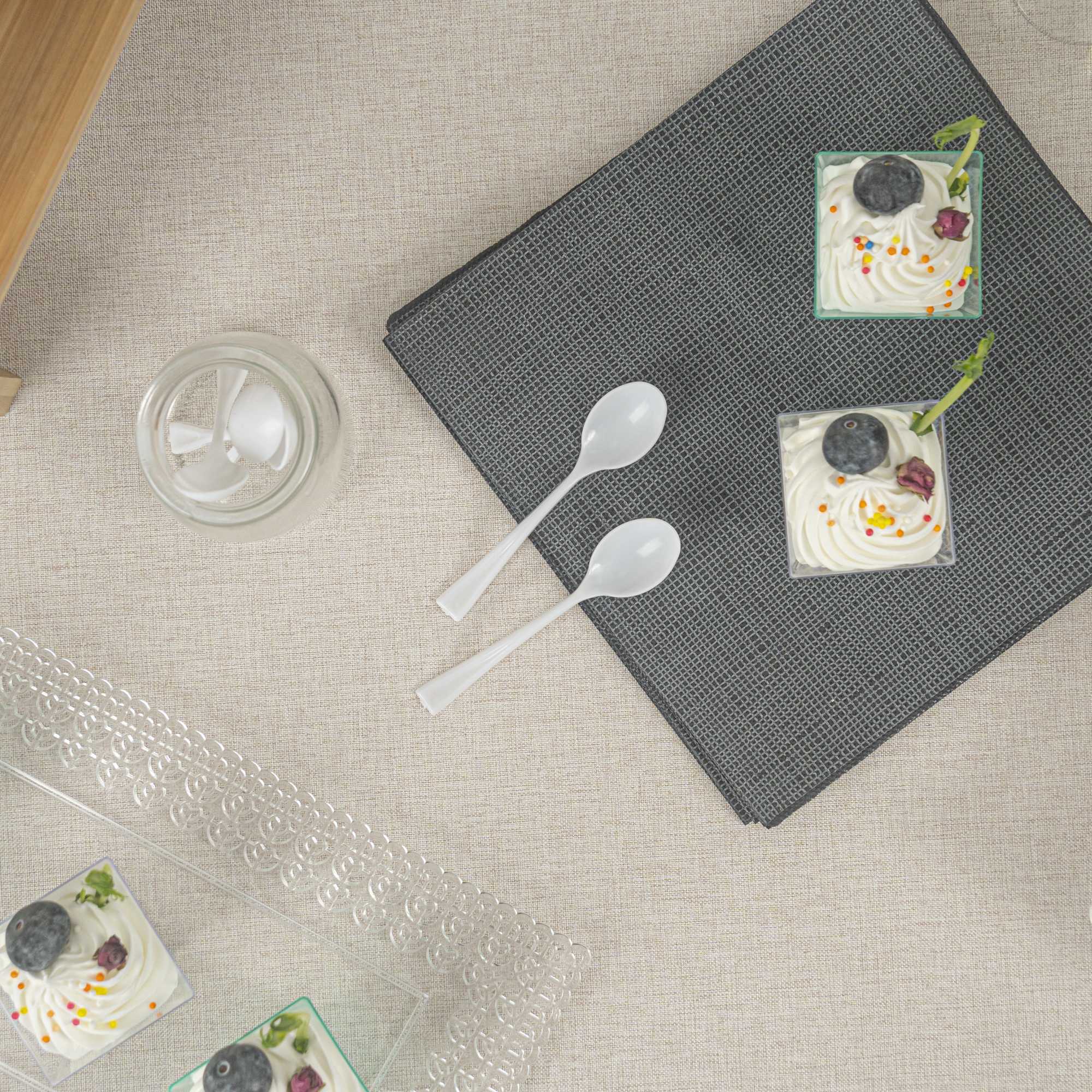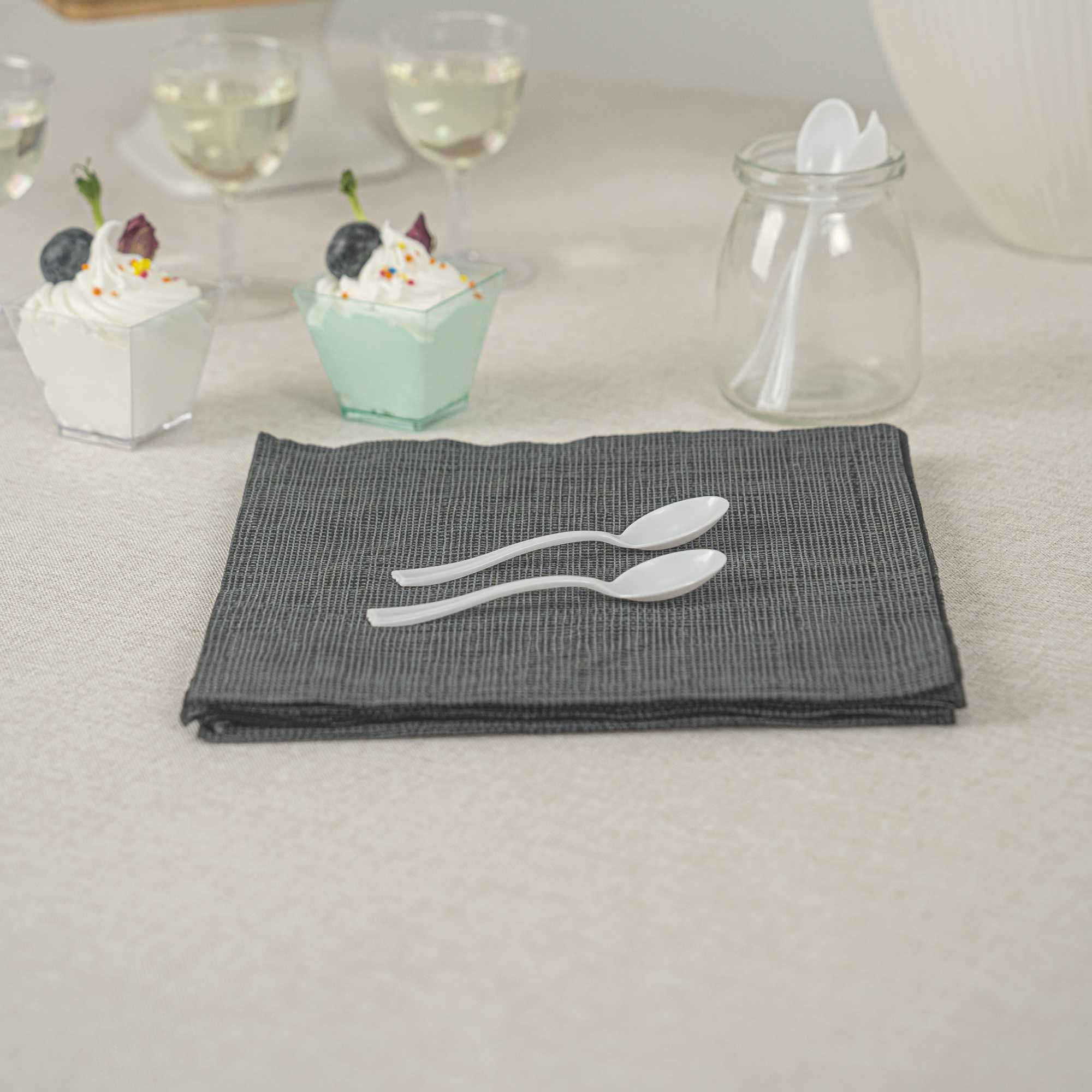 Infuse an essence of refined sophistication with our Mini Serve White Plastic Mini Spoons. Crafted from premium plastic, these mini-plastic spoons are durable and strong. These plastic spoons for dessert are recyclable, reducing your carbon footprint. These durable plastic spoons have a high-quality construction that makes them compatible with cold foods. The white finish of these dessert spoons lets you conveniently coordinate them with any venue and tablescape. Each clear plastic spoon measures 4 inches in length. Sold in a 100 count box.