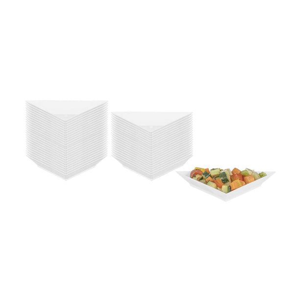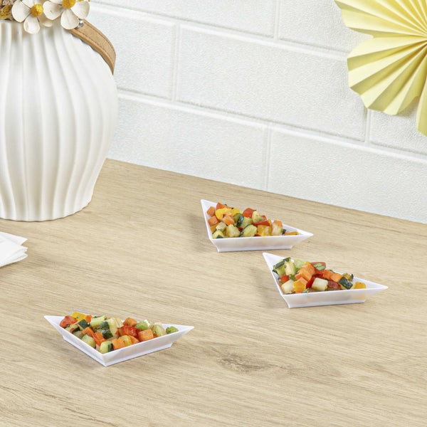 Showcase your culinary gems with our Mini Serve White Plastic Mini Triangolo Appetizer Plates. Composed of premium PS plastic, these mini plates impart durability and protection against warping when presenting foods. The sleek white finish graces these triangolo plates, heightening the visual charm of your delectable appetizers. Designed to accommodate cold fare, these mini plates adeptly present chilled appetizers and icy desserts. The disposable feature of these white plastic plates ensures convenient and quick cleanup after any event. Measuring a 4 inches in length by 2 inches in width, these mini plates display your handcrafted treats with grace and finesse. Sold in a 100 count box.
