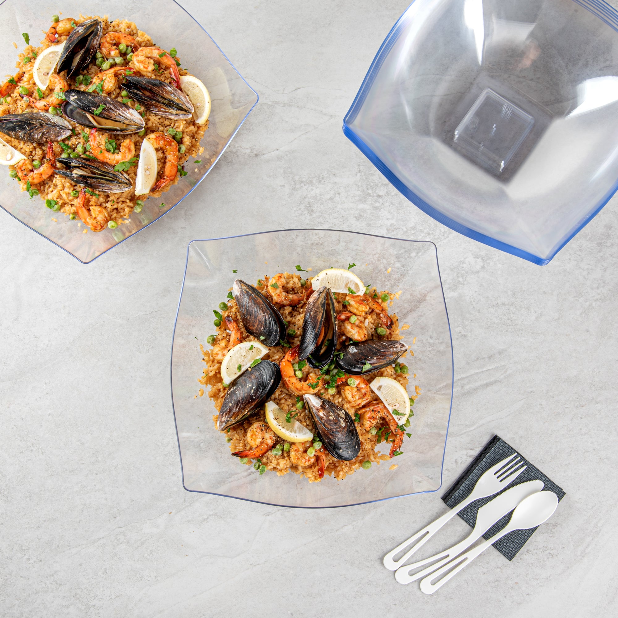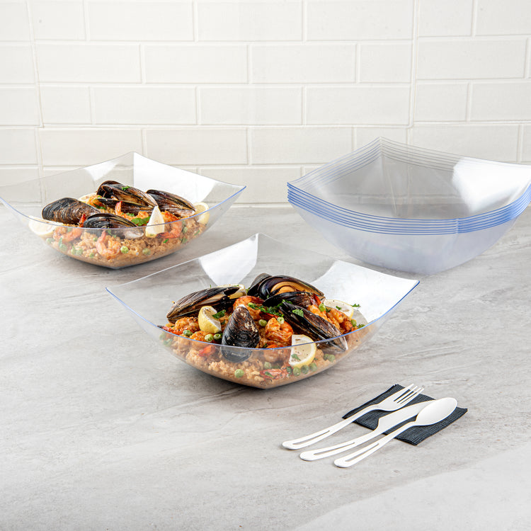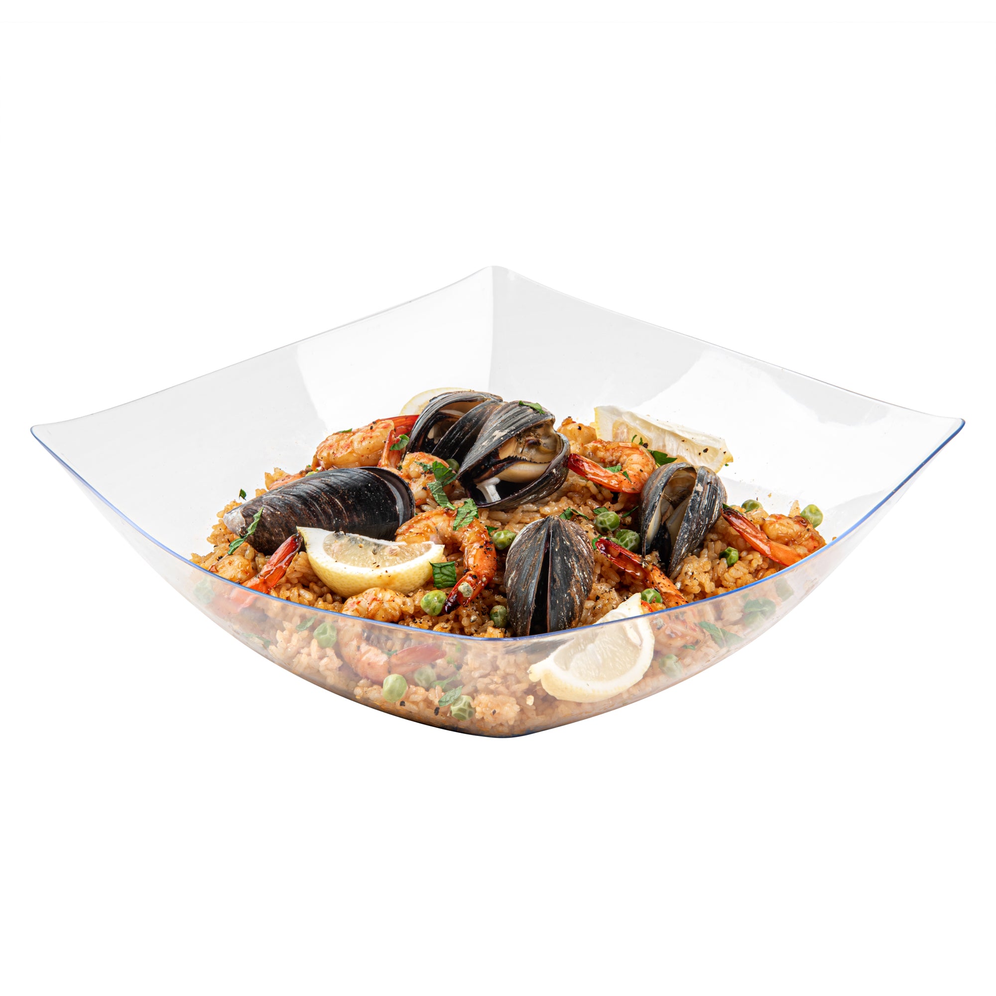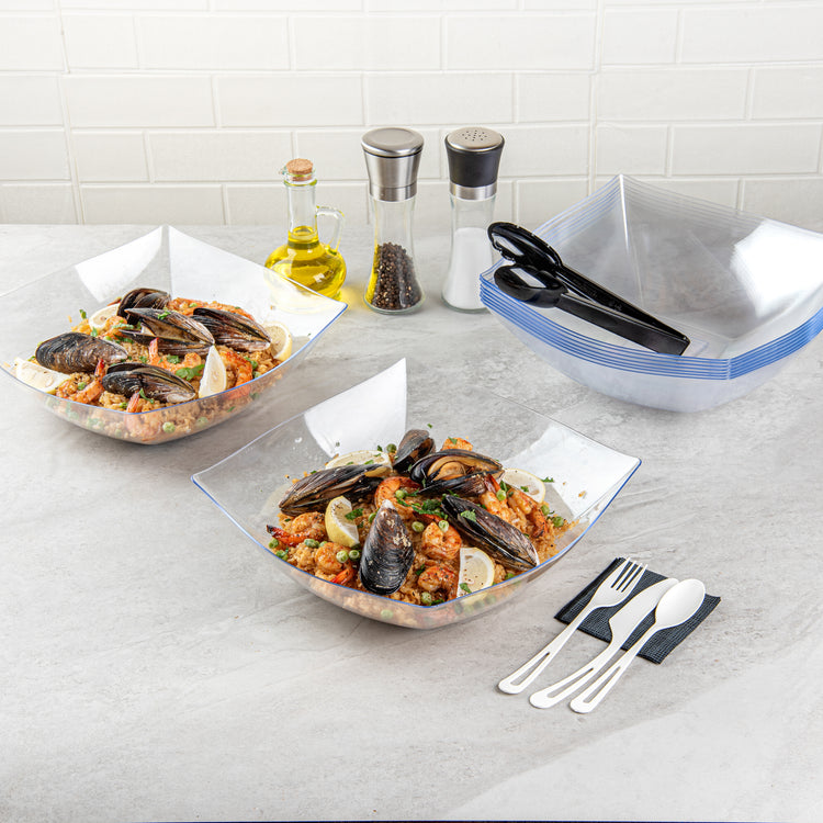 Experience elegance in dinnerware with our Moderna 128-ounce Square Black Plastic Serving Bowls. These durable polystyrene bowls effortlessly handle hefty portions. Suitable for a wide range of warm and cold foods up to 150F, these serving bowls are perfect for serving poke or smoothie bowls. With a greaseproof design, these clear plastic bowls prevent oil leakage. Disposable for easy cleanup, these dinner bowls promote sustainability as recyclable options. Enhancing the food presentation with their sleek black finish, these recyclable plastic bowls add sophistication to your enticing dishes. Measuring 12 inches in length by 12 inches in width by 4 inches in height, each square bowl has a capacity of 128 ounces. Shipped in a 10 count box.
