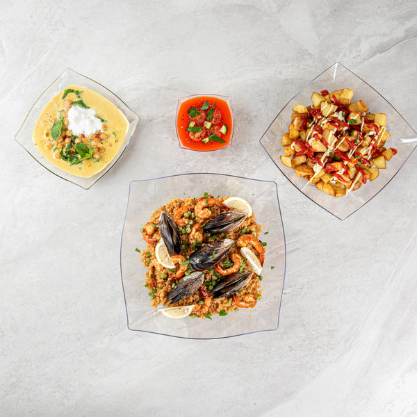 Showcase generous portions of vibrant dishes with our Moderna 128-ounce Square Clear Plastic Bowls. These large plastic bowls offer a clear construction that allows for a full view of your culinary presentation, making them perfect for salads, chilled pasta, or fruit assortments. Designed for warm and cold applications, they hold up well in temperatures up to 150°F, while the greaseproof characteristic feature keeps foods contained neatly. The transparent finish enhances presentation and is ideal for catering displays, hotel service, or self-serve stations. Each of these disposable square bowls measures 12 inches in length by 12 inches in width by 3.94 inches in height and has a capacity of 128 ounces. Sold in a 100 count box.