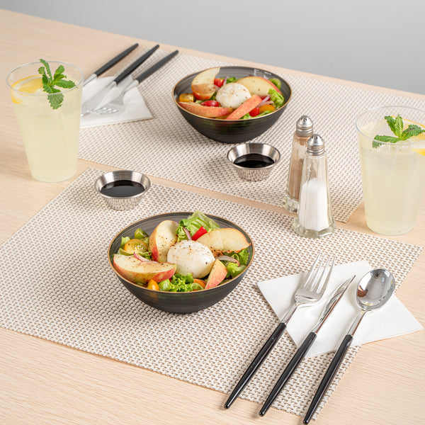 Effortlessly elevate any event with disposable bowls that combine convenience and elegance. Moderna Black Plastic Disposable Bowls with a Gold Rim offer a disposable design that ensures quick and efficient cleanup, saving you valuable time after your gatherings. These black plastic bowls feature a striking gold rim that enhances the presentation of any dish, providing an elegant touch to your tablescapes for weddings, parties, and catered events. With dimensions of 5.6 inches by 5.6 inches by 2 inches, these bowls are ideal for serving a variety of dishes in style. They are both durable and safe, making them perfect for foodservice professionals seeking reliable party serving bowls. Whether for family gatherings or holiday celebrations, these bowls are suitable for all occasions, ensuring a seamless dining experience. Each order includes 20 Moderna Black Plastic Disposable Bowls with a Gold Rim.