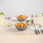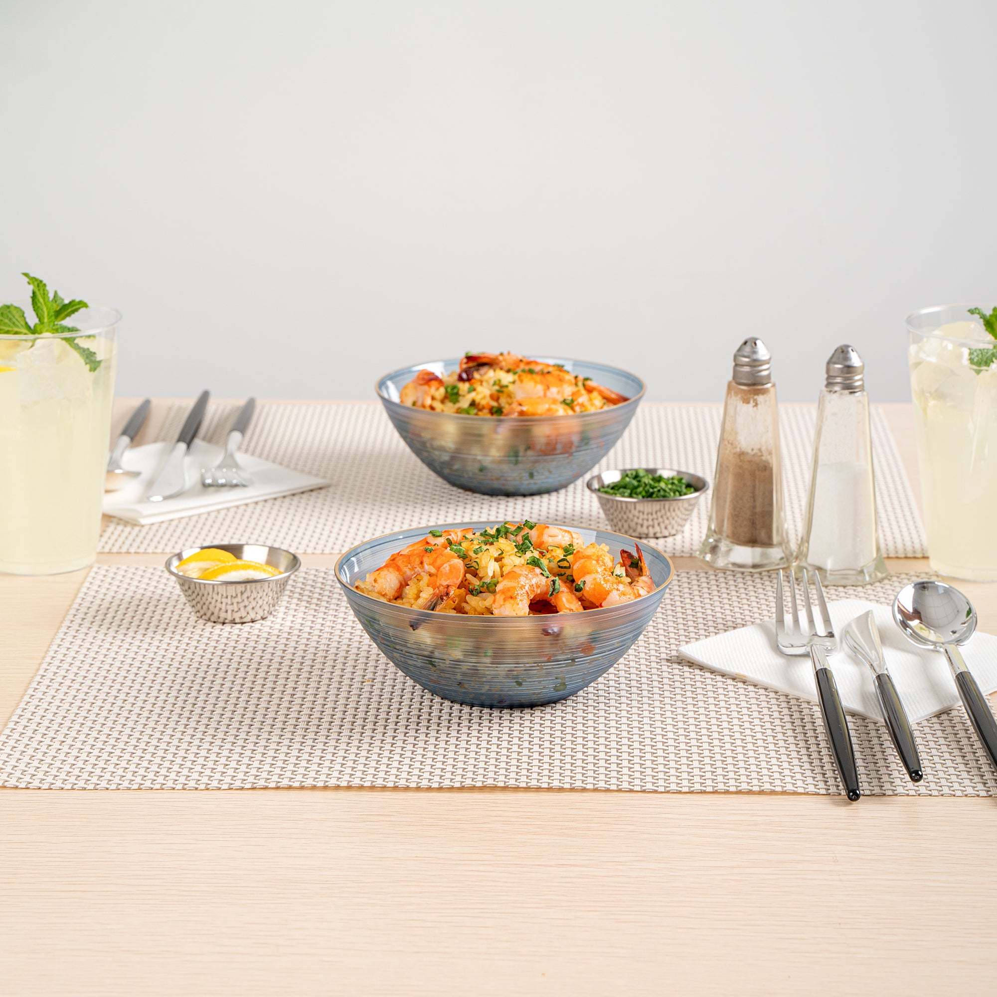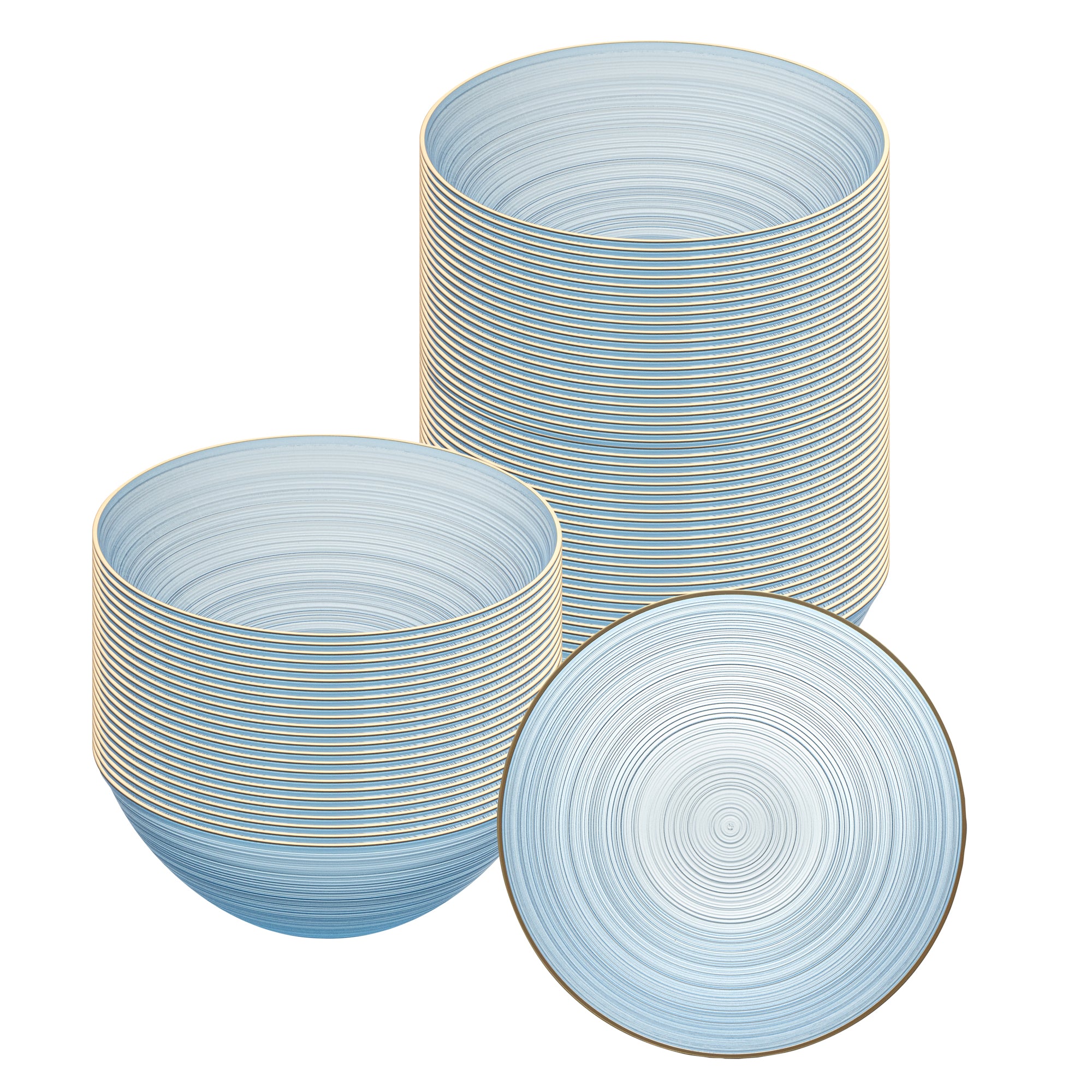 Effortlessly enhance event tablescapes with disposable plastic bowls. The Moderna Elegant Presentation Plastic Bowls feature a striking rippled design and a gold rim that elevates any occasion, providing an upscale appearance without the hassle of cleaning. Crafted from durable plastic, these bowls are a reliable choice for serving a variety of dishes with a secure-grip that ensures stability during busy service, making them ideal as party serving bowls. The translucent blue color complements diverse table decors, adding a stylish touch to any setup. With a 16-ounce capacity and measuring 5.6 inches in length and width, these plastic salad bowls are perfect for generous servings of soups, salads, or desserts, catering to a wide range of menu needs. The disposable design simplifies cleanup, making them a convenient option for high-volume events like weddings and catered gatherings, reducing labor costs. Each order includes 20 Moderna Elegant Presentation Plastic Bowls.