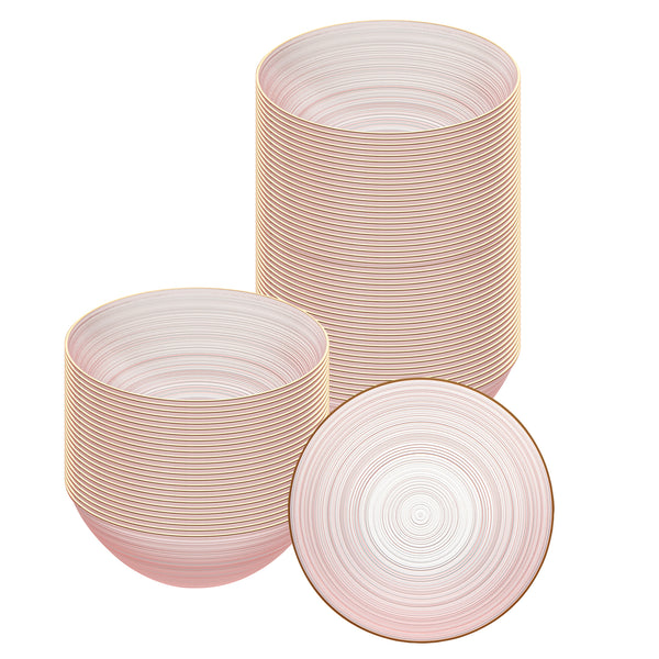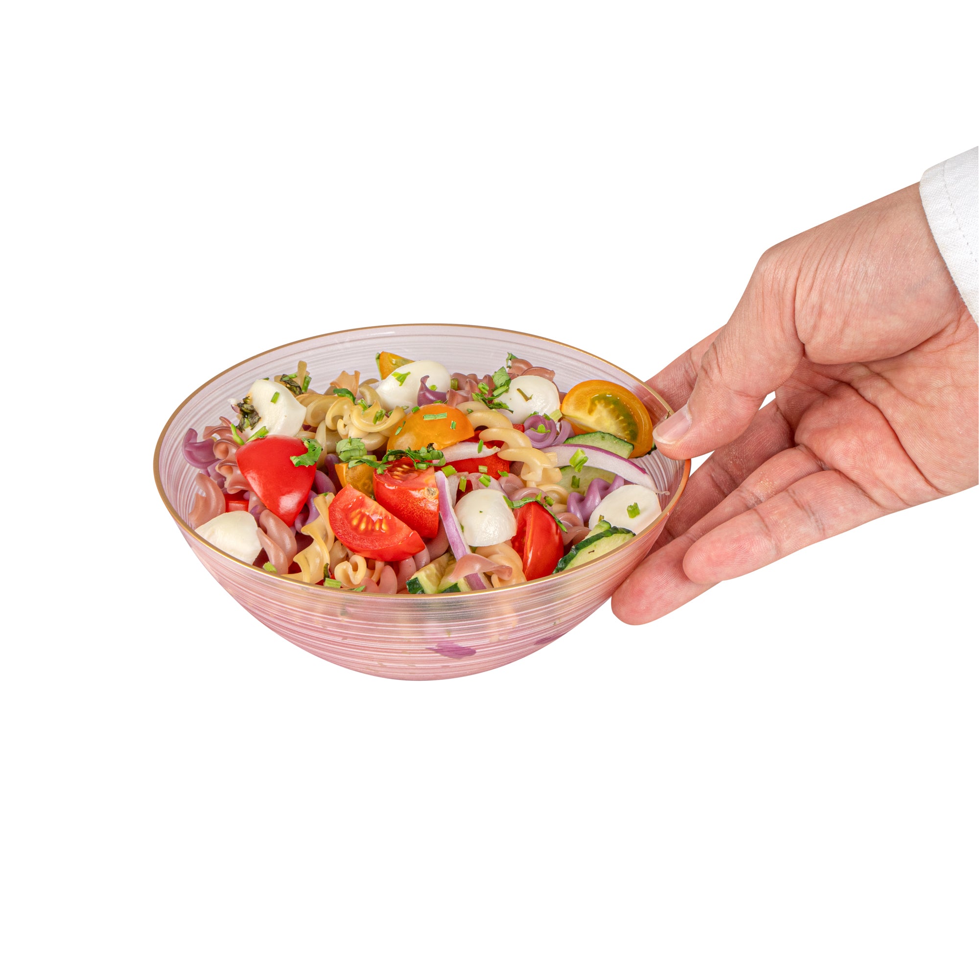 Ensure elegant presentations with effortless cleanup. Moderna Elegant Design Pink Plastic Disposable Serving Bowls feature a rippled design with a sophisticated gold rim, adding a touch of class to any table setting. Crafted from high-quality plastic, these disposable serving bowls offer durable construction that ensures sturdiness and reliability for catering events. The pink translucent material provides an attractive presentation for dishes, making these bowls ideal as plastic salad bowls for upscale dining. With a 16-ounce capacity and dimensions of 5.6 inches by 5.6 inches by 2.05 inches, they are versatile for serving salads, desserts, or appetizers at weddings and family gatherings. Their convenient disposable design reduces post-event cleanup time, making them perfect for busy catering services. Elevate your dining experience with these elegant plastic bowls, enhancing your event's ambiance. Each order includes 20 Moderna Elegant Design Pink Plastic Disposable Serving Bowls.