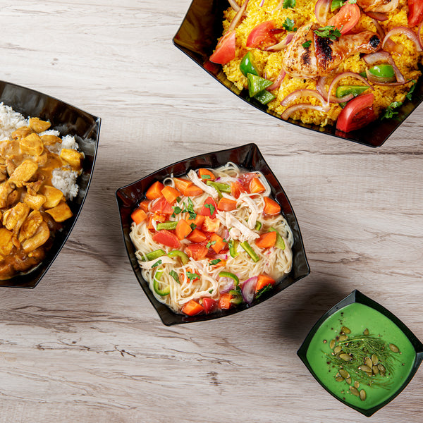 These plastic bowls, adorned with variety of designs, effortlessly elevate the presentation of your food. The addition of the intricate accent creates refined touch that can elevate the overall dining experience for any event!